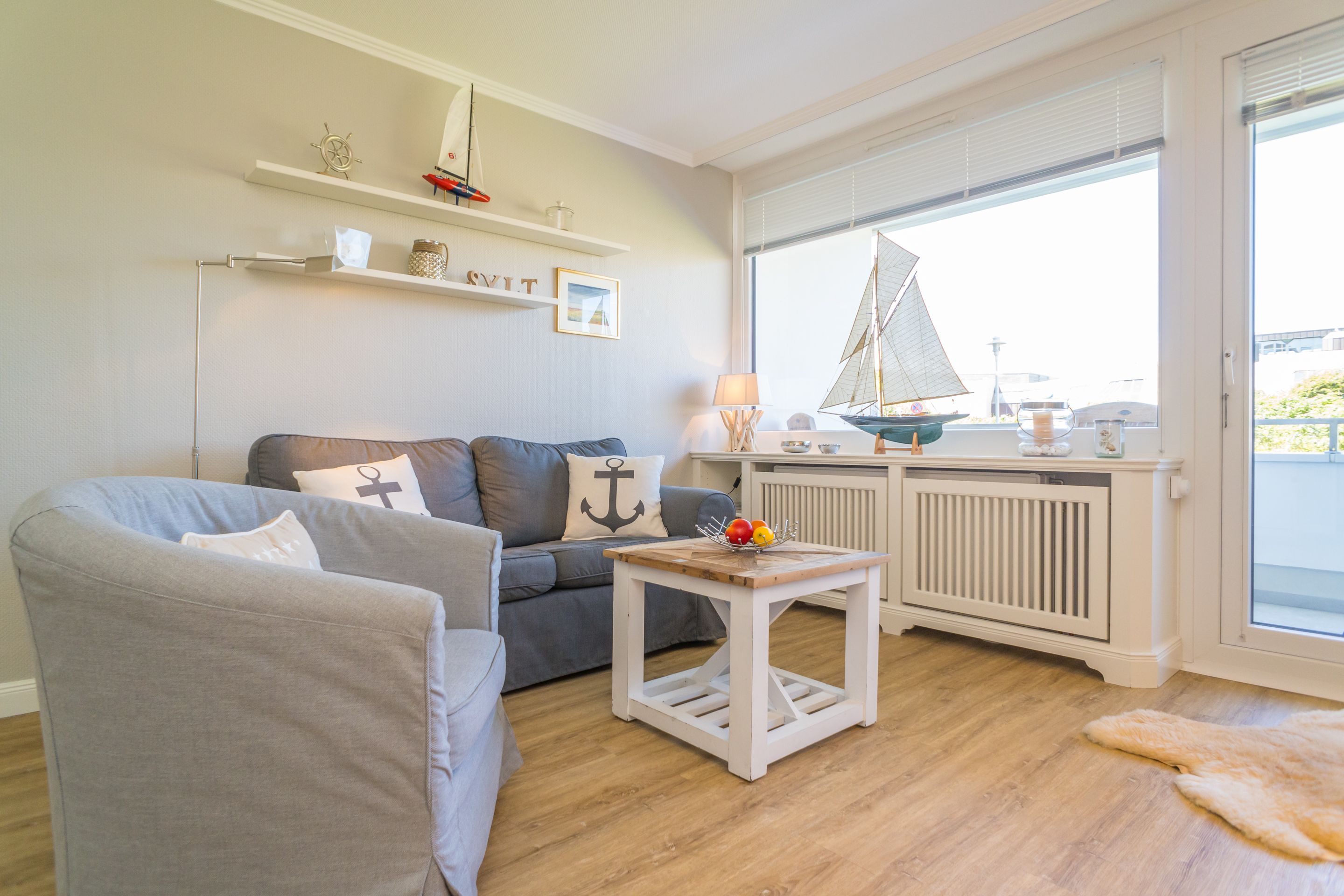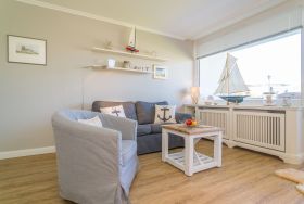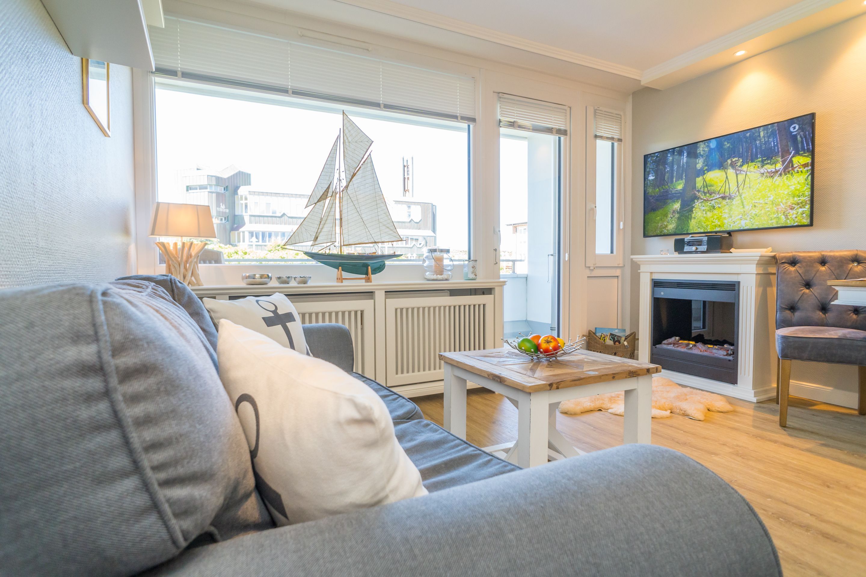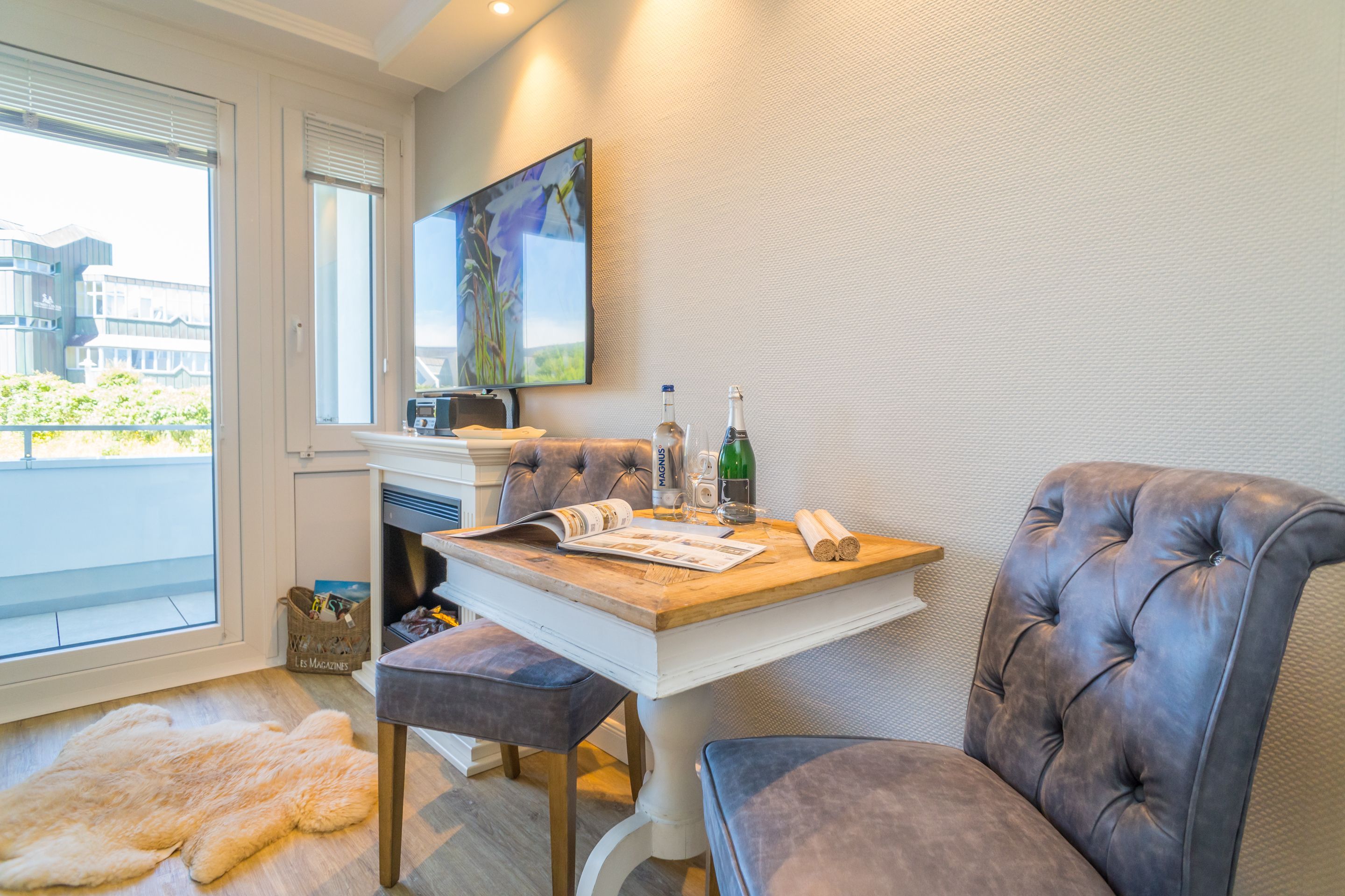 Das lichtdurchflutete, kombinierte Wohn-/Schlafzimmer mit edlem Designfußboden verfügt über einen großen Flat-TV. Ein gemütliches 2-er Sofa und ein Sessel versprechen Wohlfühlurlaub von Anfang an.