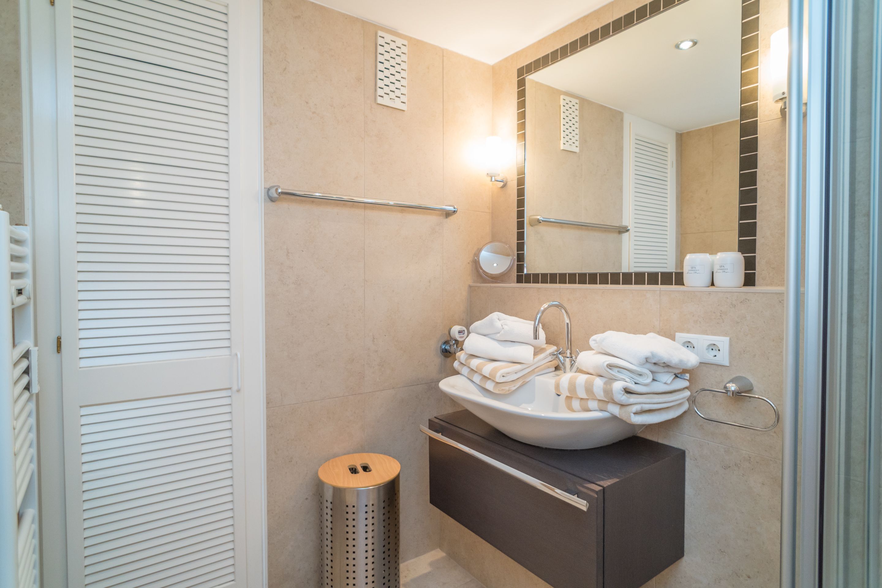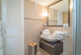 Das exklusive Bad mit großzügiger Dusche und edlem Waschtisch ist komplett in italienischem Naturstein gehalten.