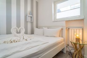 Das Schlafzimmer ist mit einem kleinen Doppelbett (1,40 m x 2,00 m, mit einseitigem Einstieg) ausgestattet.