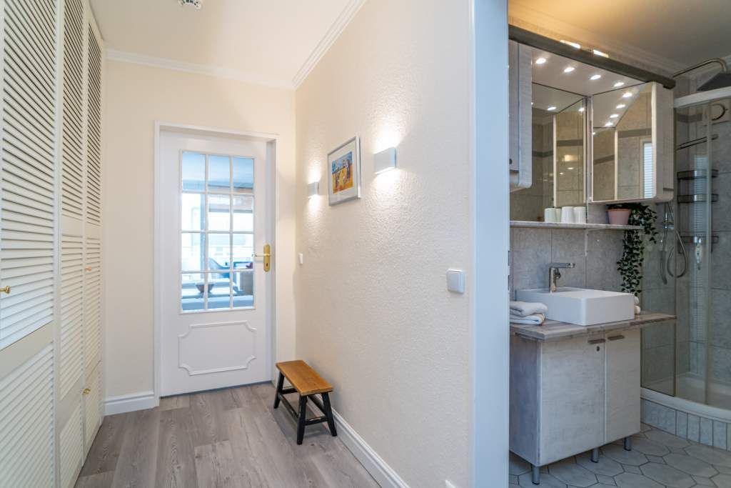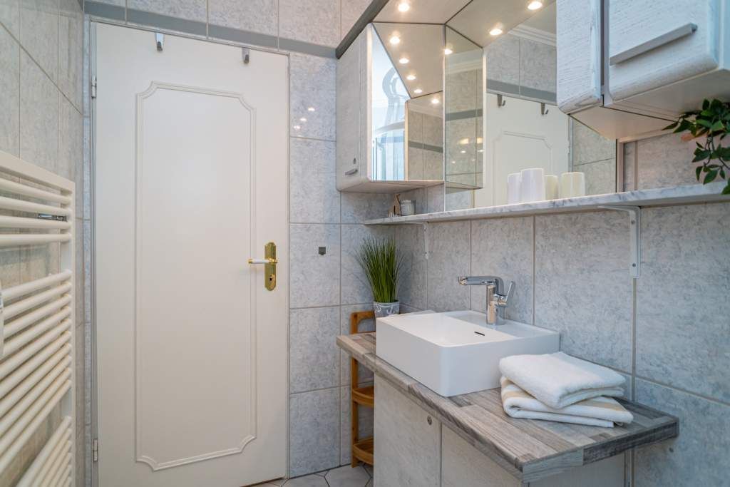 Im Bad befindet sich eine Dusche, ein WC und ein Waschtisch. Ein Fön ist vorhanden. Ein kleiner Tritt für die Kinder ist hier ebenfalls vorhanden.