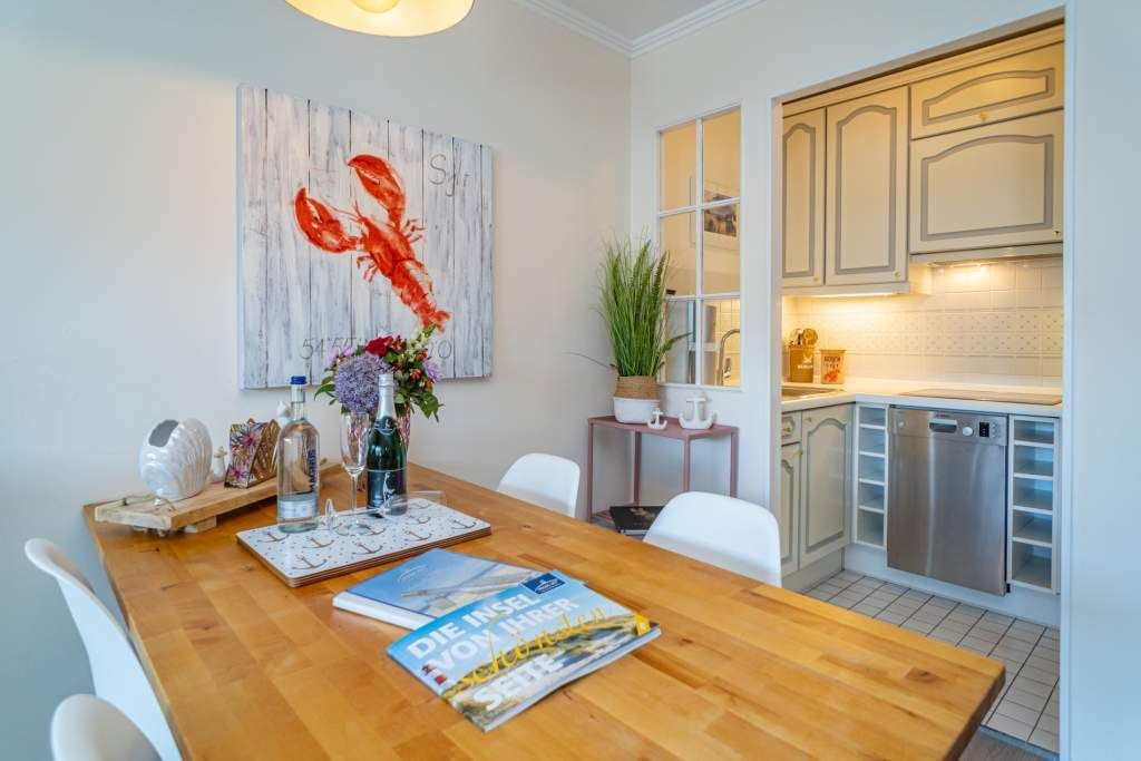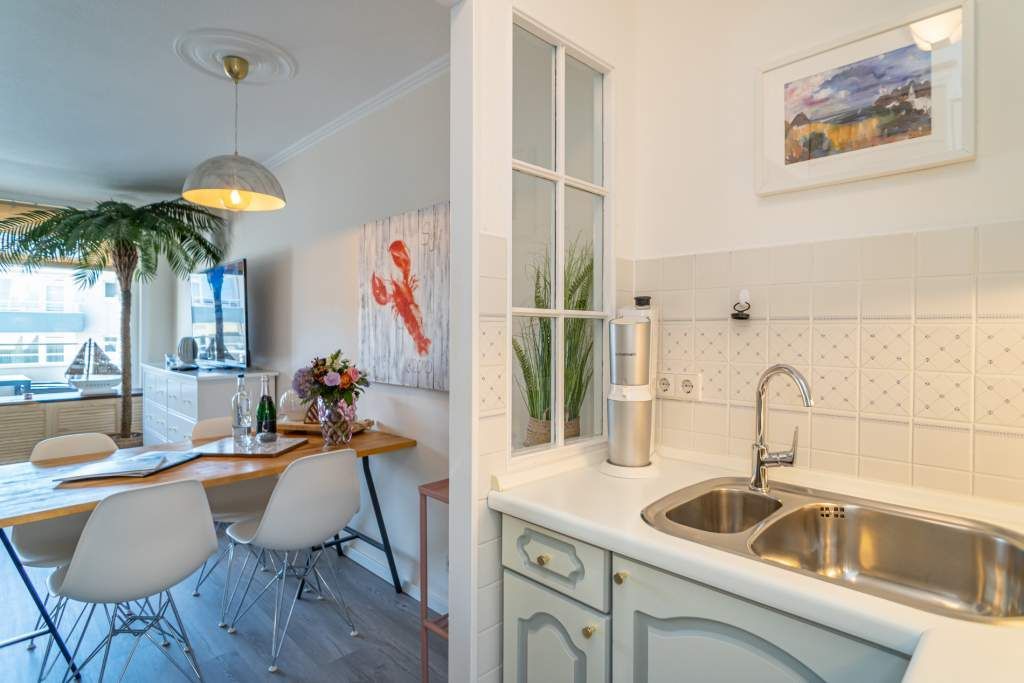 Die offene Küche hat einen Geschirrspüler, einen Induktionsherd, eine Mikrowelle/Backofen-Kombination, einen Kühlschrank, eine Nepresso-Maschine, sowie ein Handfilter aus Porzellan für Filterkaffee. Wasserkocher, Soda-Stream und Toaster gehören zur Grundausstattung. Selbst für die Kleinen ist Kindergeschirr und 2 TrippTrapp Kinderstühle sind vorhanden.