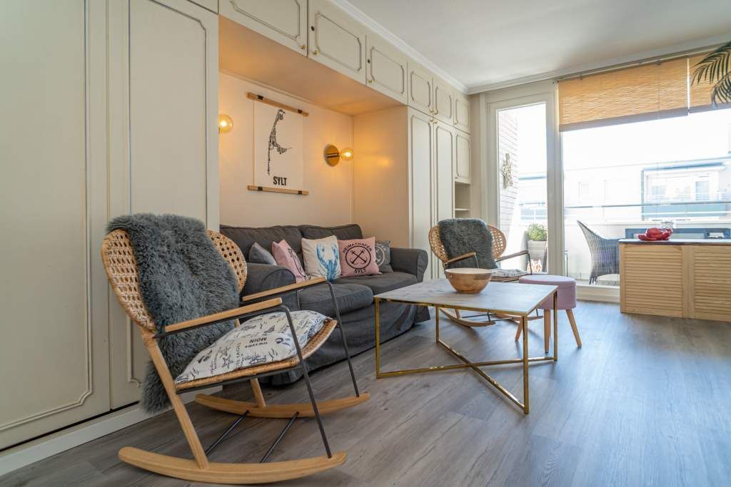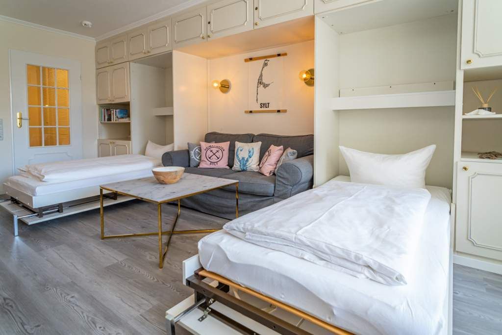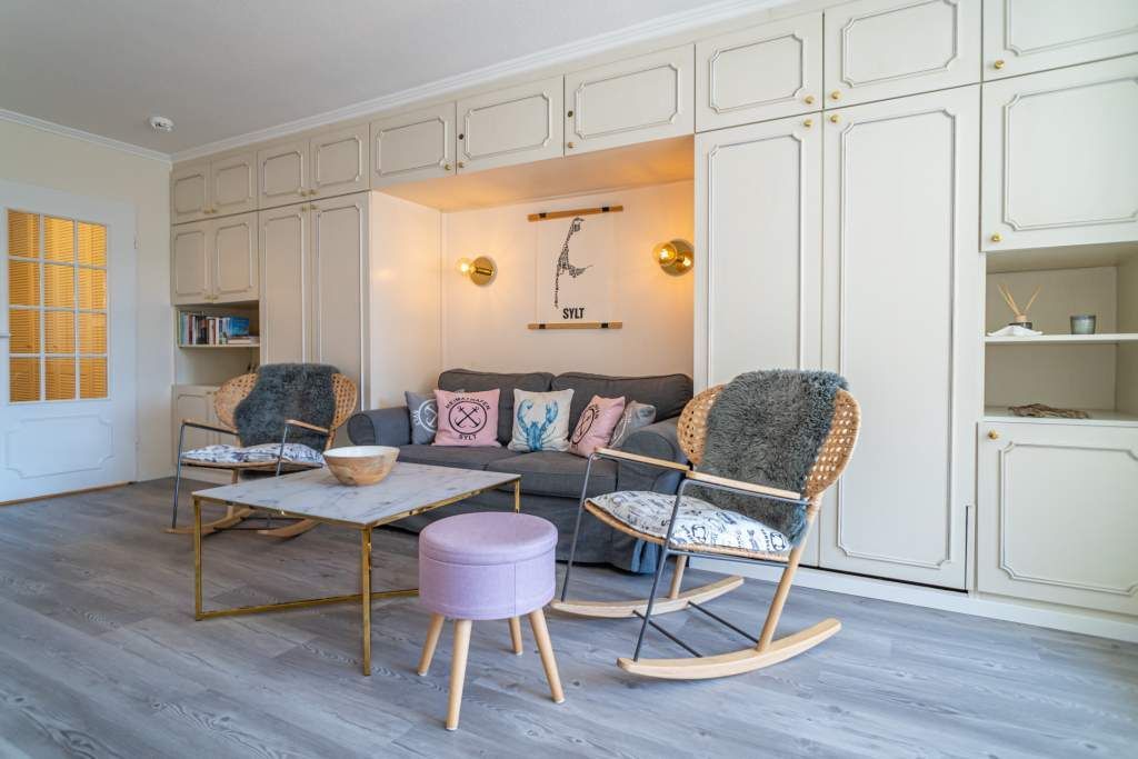 Der Wohnraum besteht aus einer 2-Sitzer-Couch, 2 Schaukelstühle, 2 Einzelschrankbetten (je 0,90 m x 1,90 m), Essplatz, Sat-Flachbild-TV.