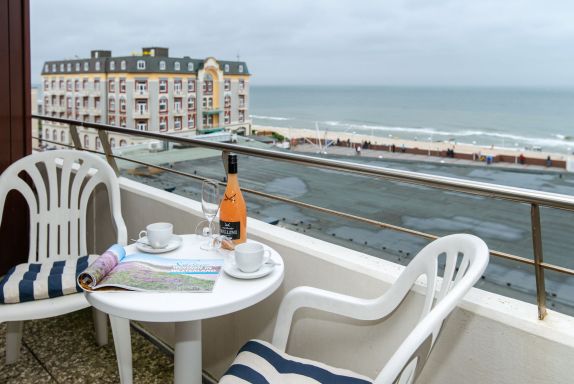 Angeboten wird Ihnen ein 1-Zimmer-Nichtraucher-Appartement (ca. 43 qm) in der 3. Etage mit Meerblick und Westloggia (Nachmittagssonne/Sonnenuntergang) für 2 Personen.