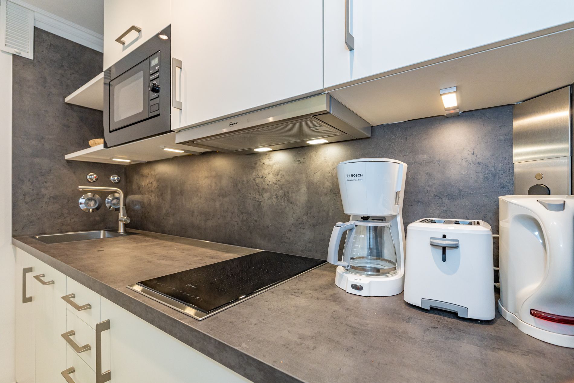 Die Küche hat eine Mikrowelle, ein Cerankochfeld, einen Geschirrspüler und einen Kühlschrank mit 3*-Gefrierfach. Kaffeemaschine, Wasserkocher und Toaster gehören zur Grundausstattung.