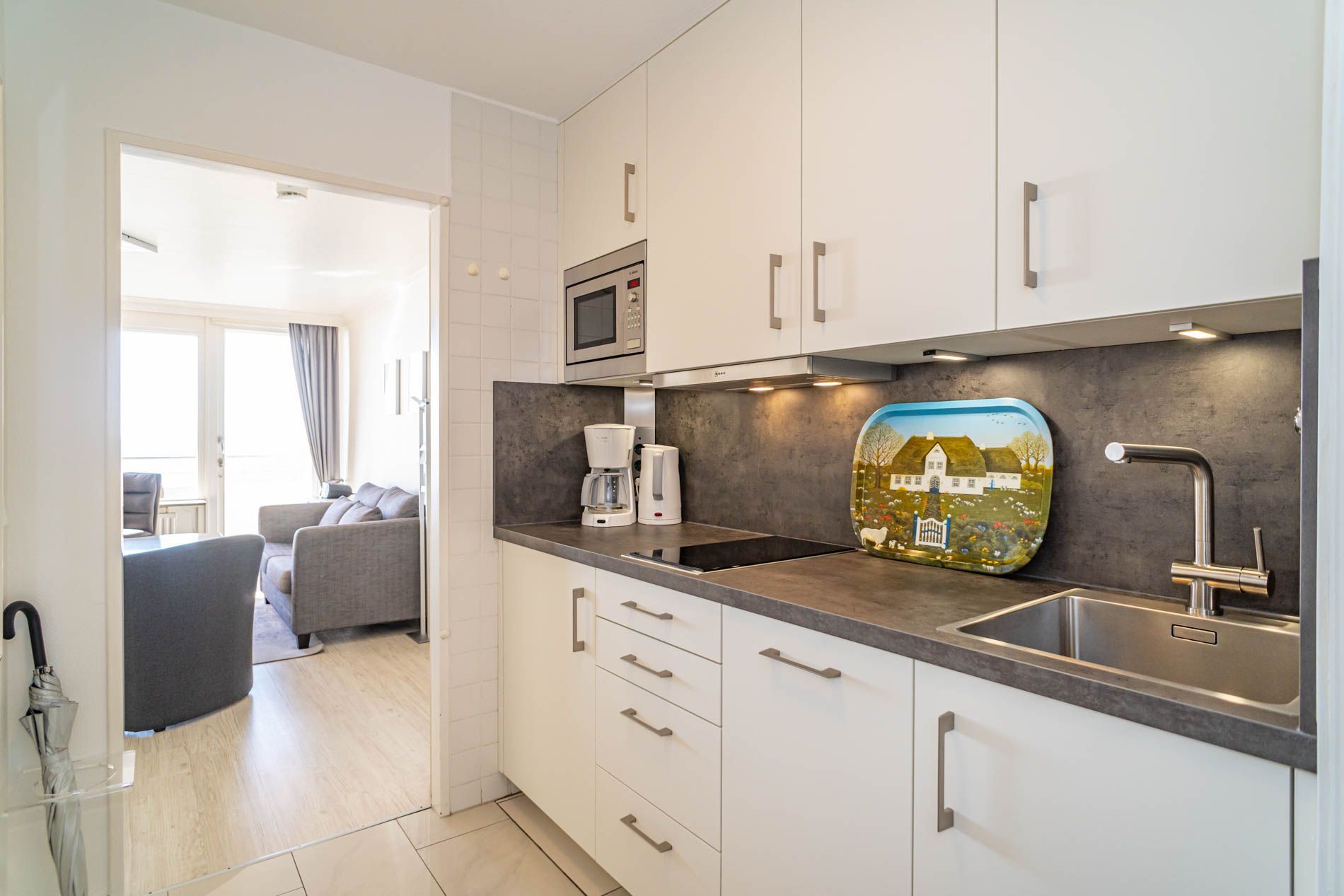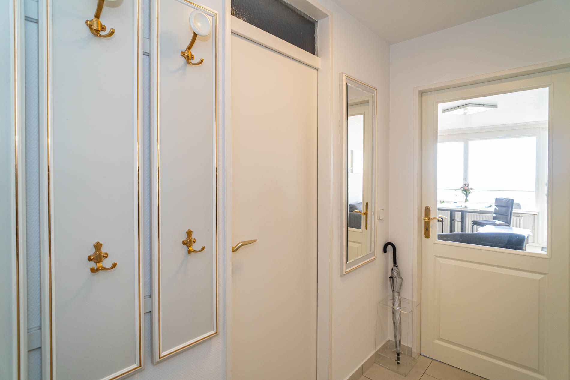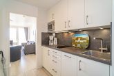 Vom Vorflur mit Garderobe und Küchenzeile gelangt man in das kombinierte Wohn-/Schlafzimmer (mit Zutritt zur Loggia und direktem Meerblick) und in das neue Duschbad/WC.