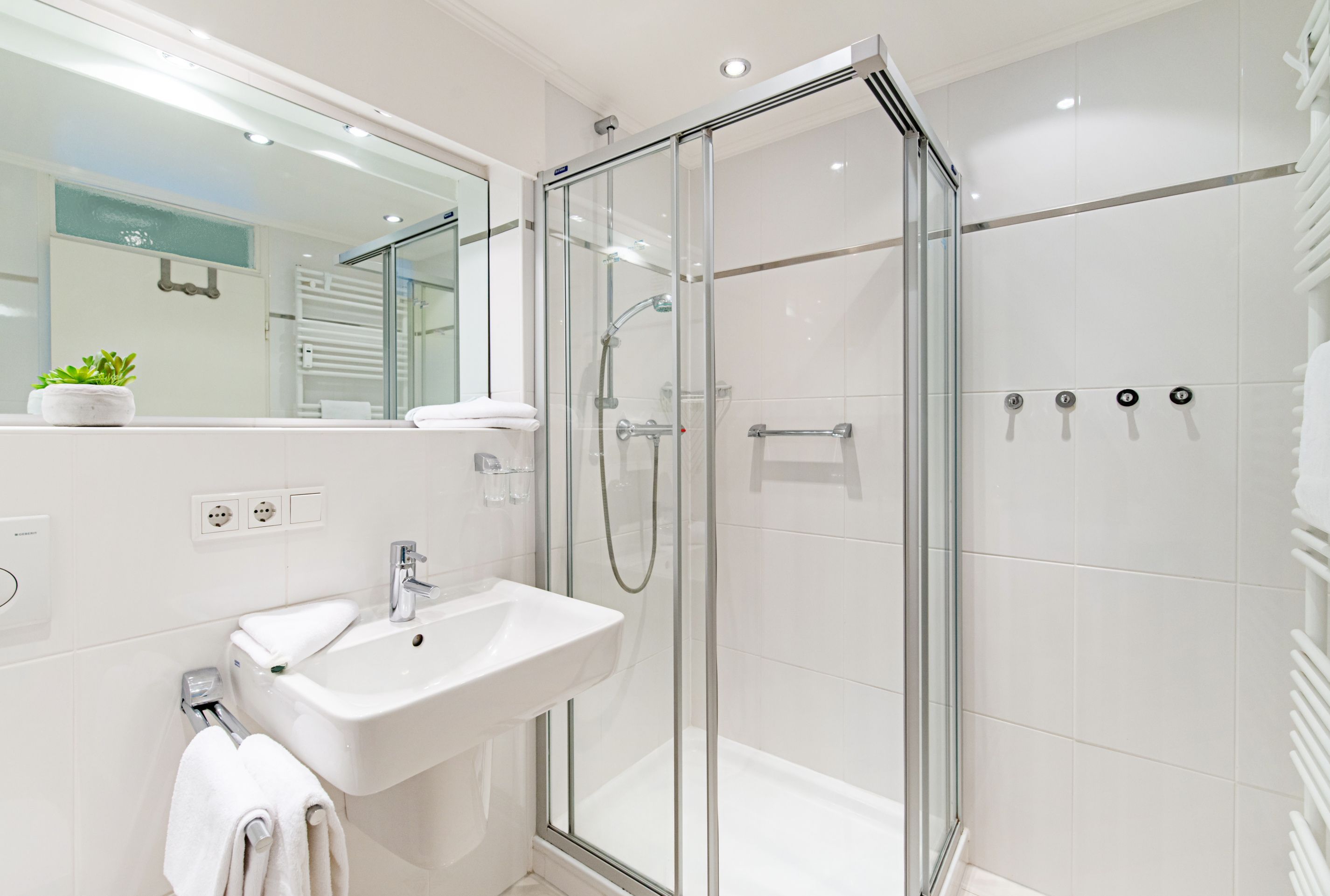 Das sehr moderne und helle Duschbad/WC hat zusätzlich einen Handtuchtrockner und einen Föhn.