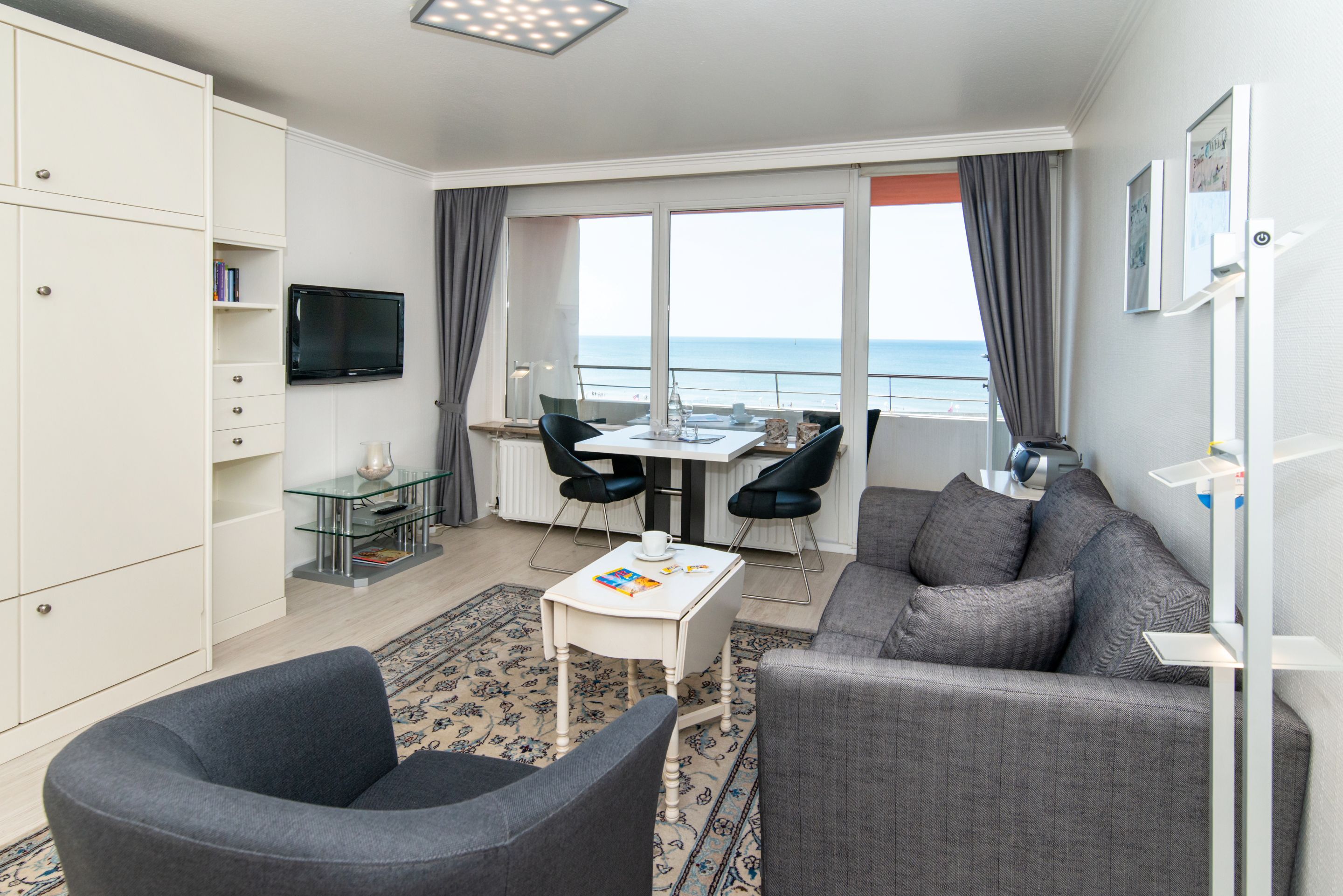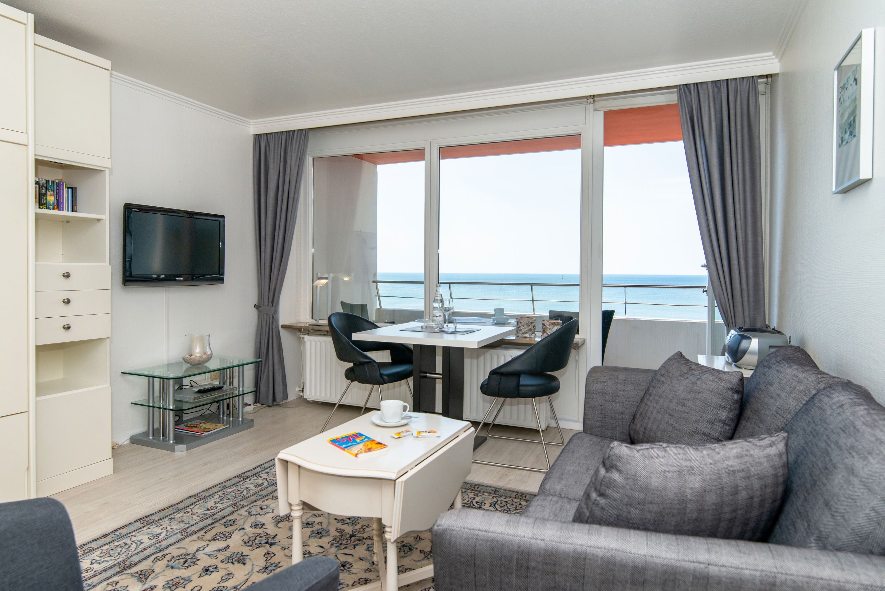 Angeboten wird Ihnen ein 1-Zimmer-Nichtraucher-Appartement (ca. 34 qm) in der 2. Etage mit traumhaftem Meerblick und Westloggia (Nachmittagssonne/Sonnenuntergang, inkl. Balkonmöbeln und Auflagen) für 2 Personen.
