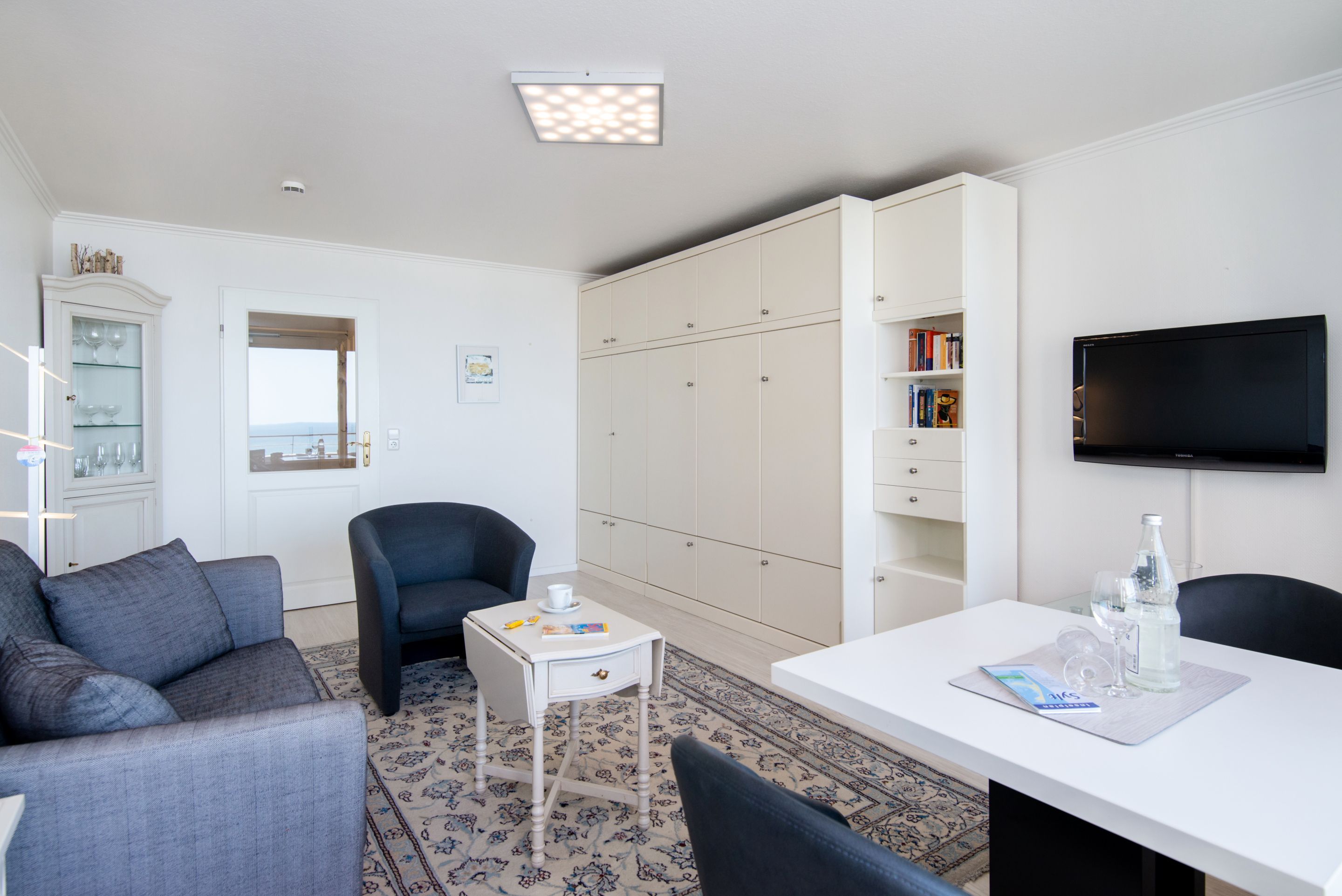 Der kombinierte Wohn-/Schlafraum besteht aus einer gemütlichen Sitzgarnitur (2-Sitzer-Couch), Doppelschrankbett, Essplatz, Kabel-Flachbild-TV, Radio/CD, DVD-Player.
