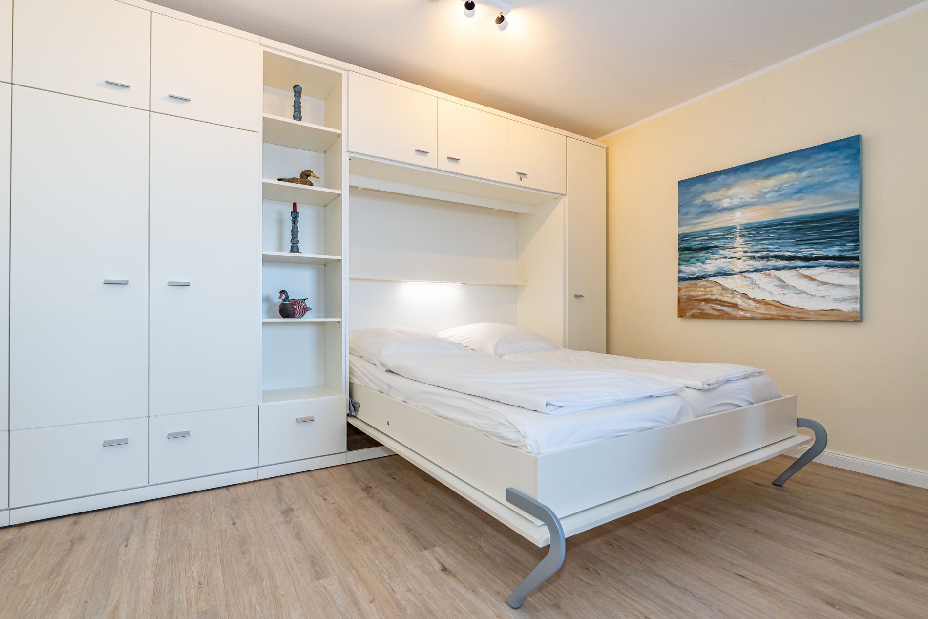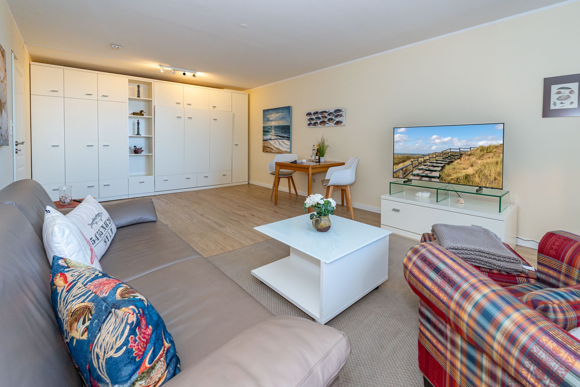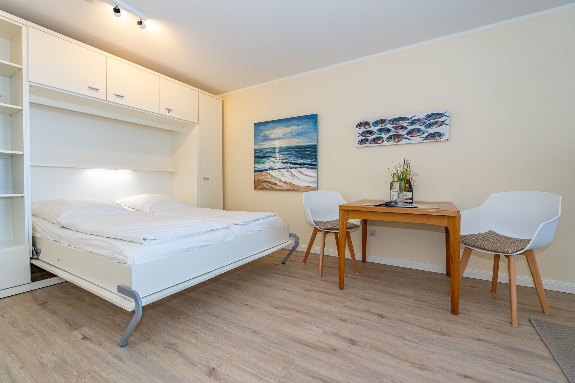 Der Wohn-/Schlafraum besteht aus einer gemütlichen Couchgarnitur (Schlafcouch, Liegefläche 1,60 x 1,90 m), einem Doppelschrankbett (Liegefläche 1,60 x 2m) , mit Einzelmatratzen, im Ganzen ausklappbar), einem Essplatz, Kabel-TV.