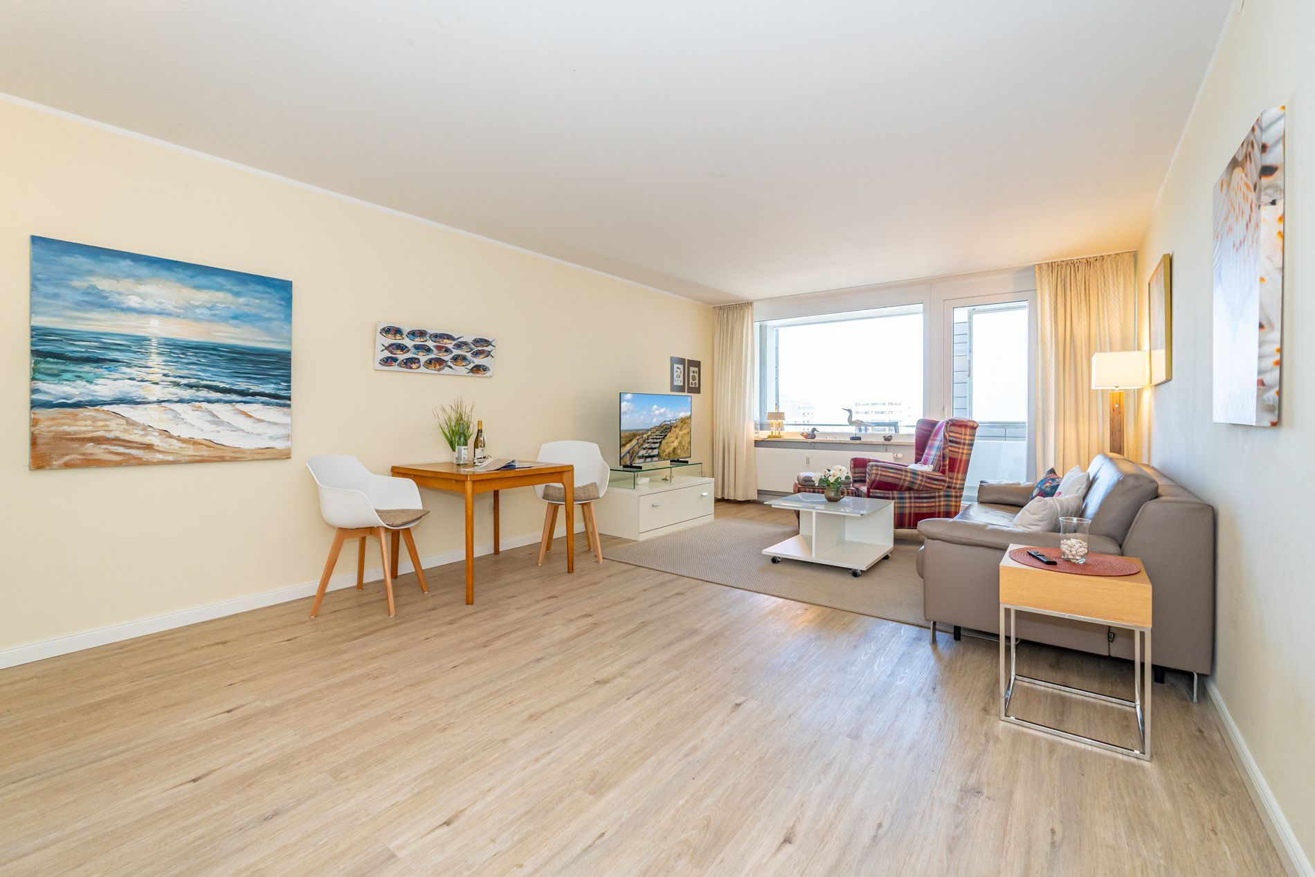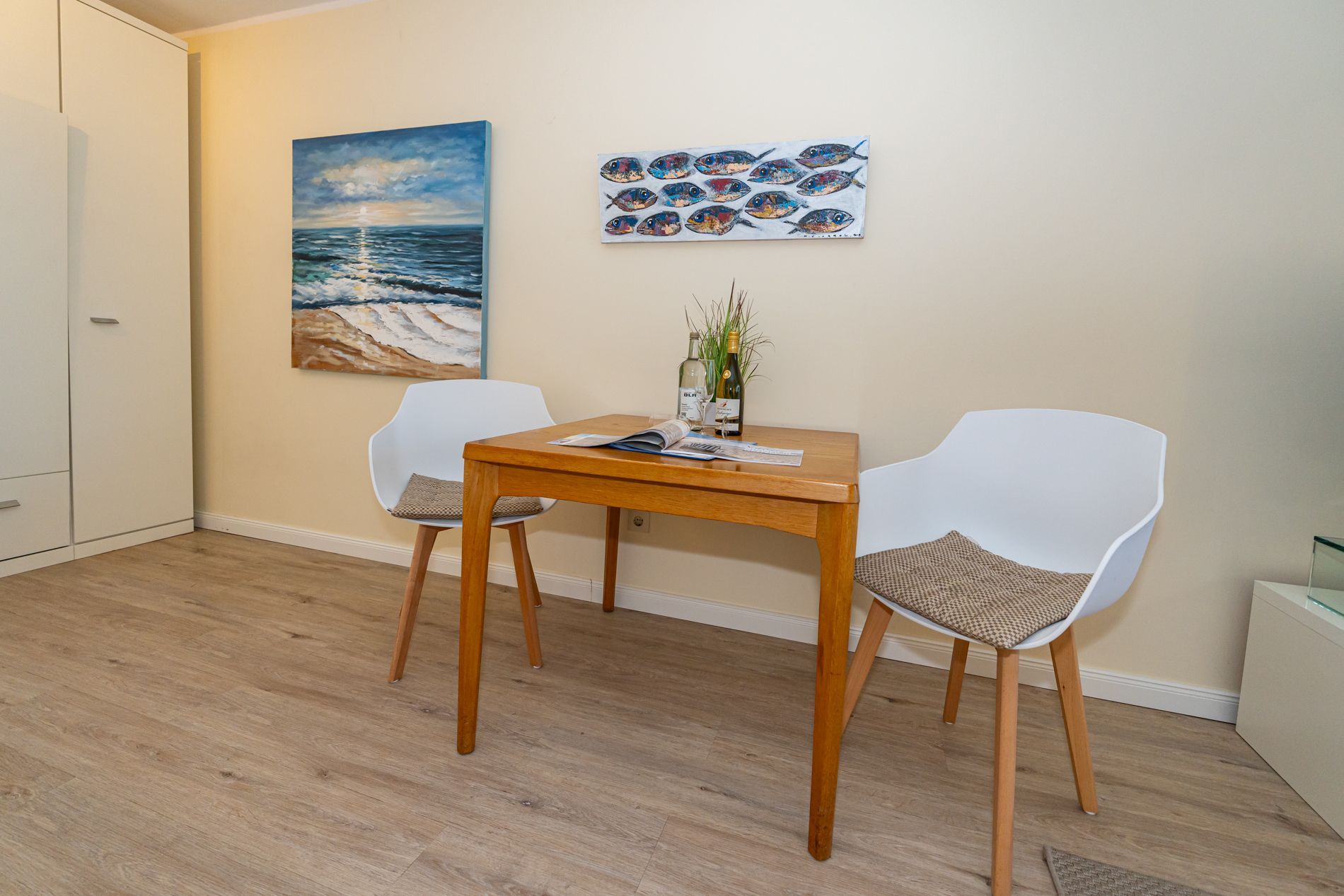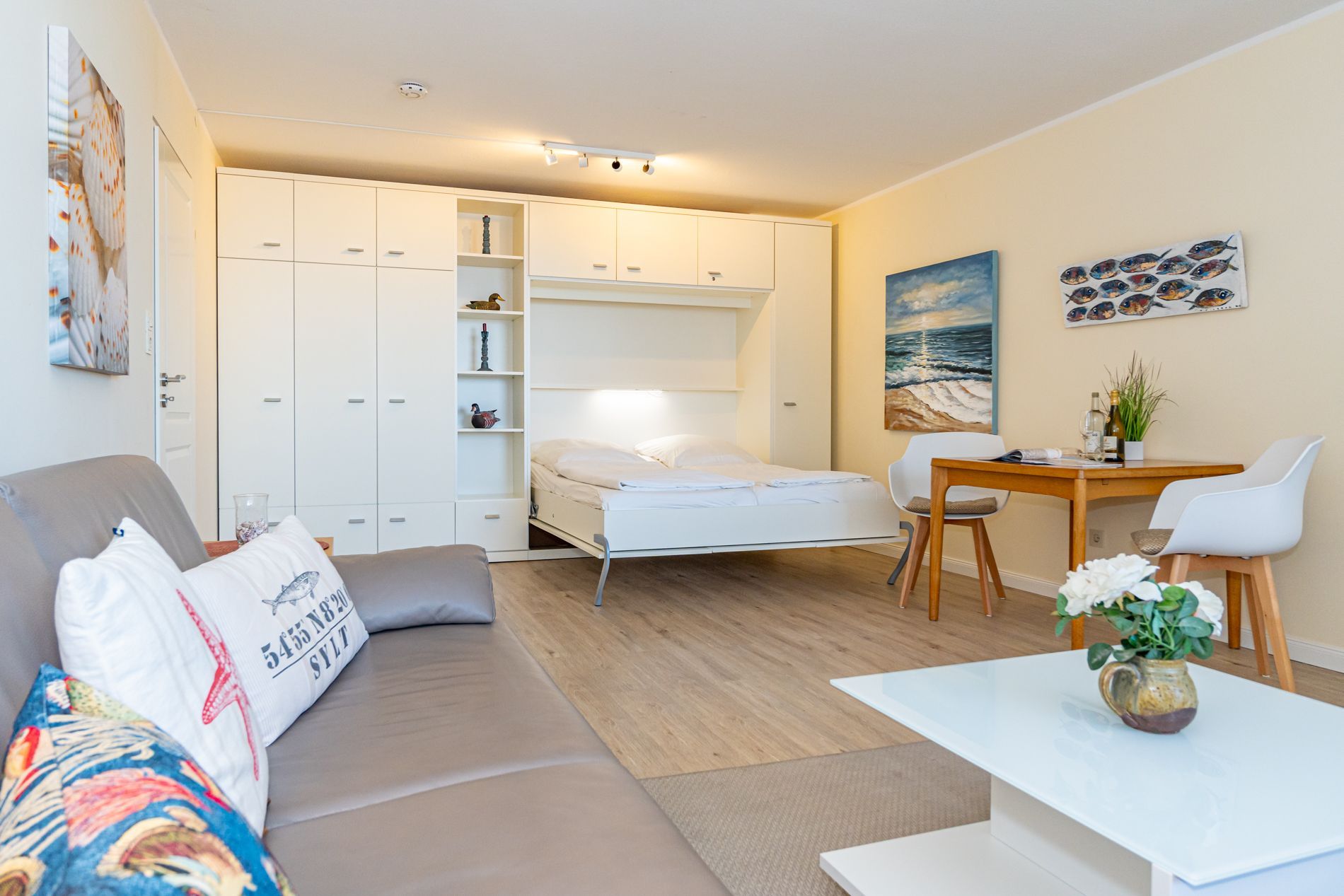 Der Wohn-/Schlafraum besteht aus einer gemütlichen Couchgarnitur (Schlafcouch, Liegefläche 1,60 x 1,90 m), einem Doppelschrankbett (Liegefläche 1,60 x 2m) , mit Einzelmatratzen, im Ganzen ausklappbar), einem Essplatz, Kabel-TV.