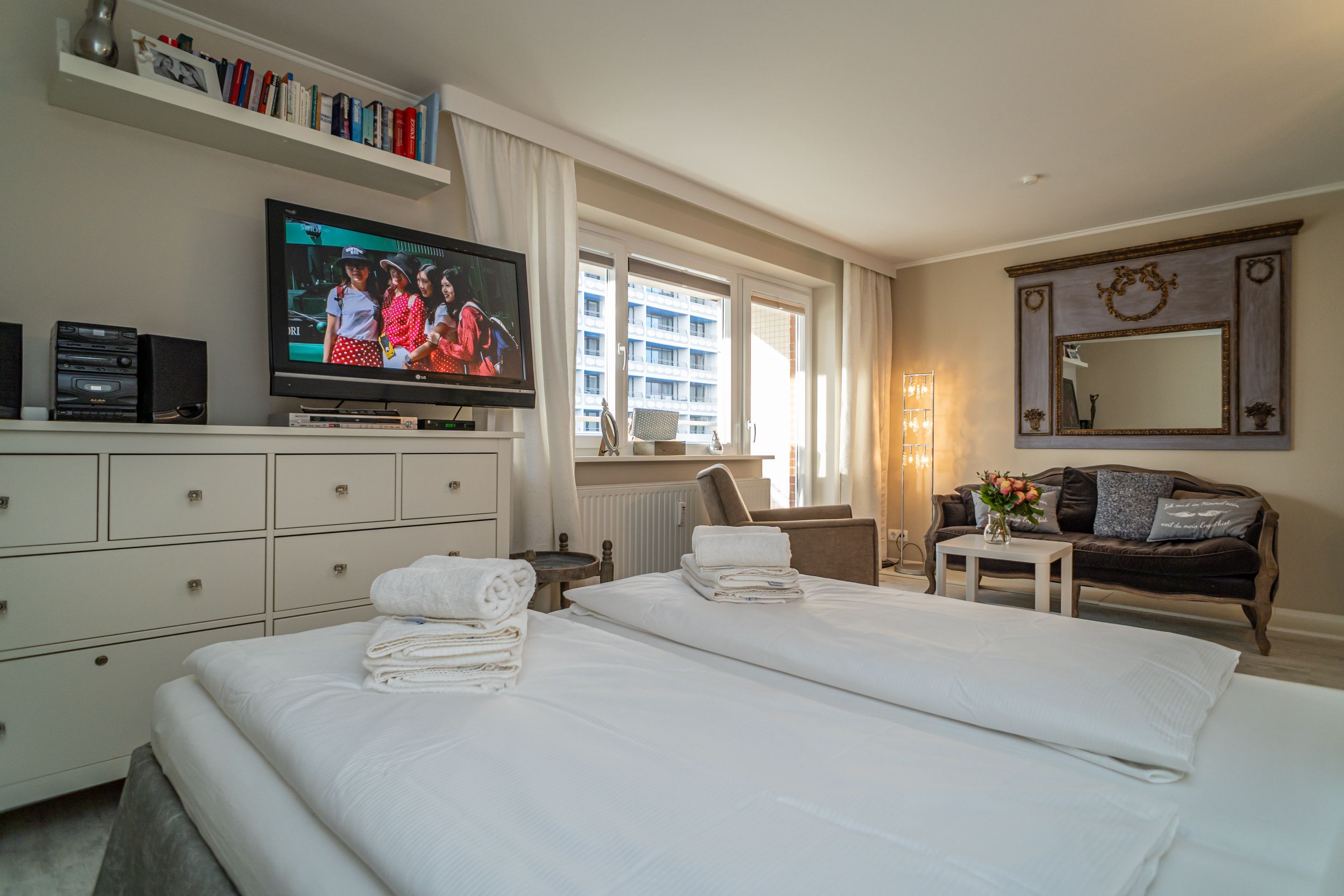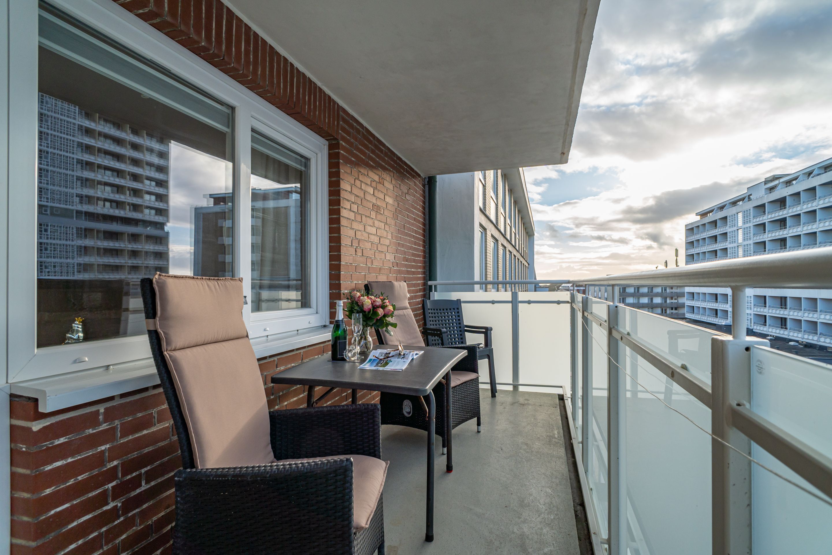 1-Zimmer-Nichtraucher-Ferienwohnung (ca. 32 qm) in der 5. Etage mit Westbalkon (Nachmittagssonne mit Balkonmöbeln) mit kleinem Meerblick, mitten drin und trotzdem ruhig.