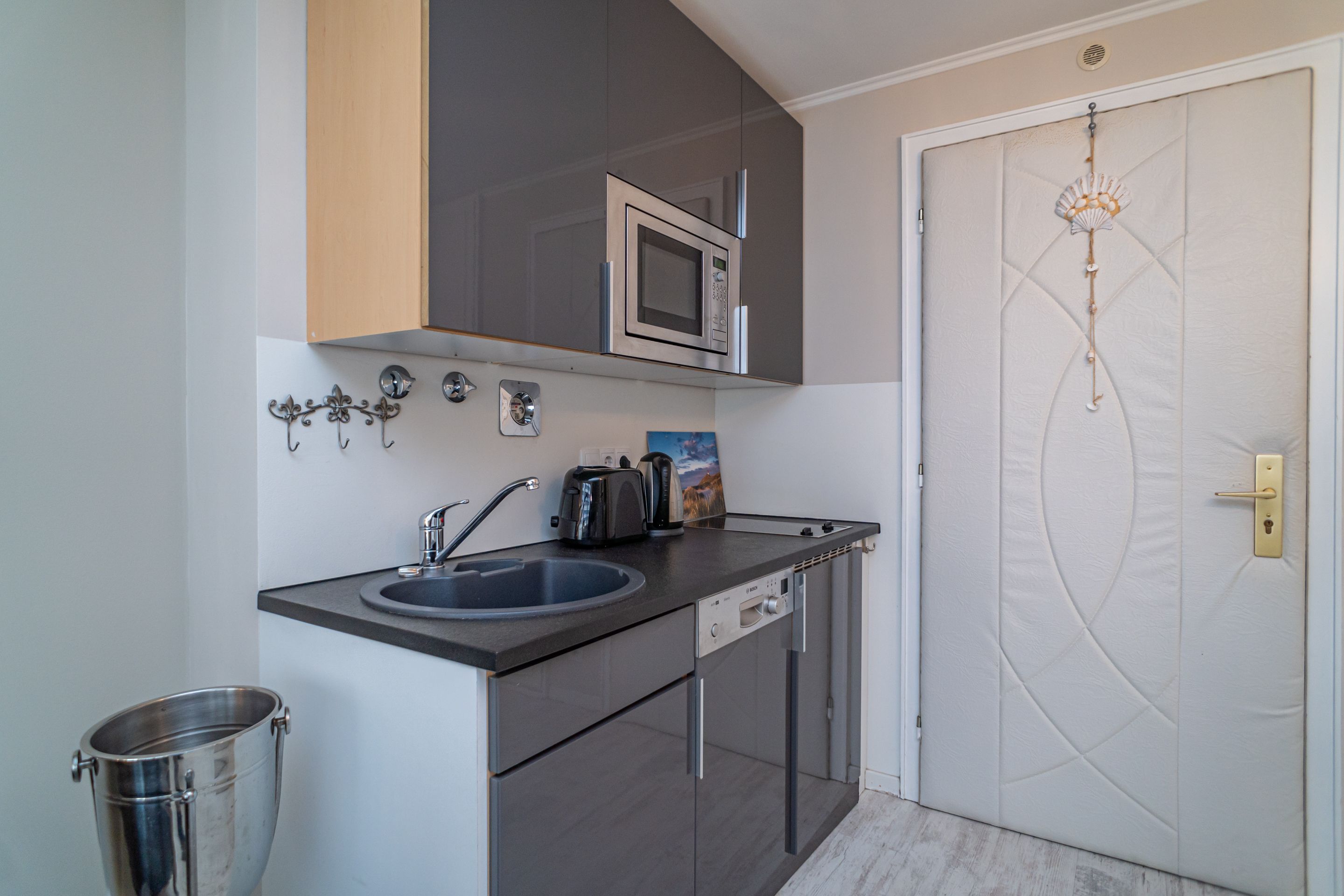 Die Küchenzeile hat einen Geschirrspüler, ein Ceranfeld (2 Kochfelder), eine Mikrowelle und einen Kühlschrank mit 3*-Gefrierfach. Kaffeemaschine, Wasserkocher und Toaster gehören zur Grundausstattung.