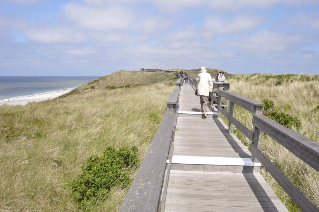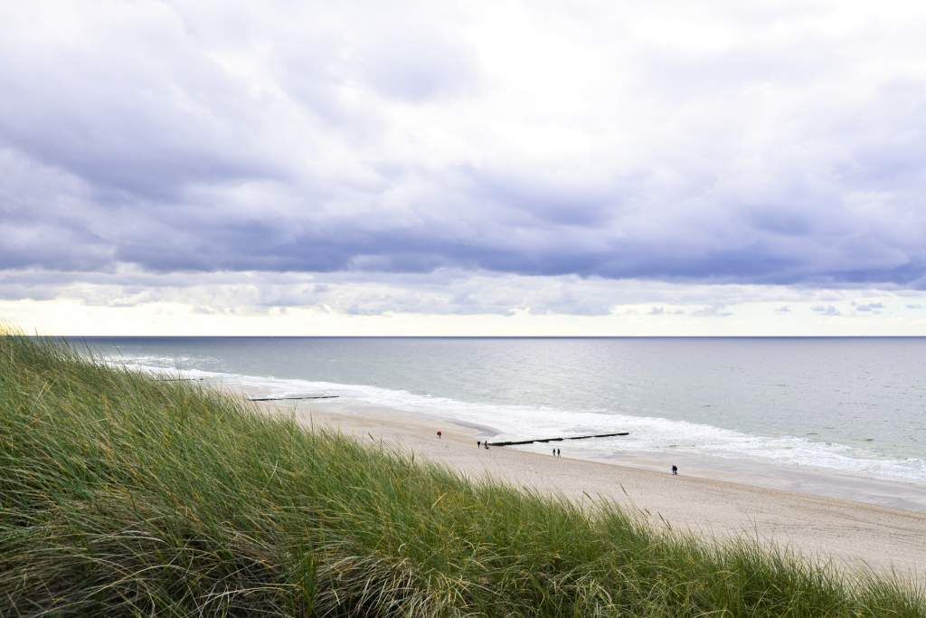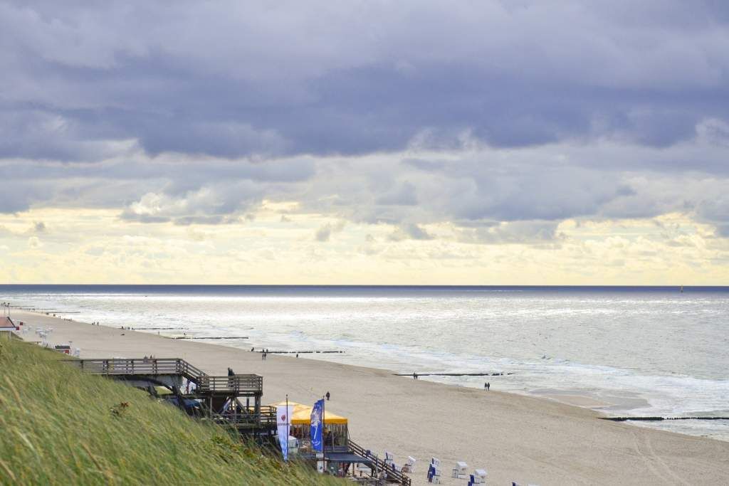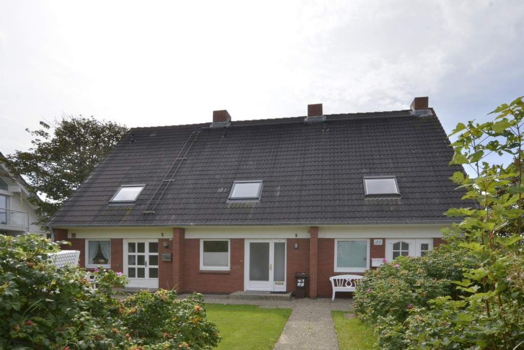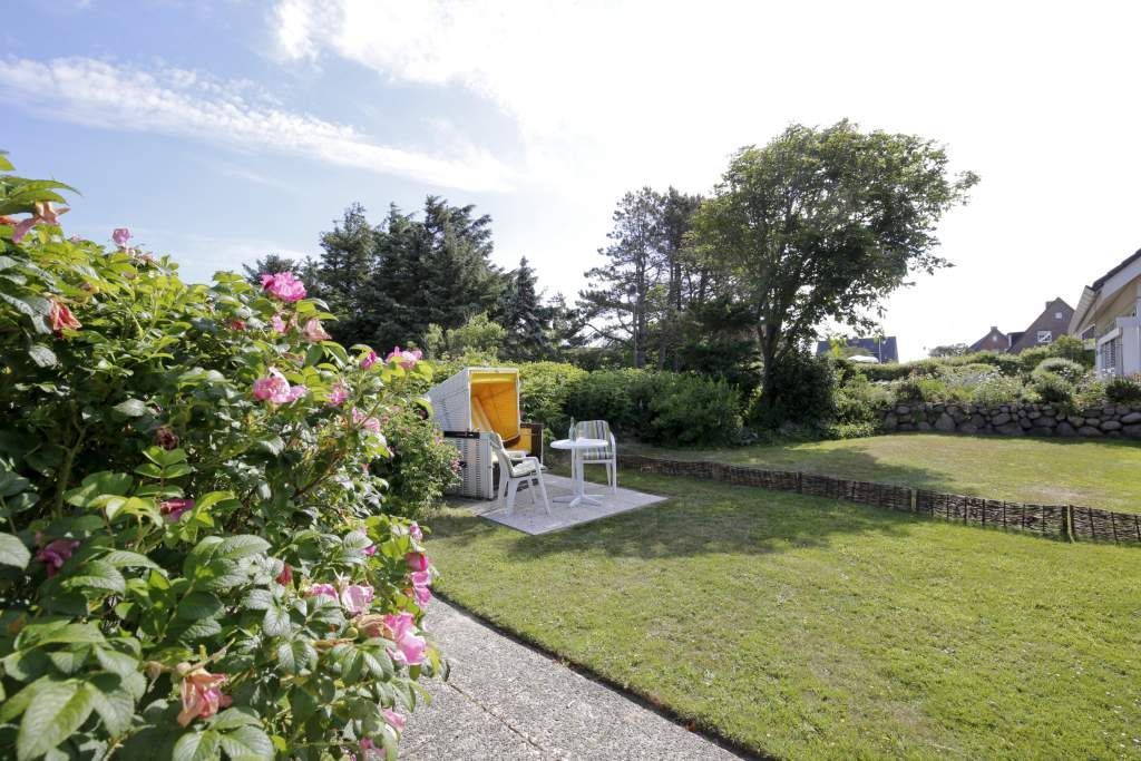 Die nach Süden ausgerichtete Terrasse mit eigenem kleinen Gartenanteil lädt mit Balkonmöbeln, Auflagen und einem Strandkorb zum Sonnenbaden, Frühstücken im Freien oder einfach zum Entspannen ein.