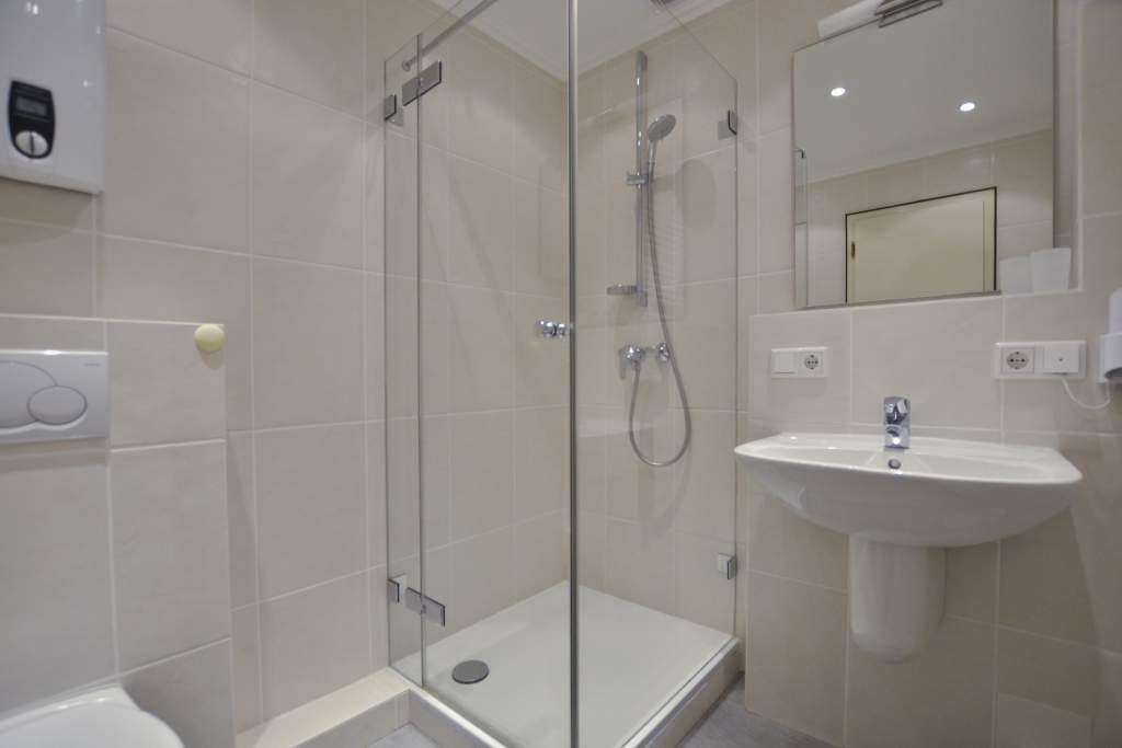 Das moderne Duschbad verfügt über eine ebenerdige Dusche, einen Handtuchtrockner sowie einen festinstallierten Fön hell, funktional und stilvoll gestaltet.