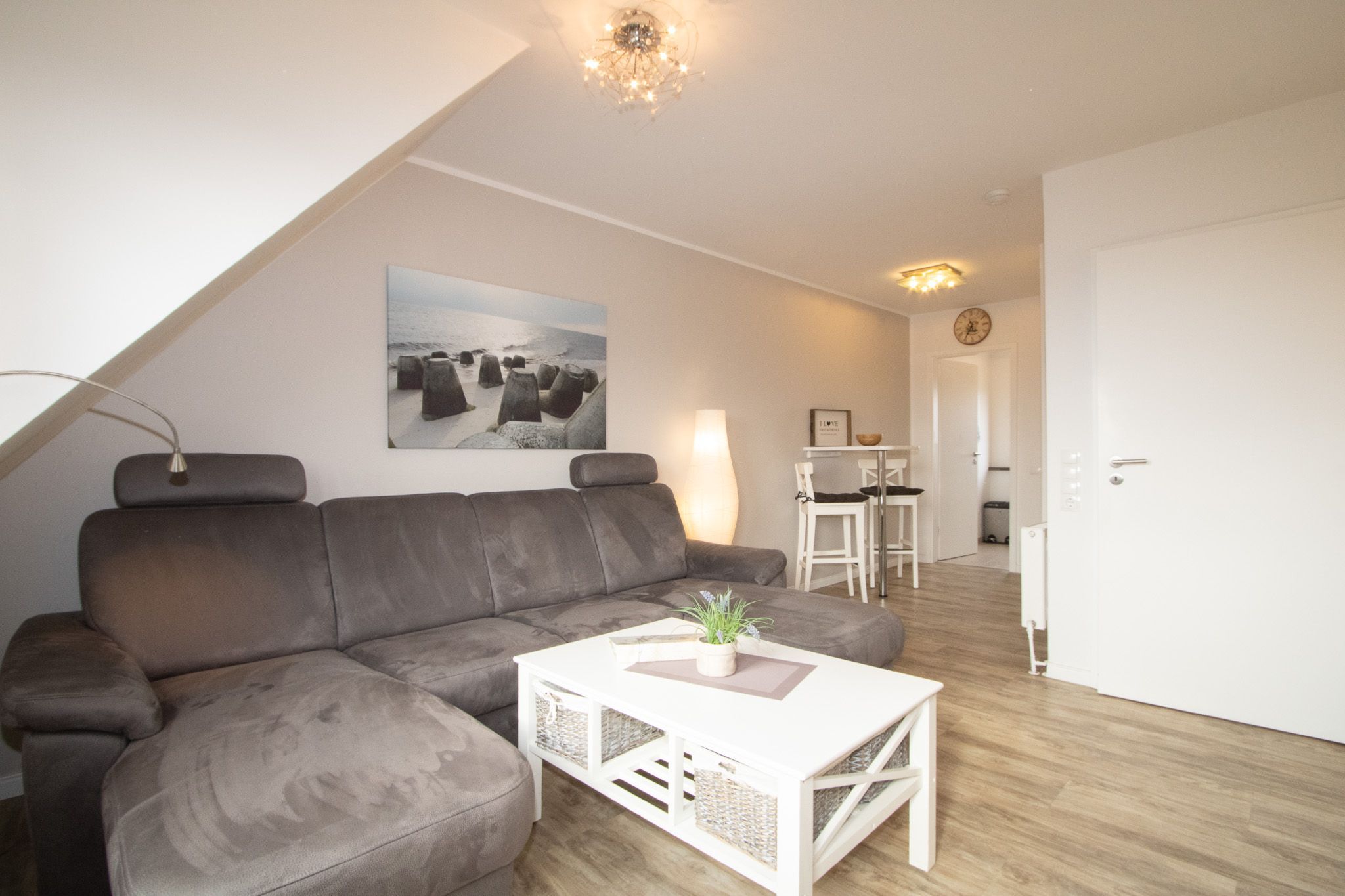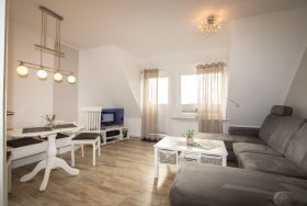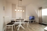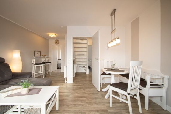 Modernes und großzügiges 2-Zimmer-Appartement über zwei Ebenen mit einem Duschbad und einer separaten voll ausgestatteten Küche. Im Wohnraum befinden sich eine Wohlfühlecke mit Flachbildschirm, eine HIFI-Anlage und W-Lan sowie ein wunderschöner Ausblick gen Süden über den Golfplatz und einer separaten Essecke. Im Schlafraum in der 2. Ebene befindet sich ein Doppelbett mit Einzelmatratzen. Bei Ihrer Anreise sind die Betten bereits bezogen, Handtücher sind ebenfalls vorhanden. Auch von dort können Sie den hervorragenden Blick gen Süden genießen.