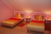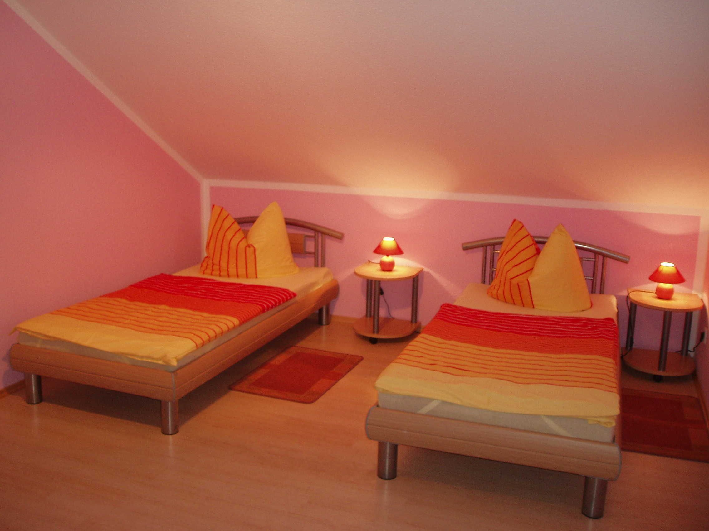Direkt unter dem Dachgeschoß befindet sich ein weiteres Zimmer, welches als Kinderzimmer oder als Schlafzimmer genutzt werden kann. Aufgrund der Nordlage des Zimmers, sind die Temperaturen auch im Sommer nicht zu hoch. Hier befinden sich zwei Einzelbetten, welche sich aber auch als Doppelbett zusammen schieben lassen. Zusätzlich ist noch Platz für ein vorhandenes Kinderreisebett. Für eine gute Lüftung ist durch zwei Fenster gesorgt. Auch dieser Raum ist mit PVC-Belag ausgelegt.
