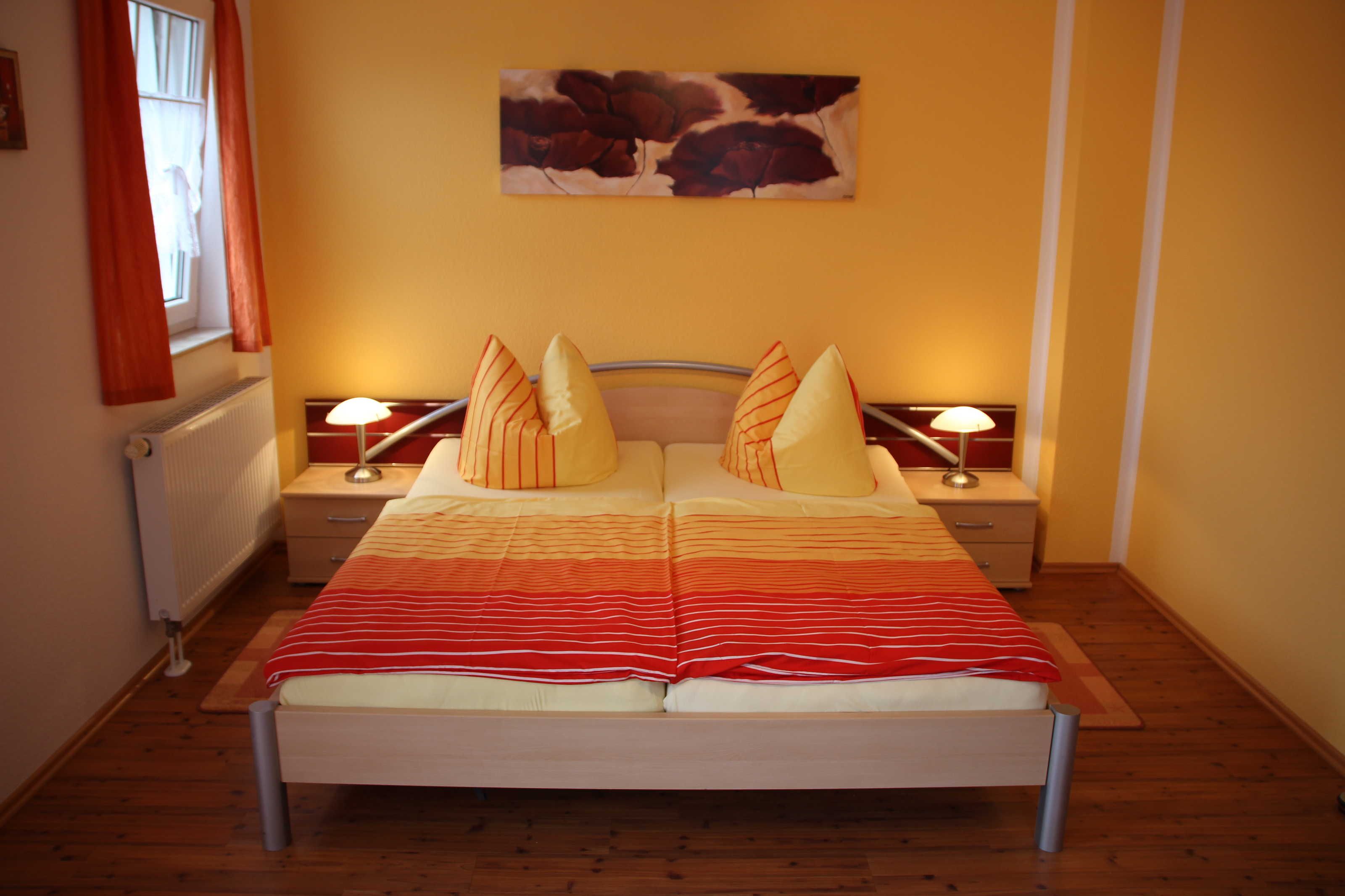 Das Schlafzimmer, welches sich über 18m² erstreckt, ist mit einem großen Doppelbett und einem großen Kleiderschrank ausgestattet. Der Fußboden ist allergiefreundlich mit PVC-Belag (Laminatimitation) ausgelegt.