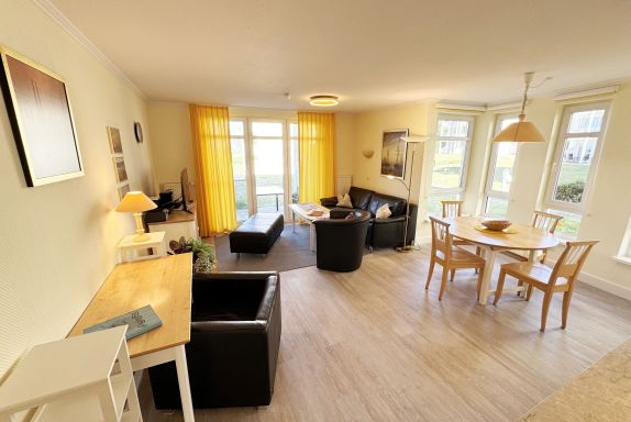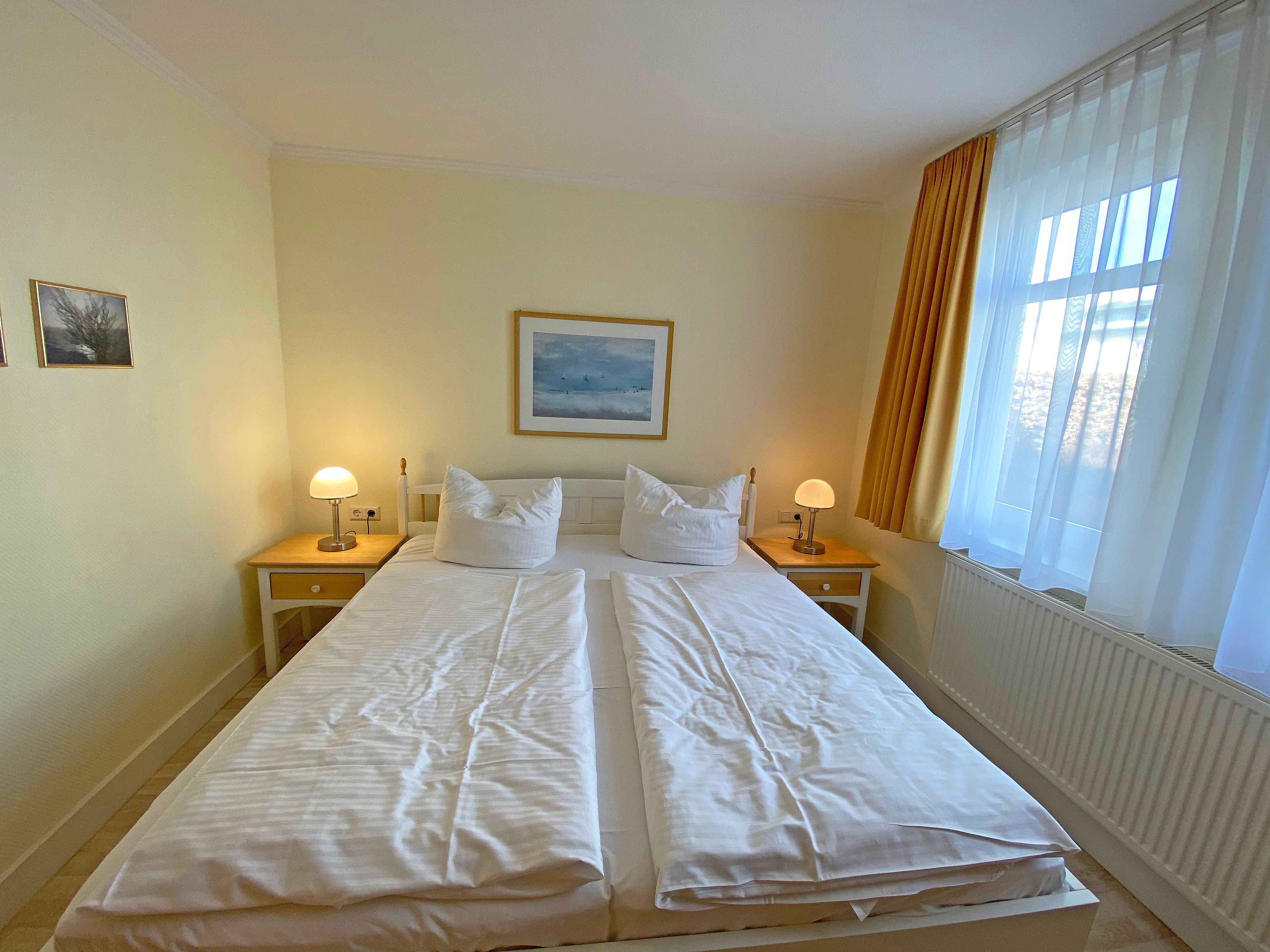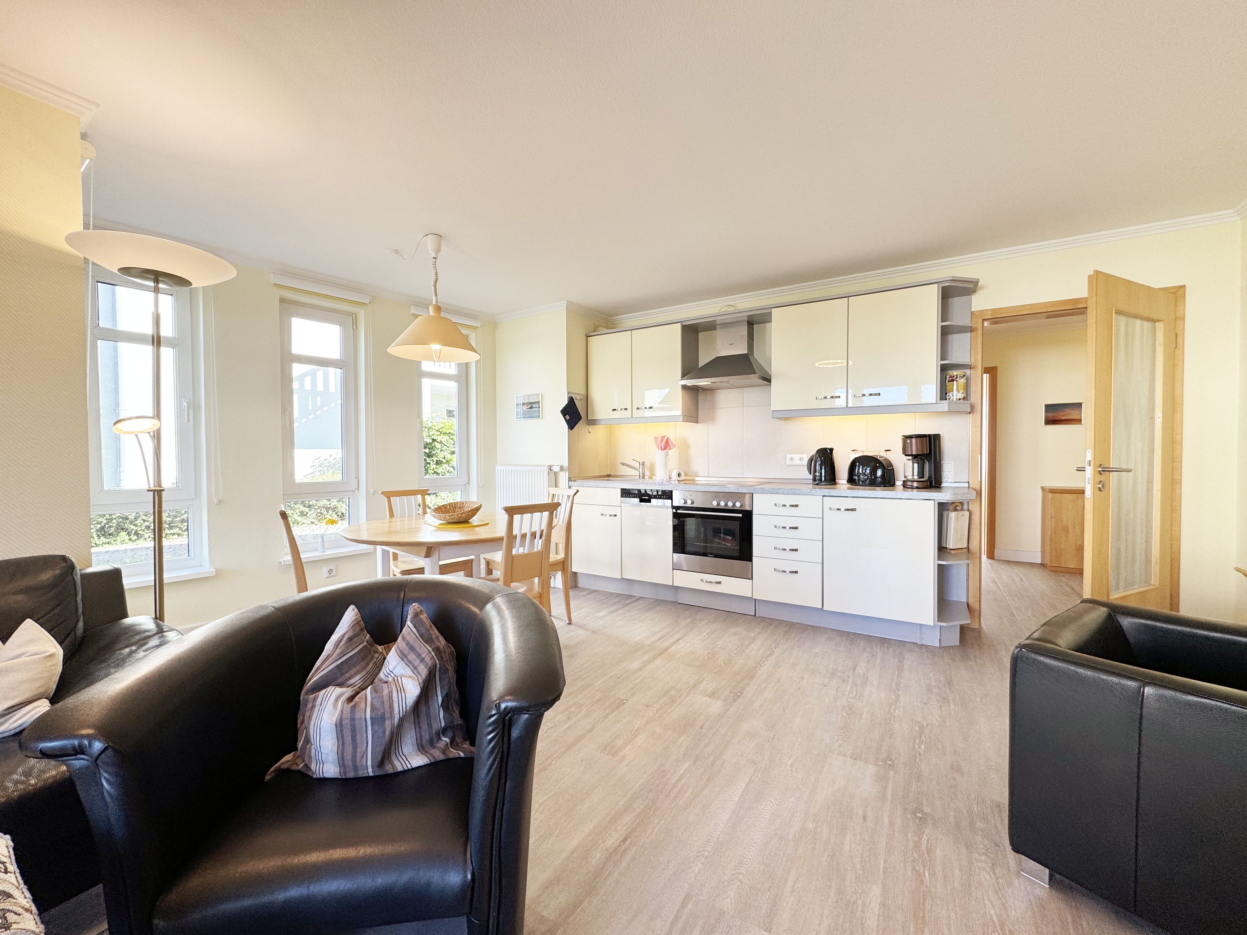 Unsere komfortable Nichtraucherwohnung von ca. 60 qm für 2 bis max. 4 Erwachsene und 1 Kleinkind bis 3 Jahre im Kinderreisebett verfügt über ein Schlafzimmer mit Doppelbett (1,80m x 2,00m), Nachttischkonsolen und Kleiderschrank sowie ein zweites Schlafzimmer mit 2 Einzelbetten (2 x 0,90 m x 2,00 m) und einen weiteren Kleiderschrank. Der Wohnbereich ist mit einem 2-Sitzer, Sessel, Leselampe, TV-Board, Smart-TV, Blu-Ray-Player und Ministereoanlage mit DAB-Radio eingerichtet. Von hier aus gelangen Sie auf die bestuhlte Terrasse und genießen den einmaligen Blick auf die Ostsee. Das Bad ist mit einer Dusche, WC, Waschmaschine mit Trocknerfunktion und Fön ausgestattet. Die Küchenzeile bietet einen Esstisch und 4 Stühlen, Geschirrspüler, Kühlschrank mit Eisfach, 4-Zonen-Ceranfeld mit Backofen, Toaster, Kaffeemaschine, Wasserkocher und diverse Küchenutensilien. Insektenschutzgitter sind vorhanden. WLAN ist für Sie inklusive nutzbar!! Ein PKW-Stellplatz (Nr. 03) sowie eine Unterstellmöglichkeit für Ihre Fahrräder ist am Haus vorhanden. Kinderreisebett (ohne Matratze und Bett Inlett) und Hochstuhl können für unsere kleinen Gäste gegen eine Gebühr gestellt werden. In der Wohnung sind keine Haustiere erlaubt! Die Erstausstattung eines Wäschepaketes (komplette Bettwäsche, 1 Duschhandtuch, 1 kleines Handtuch) können Sie bis 14 Tage vor der Anreise gegen einen Aufpreis dazu buchen oder durch eigene ergänzen. Ab 2 gebuchten Paketen erhalten Sie einmalig 1 Geschirrtuch und einen Duschvorleger dazu.