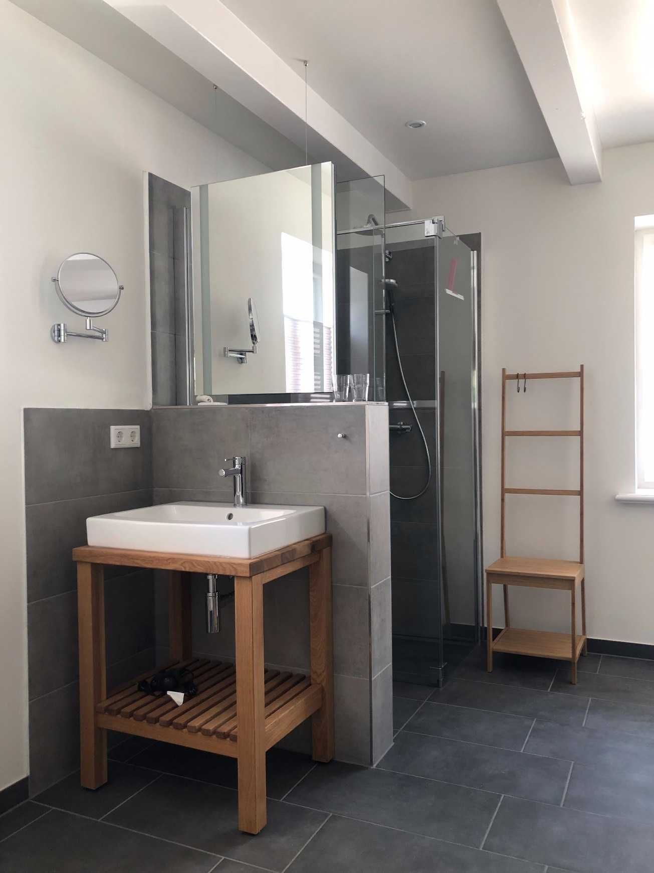 Sanitär: Bademantel, bodenebene Dusche, Föhn, Handtuchheizkörper, Schminkspiegel, Walk-In Dusche.