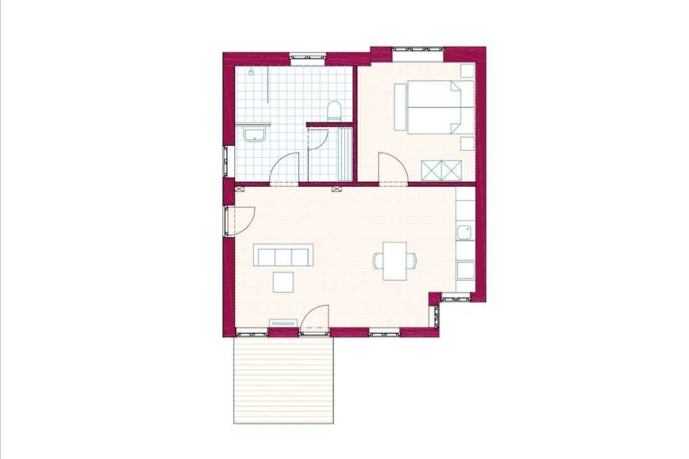 Raumaufteilung: 1 Schlafraum (1 Doppelbett), 1 Wohnraum, 1 Küchenzeile, 1 Badezimmer mit Dusche.