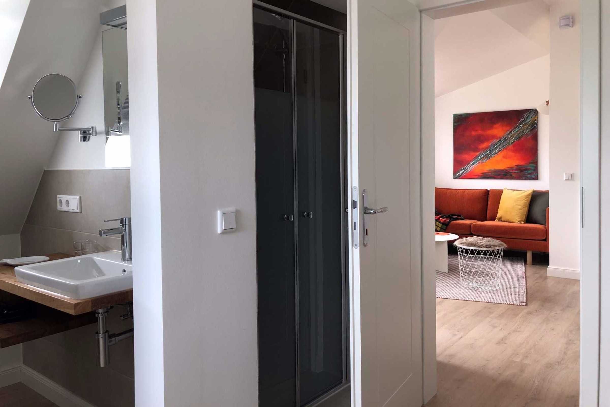 Die Ferienwohnung Windstärke 4 liegt im 1. Stock im Haus Süd auf unserer Anlage. Die Ferienwohnung ist im skandinavischen Stil eingerichtet und besteht aus einem kombinierten Wohn-/ Esszimmer mit Holzkamin, angeschlossener Terrasse, offener Küche sowie einem Schlafraum mit kleinem, angeschlossenen Balkon. Das Badezimmer en Suite mit separater Dusche ist durch eine Glastür vom Schlafbereich getrennt.