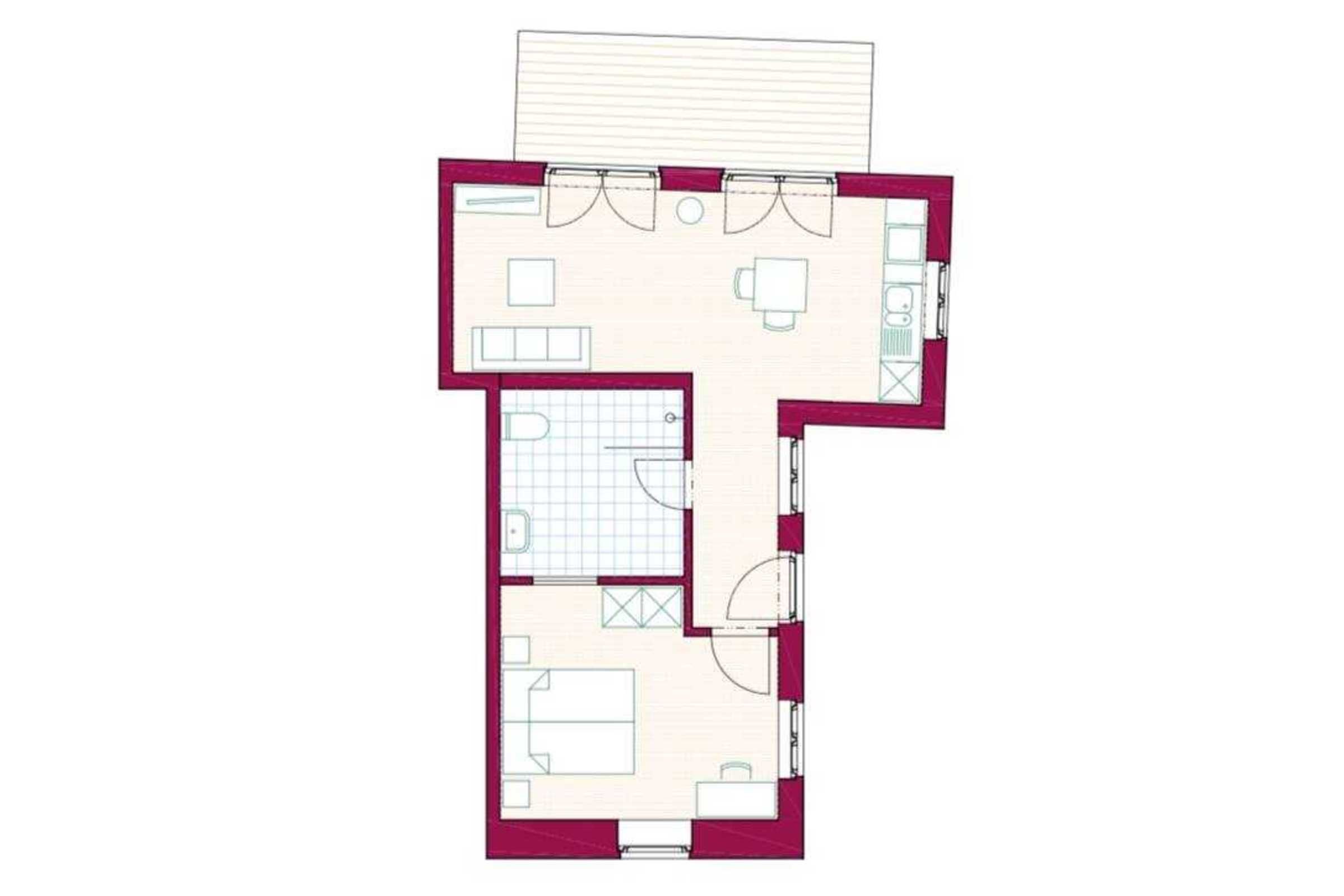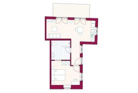 Raumaufteilung: 1 Schlafraum (1 Doppelbett), 1 Wohnraum, 1 Flur, 1 Küchenzeile, 1 Badezimmer mit Dusche.