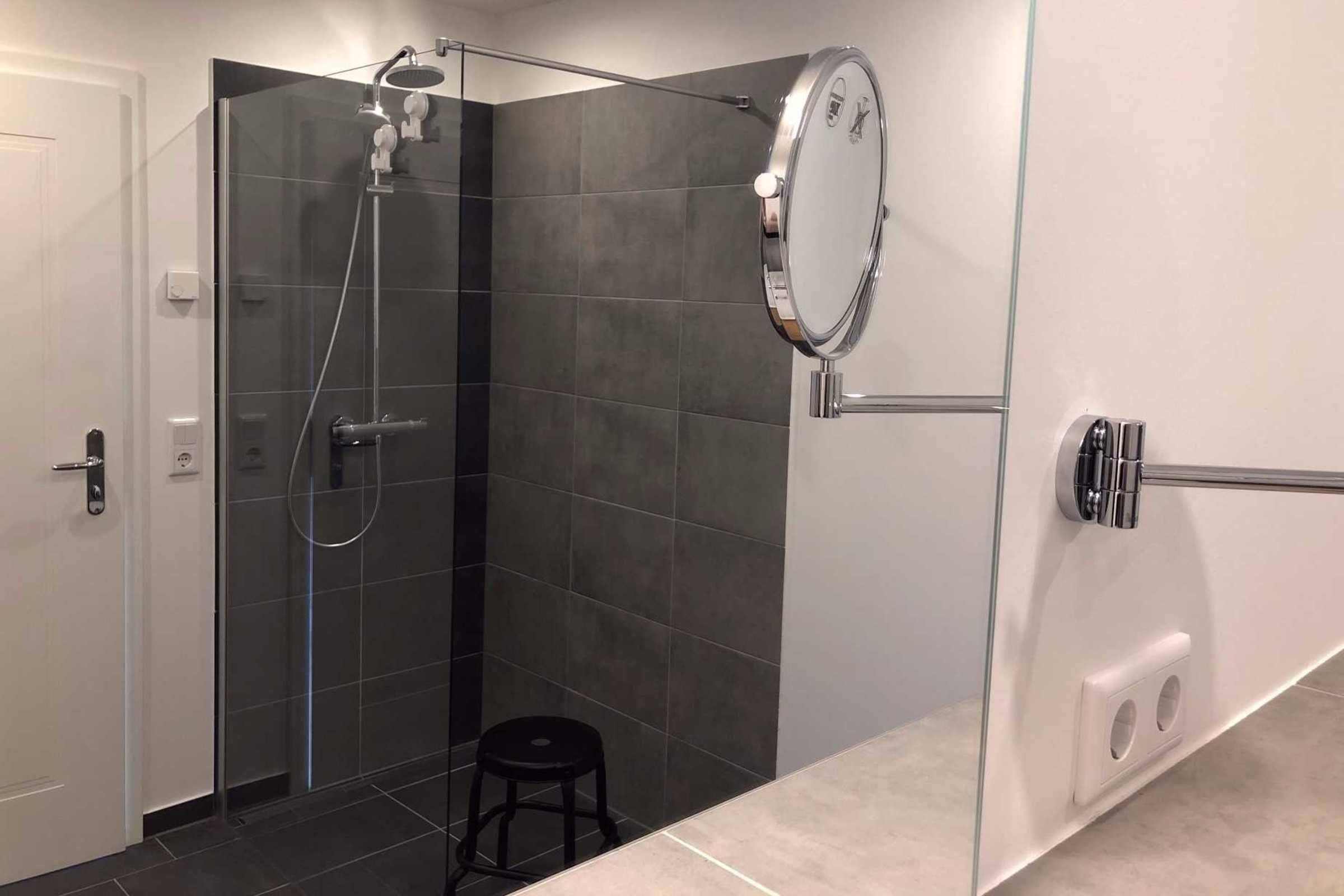 Sanitär: Bademantel, bodenebene Dusche, Föhn, Handtuchheizkörper, Schminkspiegel, Walk-In Dusche.