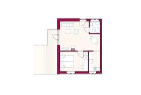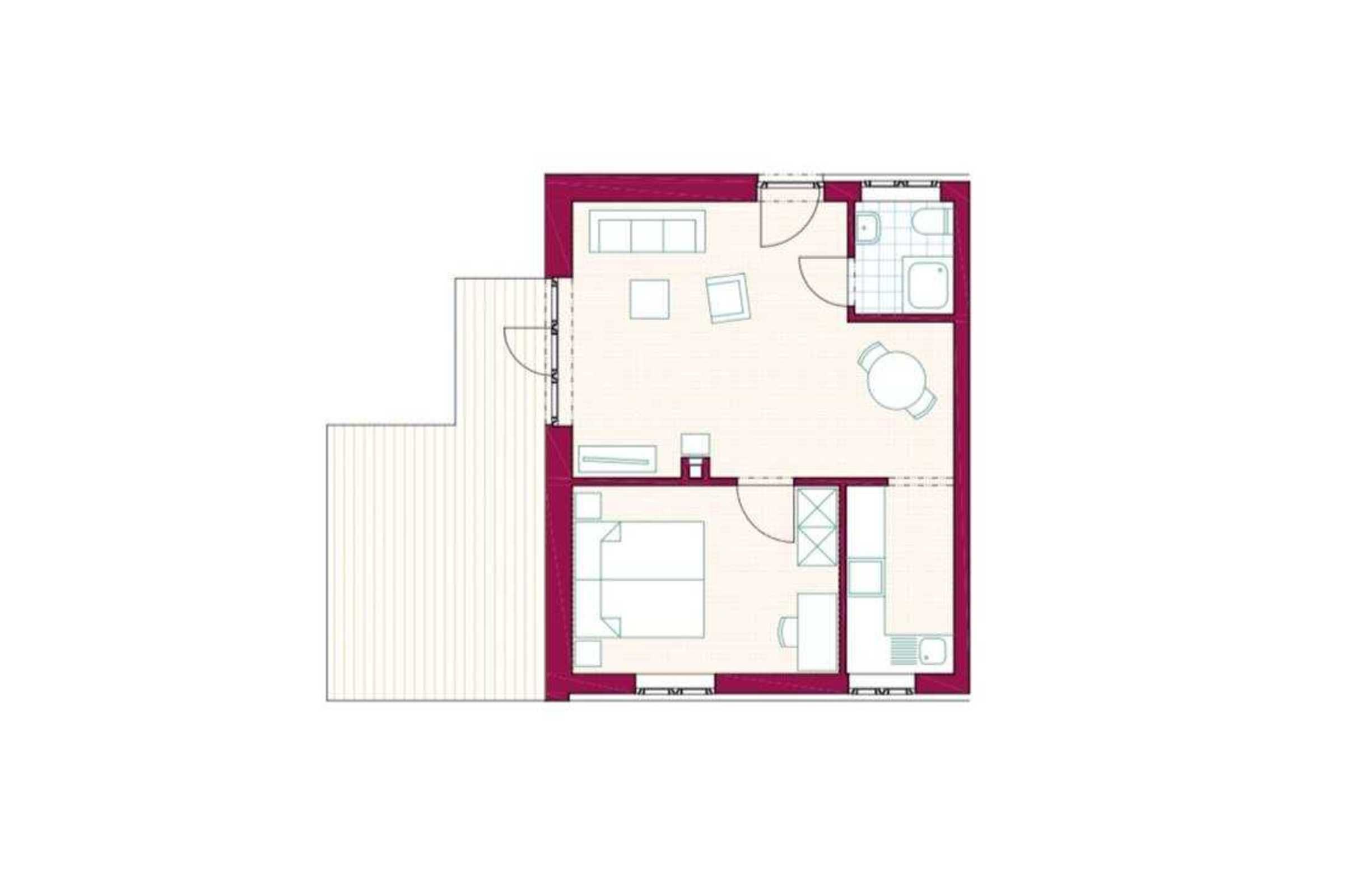 Raumaufteilung: 1 Schlafraum (1 Doppelbett), 1 Wohnraum, 1 Küchenzeile, 1 Badezimmer mit Dusche.