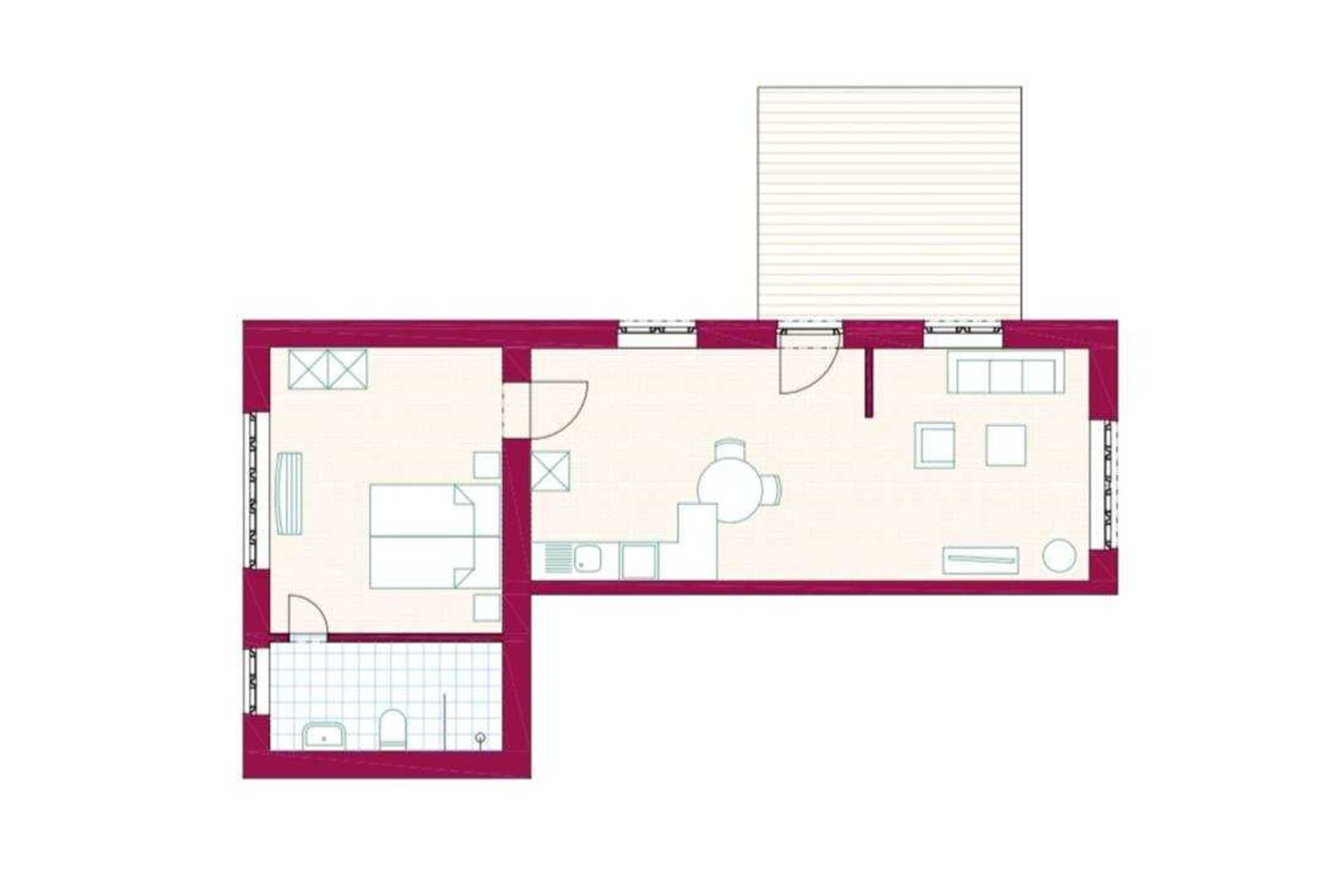 Raumaufteilung: 1 Schlafraum (1 Doppelbett), 1 Wohnraum, 1 Küchenzeile, 1 Badezimmer mit Dusche.