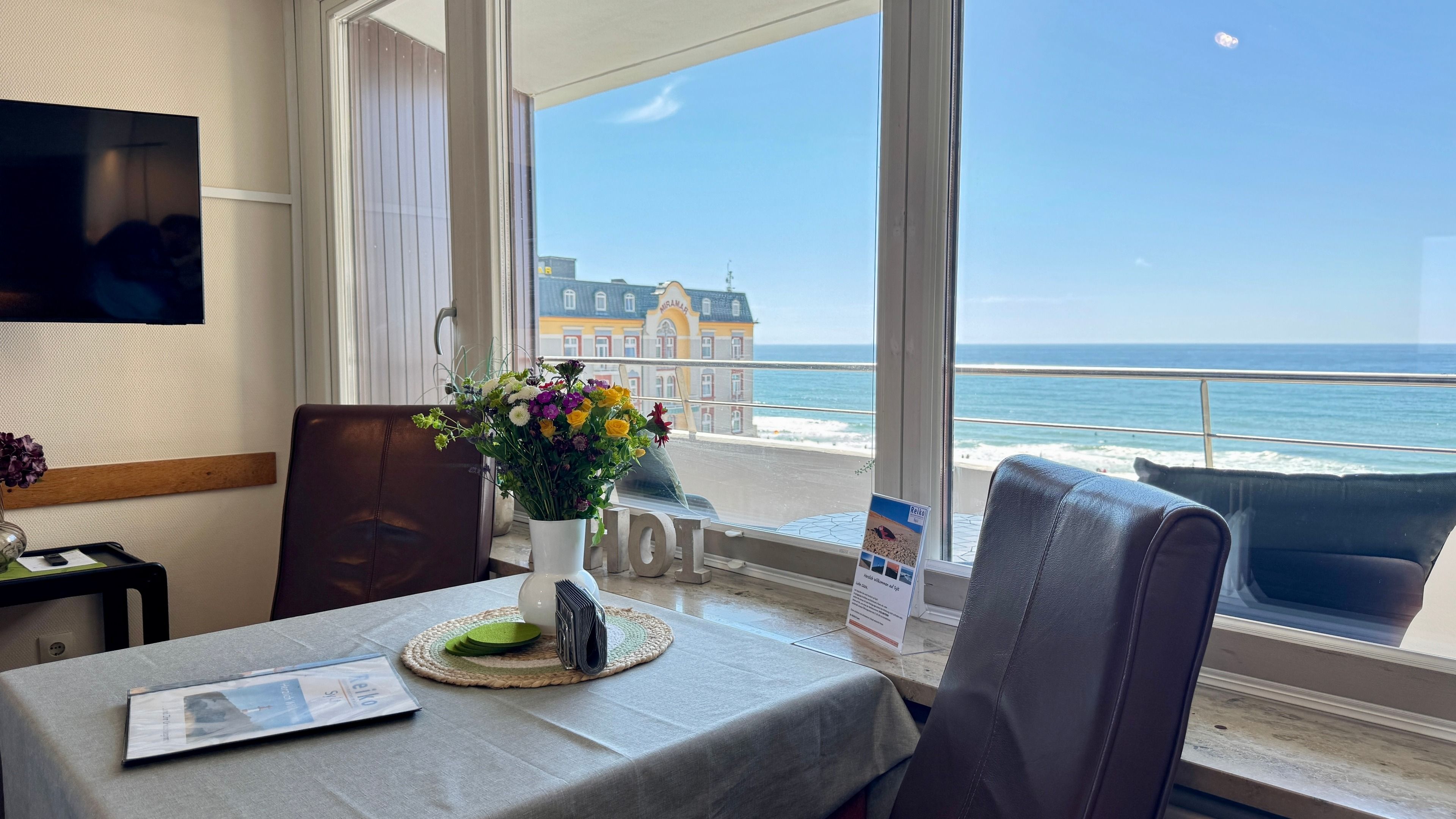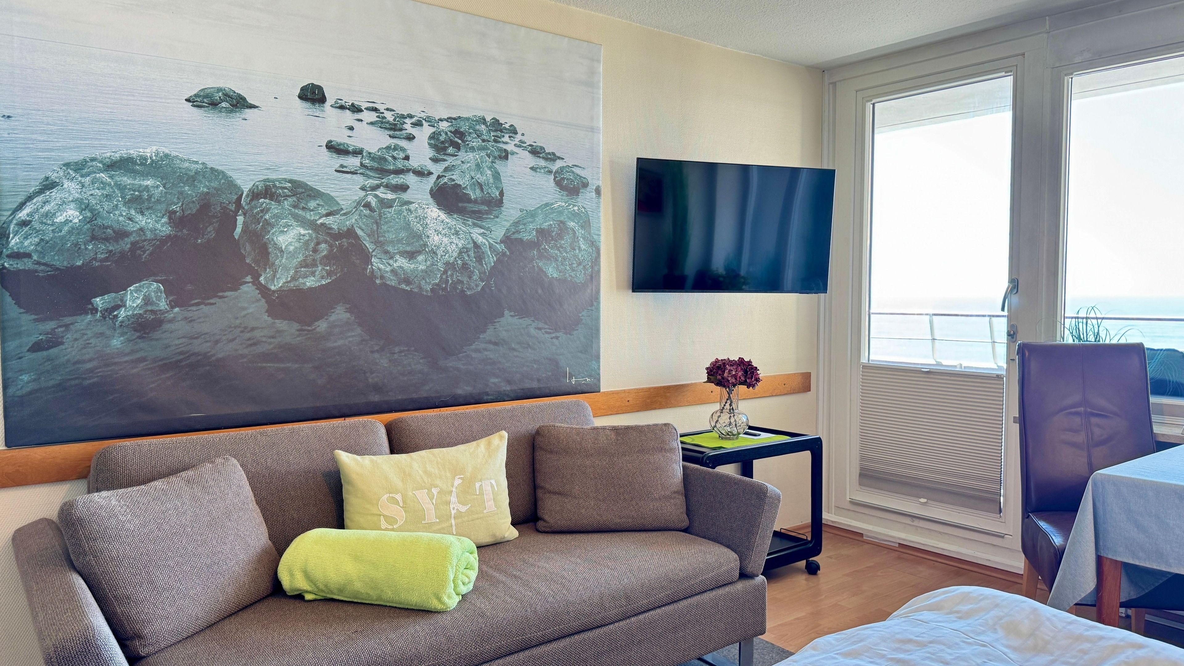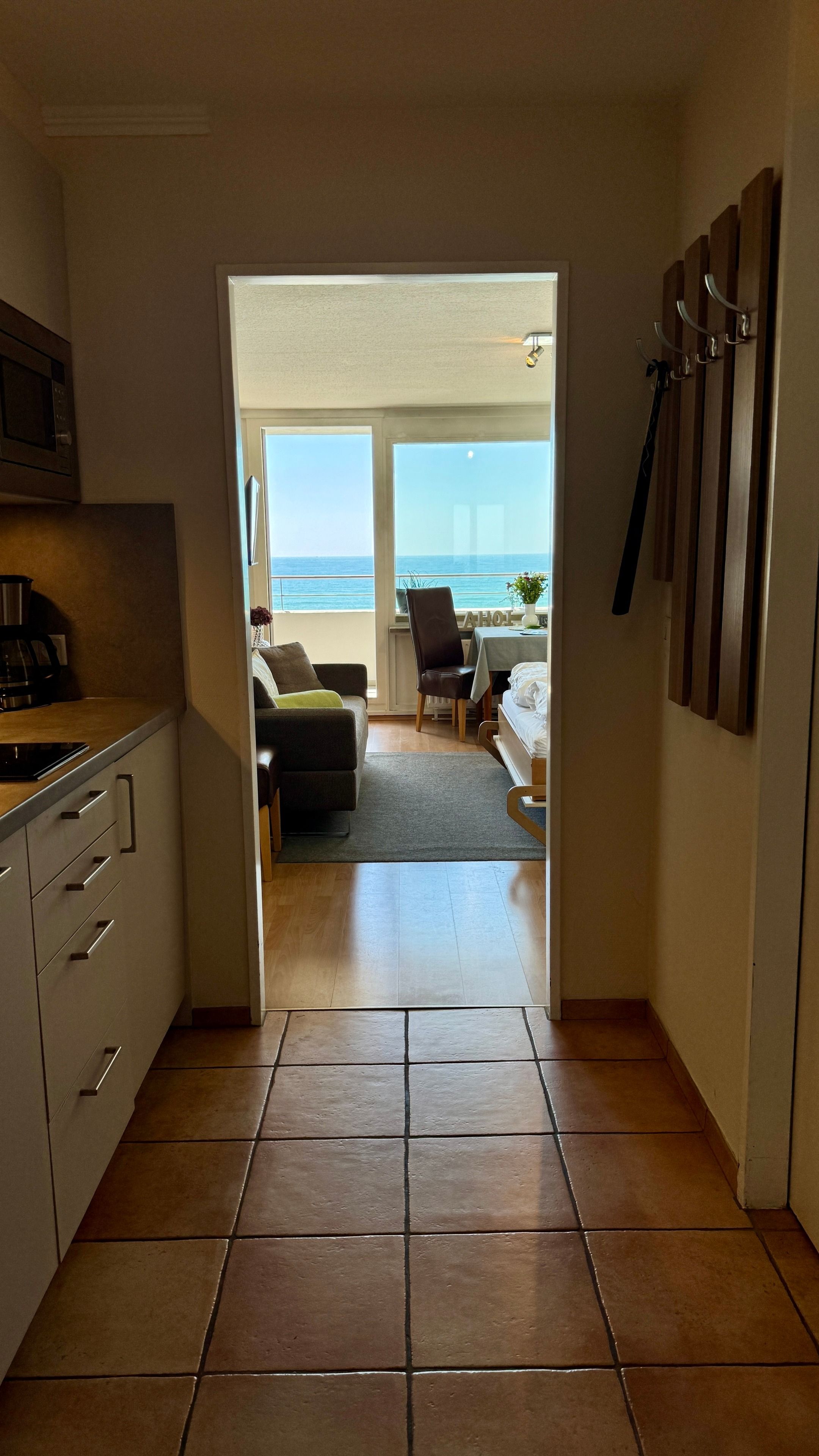 Dieses helle, gut ausgestattete 1-Zi.-Appartement befindet sich in der 3. Etage des Hauses Haus am Meer und hat ca. 34 m² Wohnfläche. Vom Westbalkon hat man einen traumhaften Seeblick. Eine gut ausgestattete Küche und ein modernes Bad runden das Bild ab