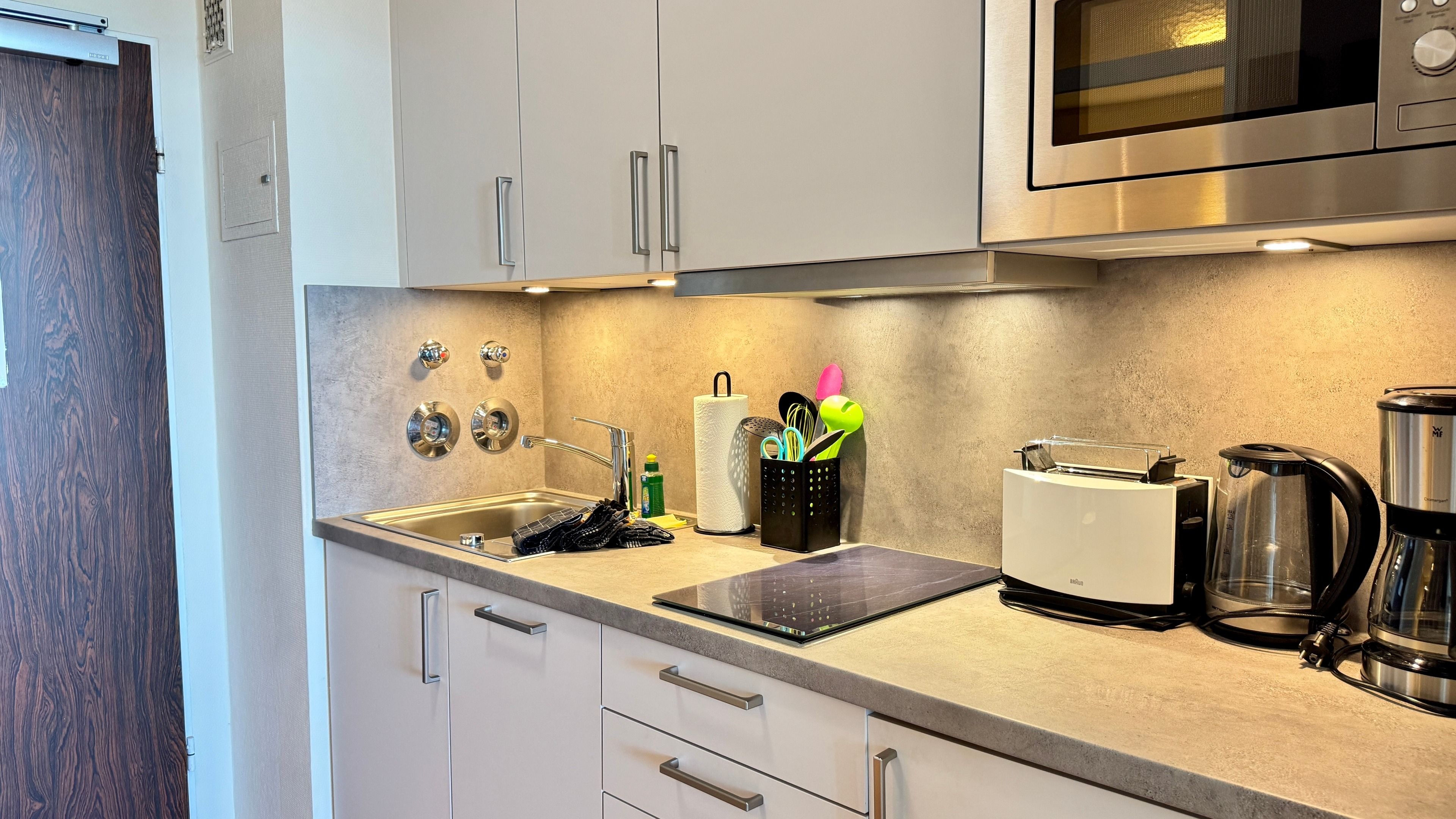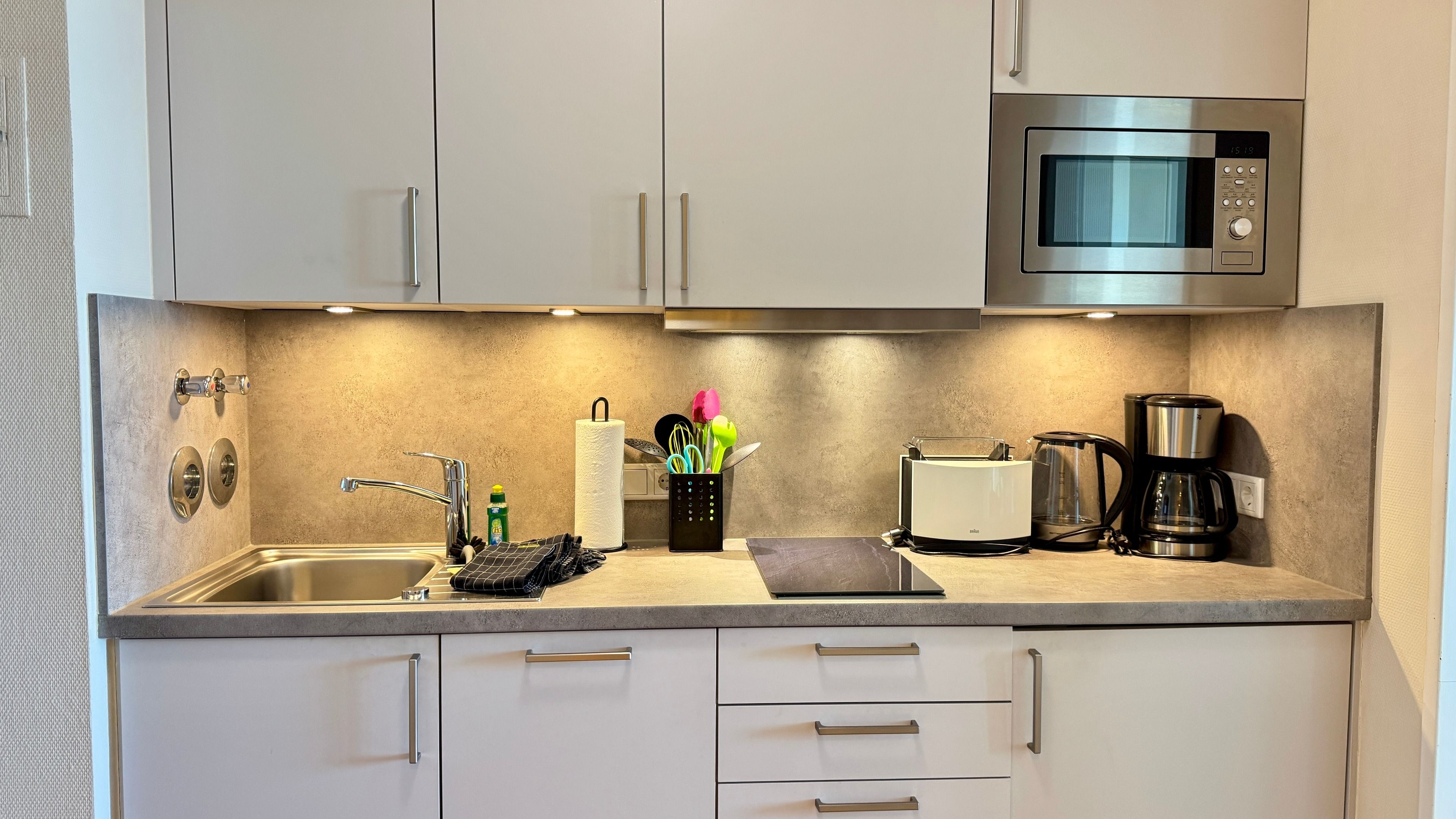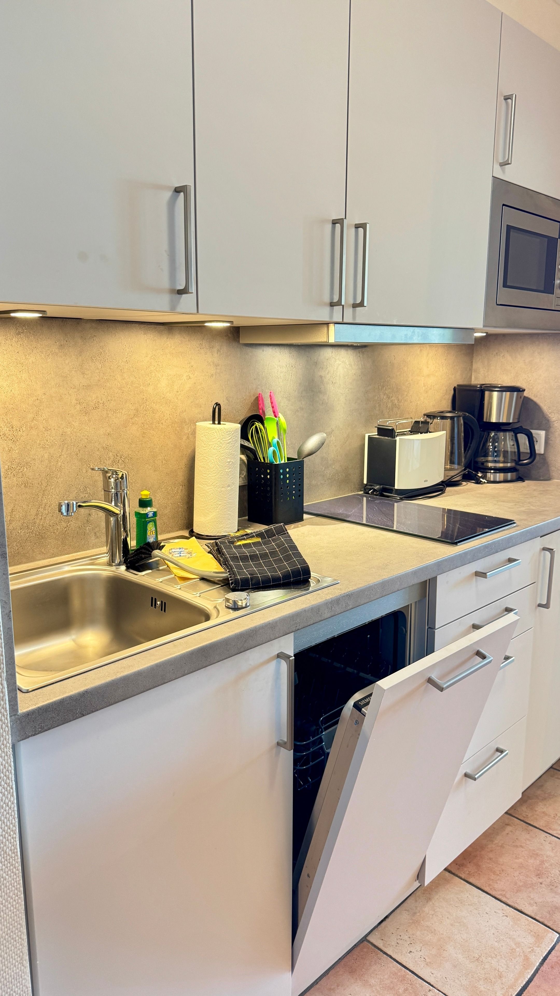 Verbrauchsmaterial, wie Mülleimerbeutel, Toilettenpapier, Spülmittel, Geschirrspültabs sind als Erstausstattung im Appartement vorhanden.