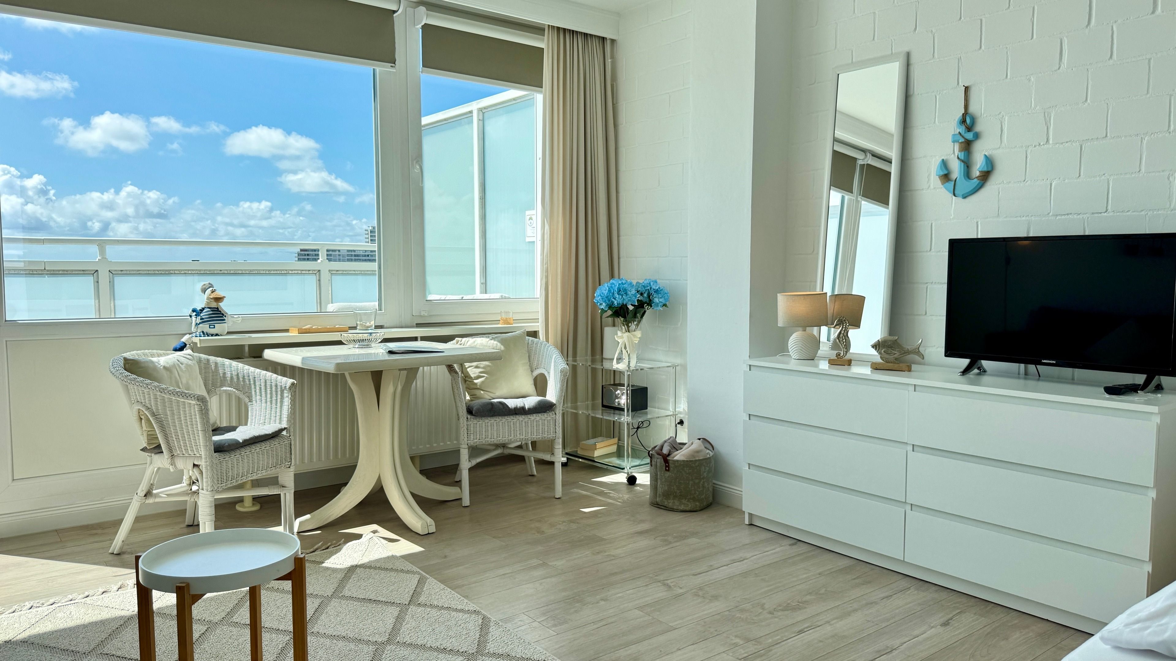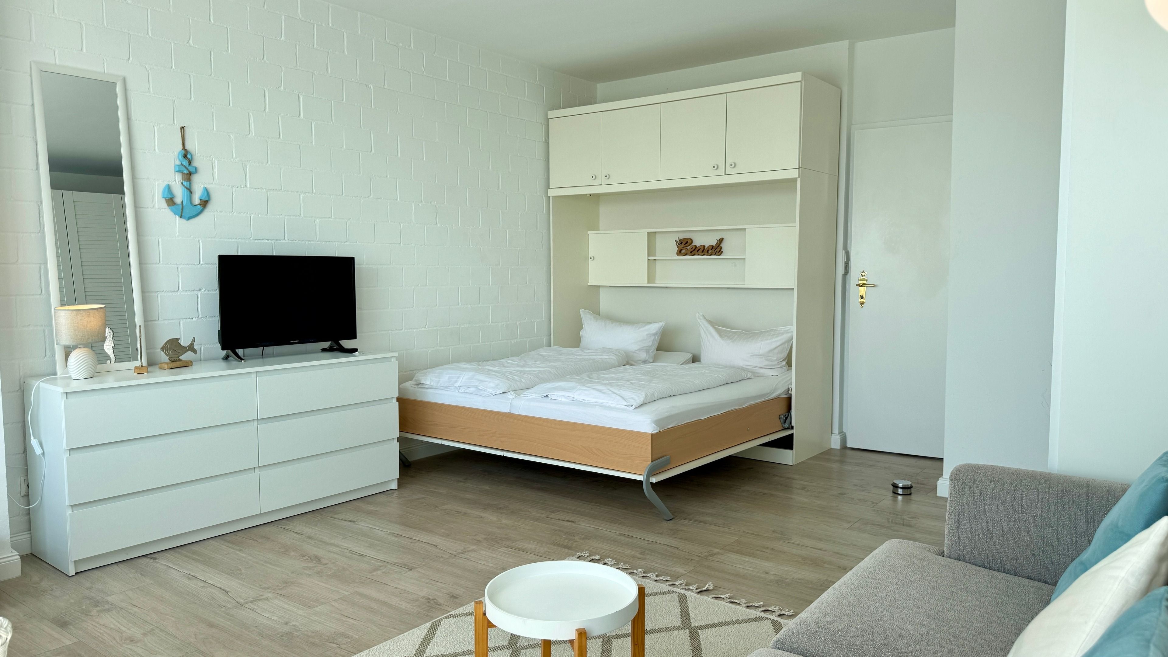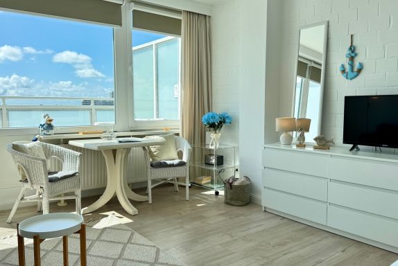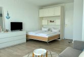 Im Wohn-/Schlafraum befindet sich eine Appartementwand mit einem ausklappbaren Doppelbett, ein Kleiderschrank, ein TV und ein Sofa, sowie ein Eßtisch mit zwei gemütlichen Korbstühlen direk am Fenster mit Blick über die Stadt zur Nordsee. Ein Internetzugang via WLAN (ohne Gewähr) ist ebenso vorhanden.