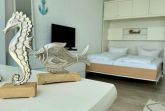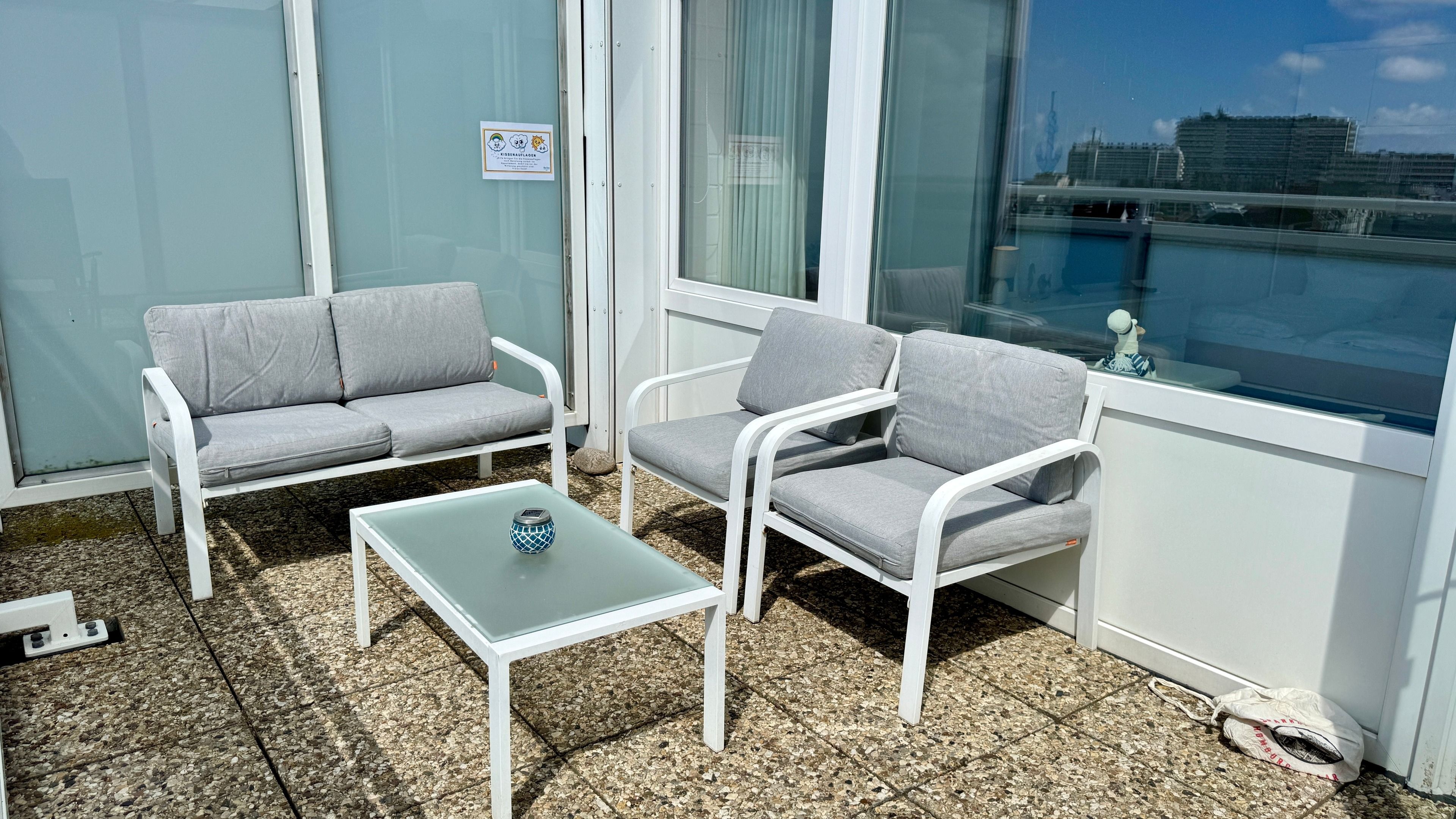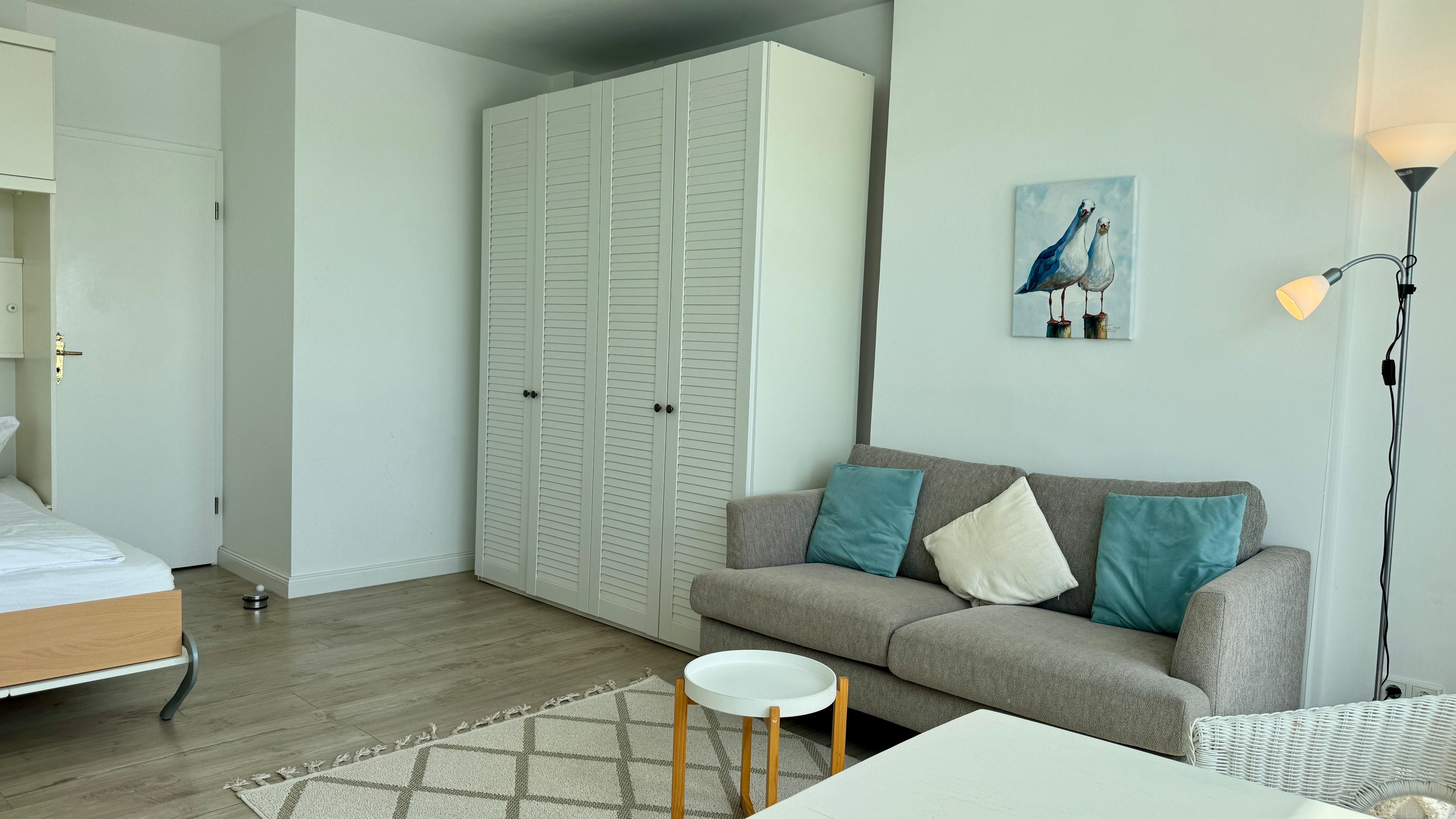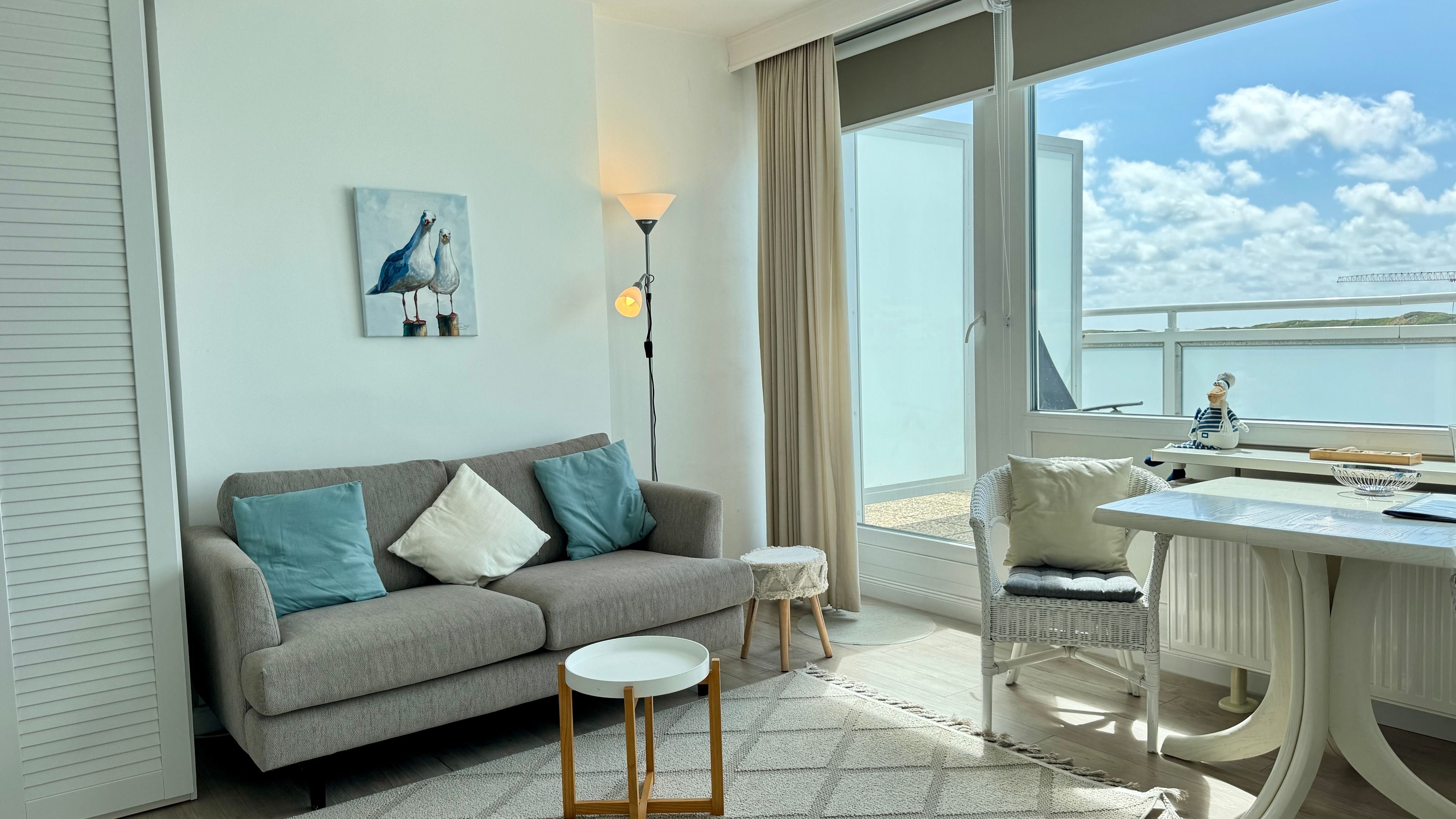 Im Wohn-/Schlafraum befindet sich eine Appartementwand mit einem ausklappbaren Doppelbett, ein Kleiderschrank, ein TV und ein Sofa, sowie ein Eßtisch mit zwei gemütlichen Korbstühlen direk am Fenster mit Blick über die Stadt zur Nordsee. Ein Internetzugang via WLAN (ohne Gewähr) ist ebenso vorhanden.