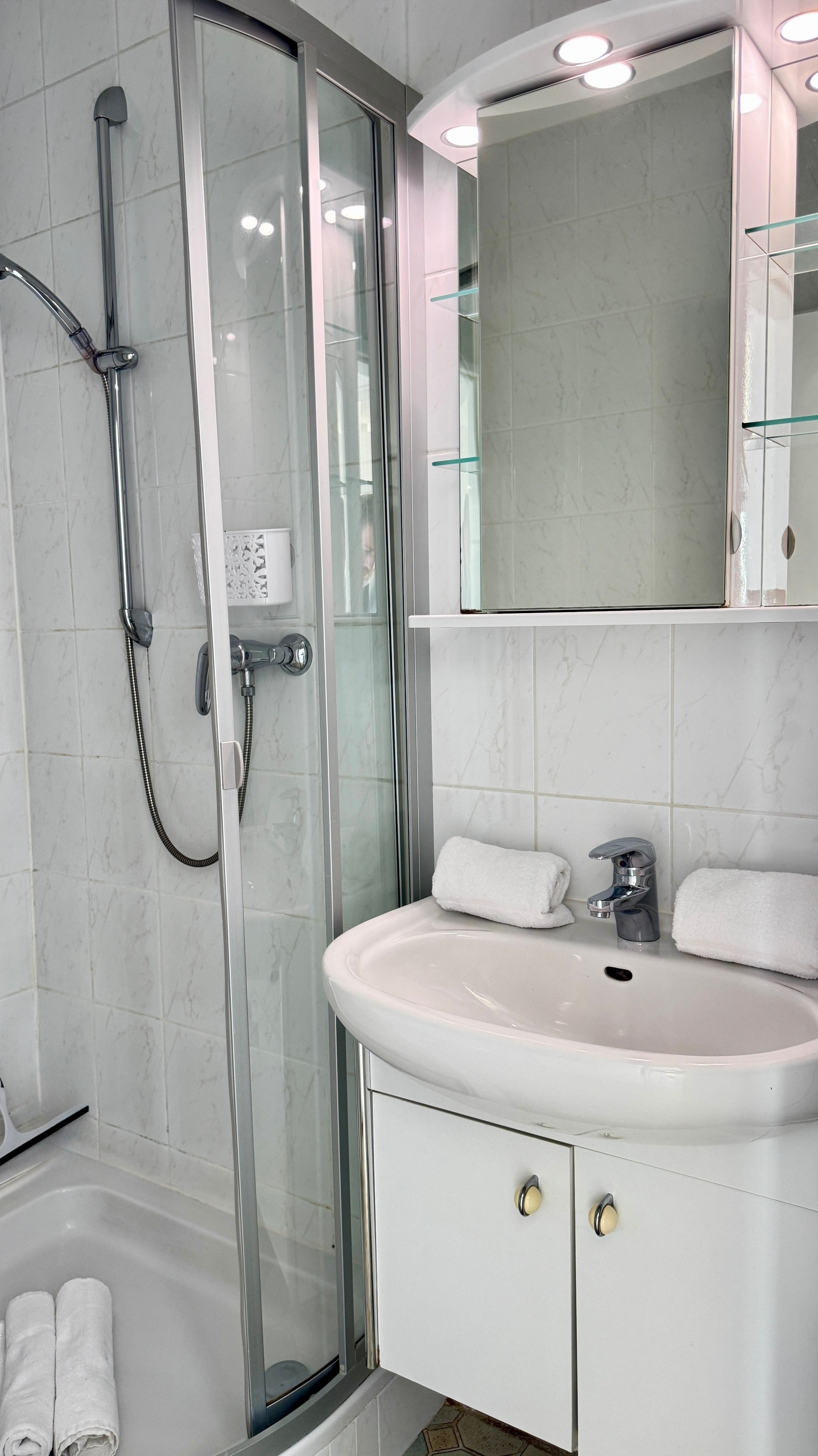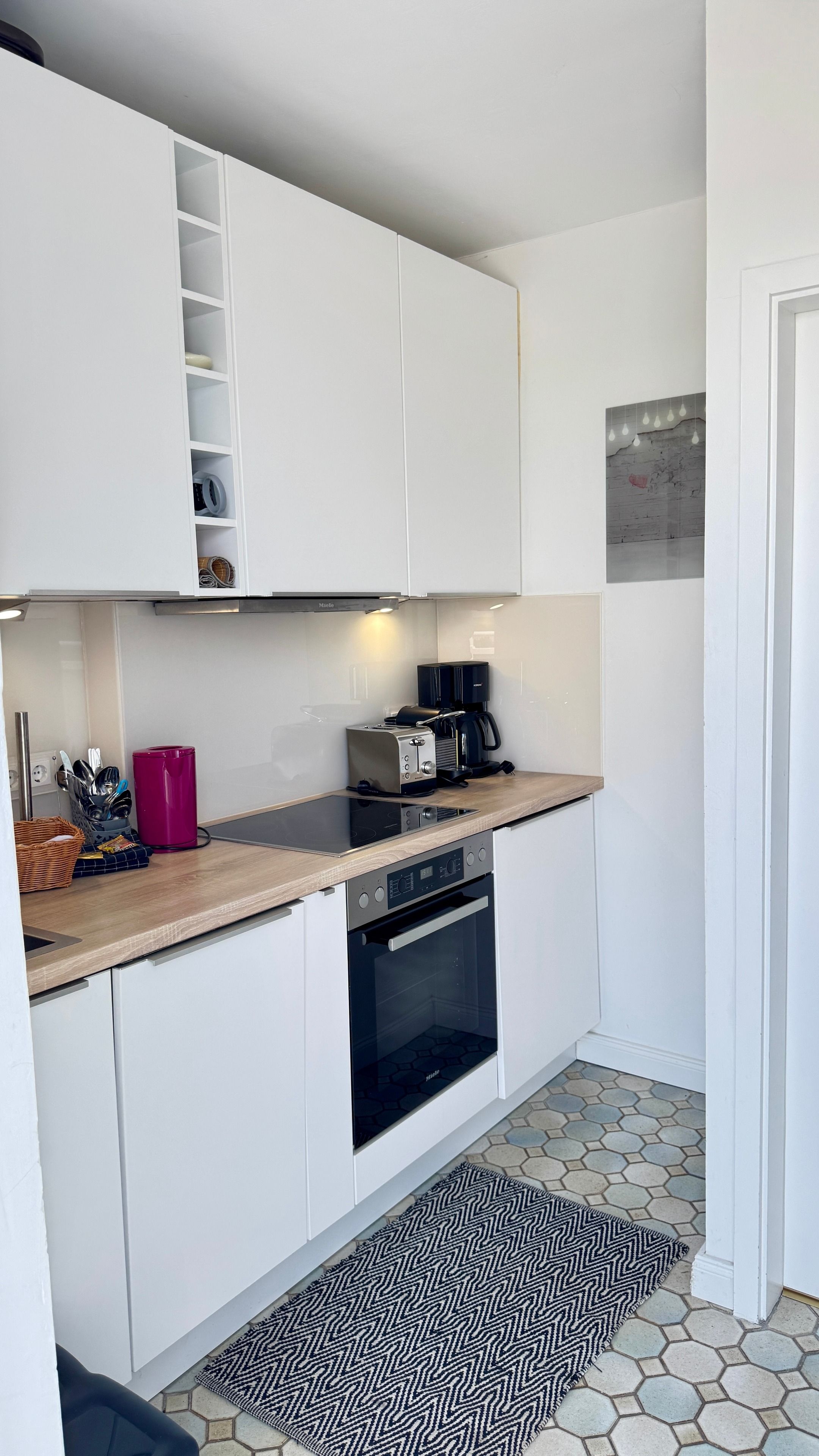 Im Eingangsbereich befindet sich die Küche und der Zugang zum Duschbad mit Runddusche. Die Küche ist unter anderem ausgestattet mit: einem Herd mit 4 Ceranfeldern und Backofen, Geschirrspüler, Kühlschrank, Kaffeemaschine, Toaster und Wasserkocher.