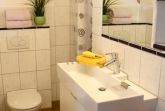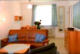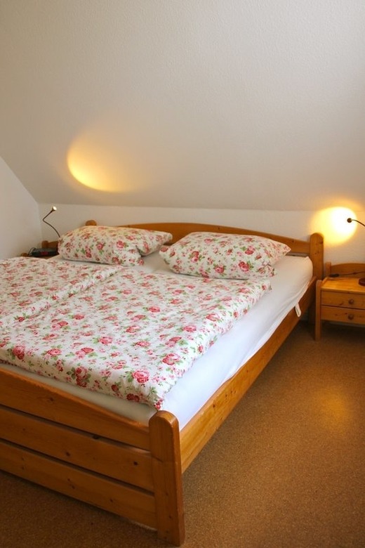 Diese reihenhausartige Wohnung mit insgesamt drei Schlafzimmern (2 Erwachsene und 3 Kinder) geht über zwei Etagen. Im Erdgeschoss findet sich ein offener Wohn- und Essbereich, eine kleine Küche mit Spülmaschine, das Bad mit Strandsteinapplikationen und ein Kinderzimmer mit einem Bett. Oben ist das Elternschlafzimmer und ein weiteres Kinderzimmer mit zwei Betten. Vor dem Haus ist eine große Terrasse mit Abendsonne.