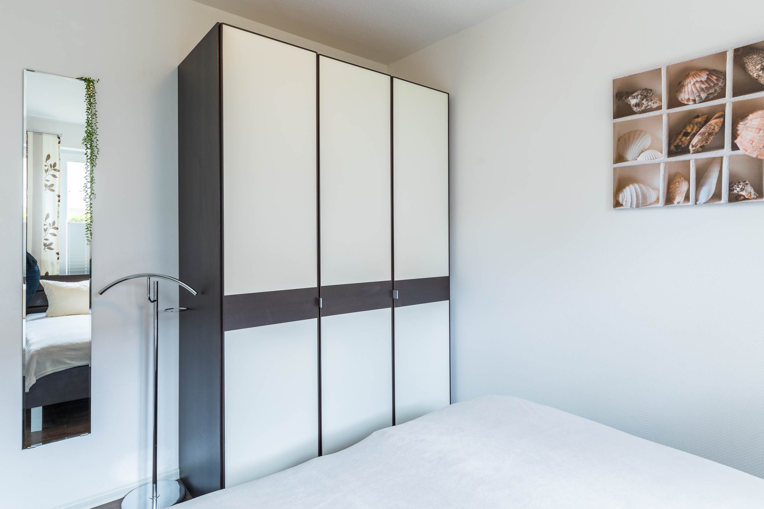 Im Schlafzimmer gibt es ein Doppelbett und einen Kleiderschrank.