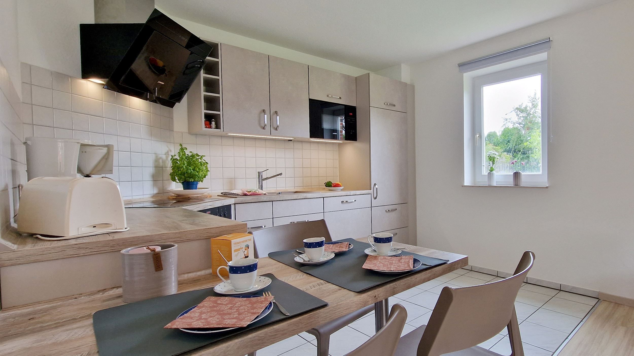 Küchenausstattung: Die großzügige Küchenzeile ist mit einem 4-Plattenherd und einem Backofen ausgestattet und bietet alles, was Sie für eine angenehme Selbstverpflegung benötigen.