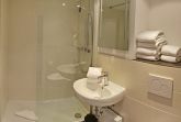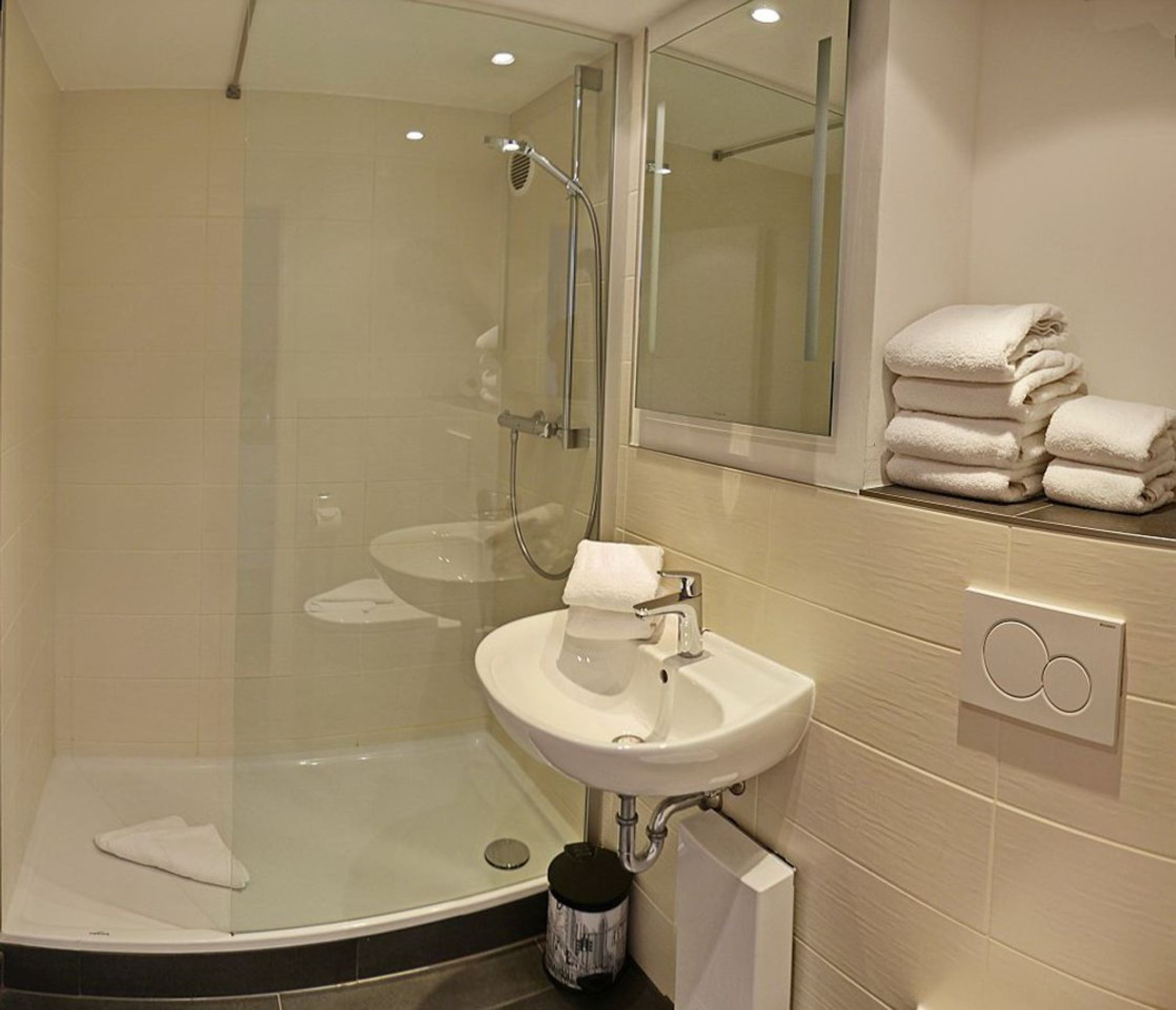 Ein modernes, neu renoviertes Bad mit Dusche, WC, Waschbecken und Haartrockner.