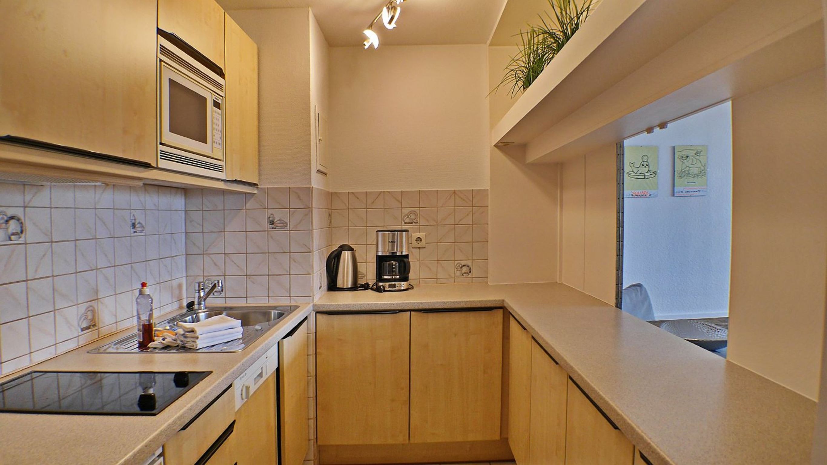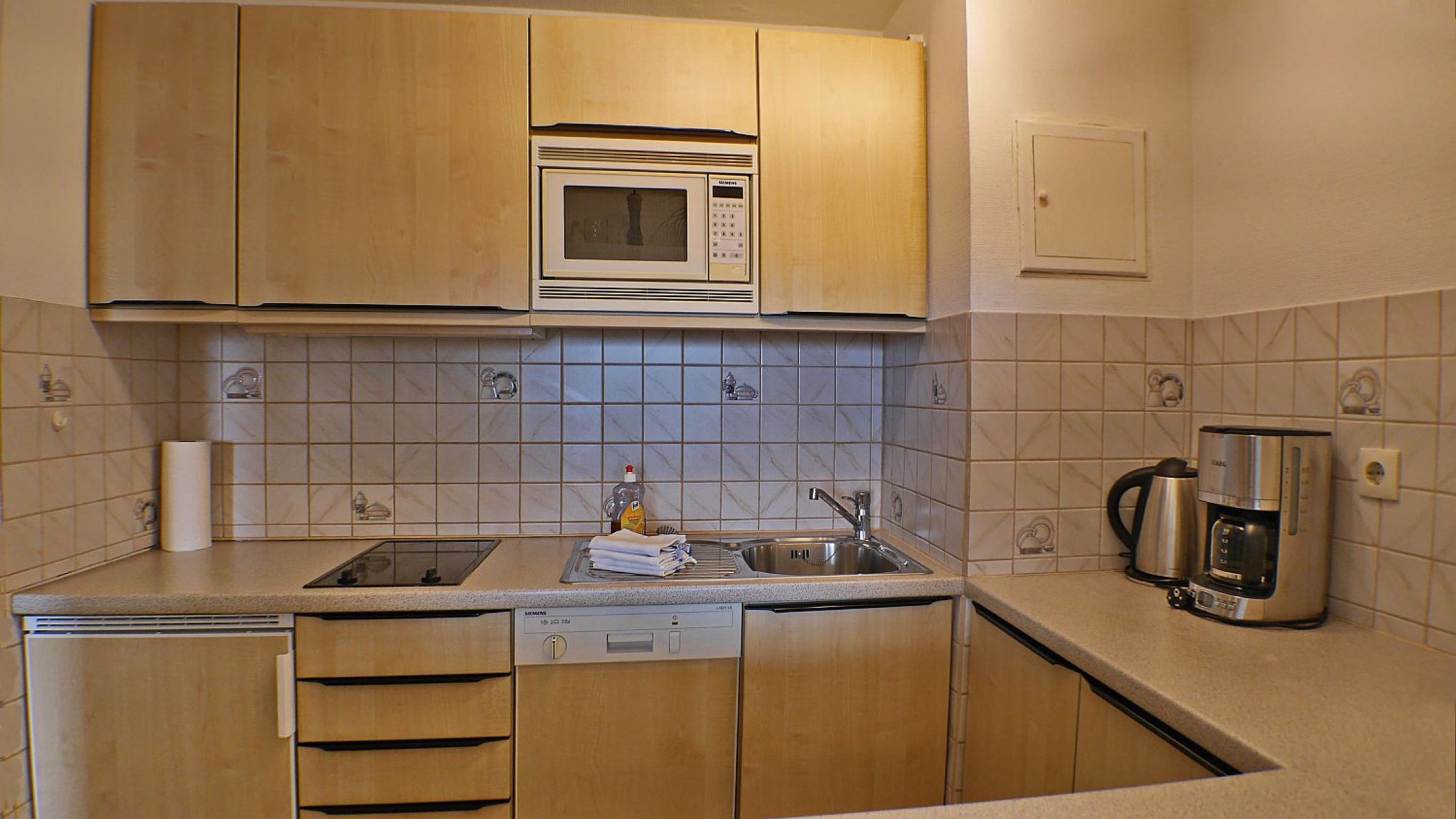 Die separate Küche mit Ceranfeld, Mikrowelle, Kaffeemaschine, Spülmaschine, Wasserkocher, Kühlschrank mit