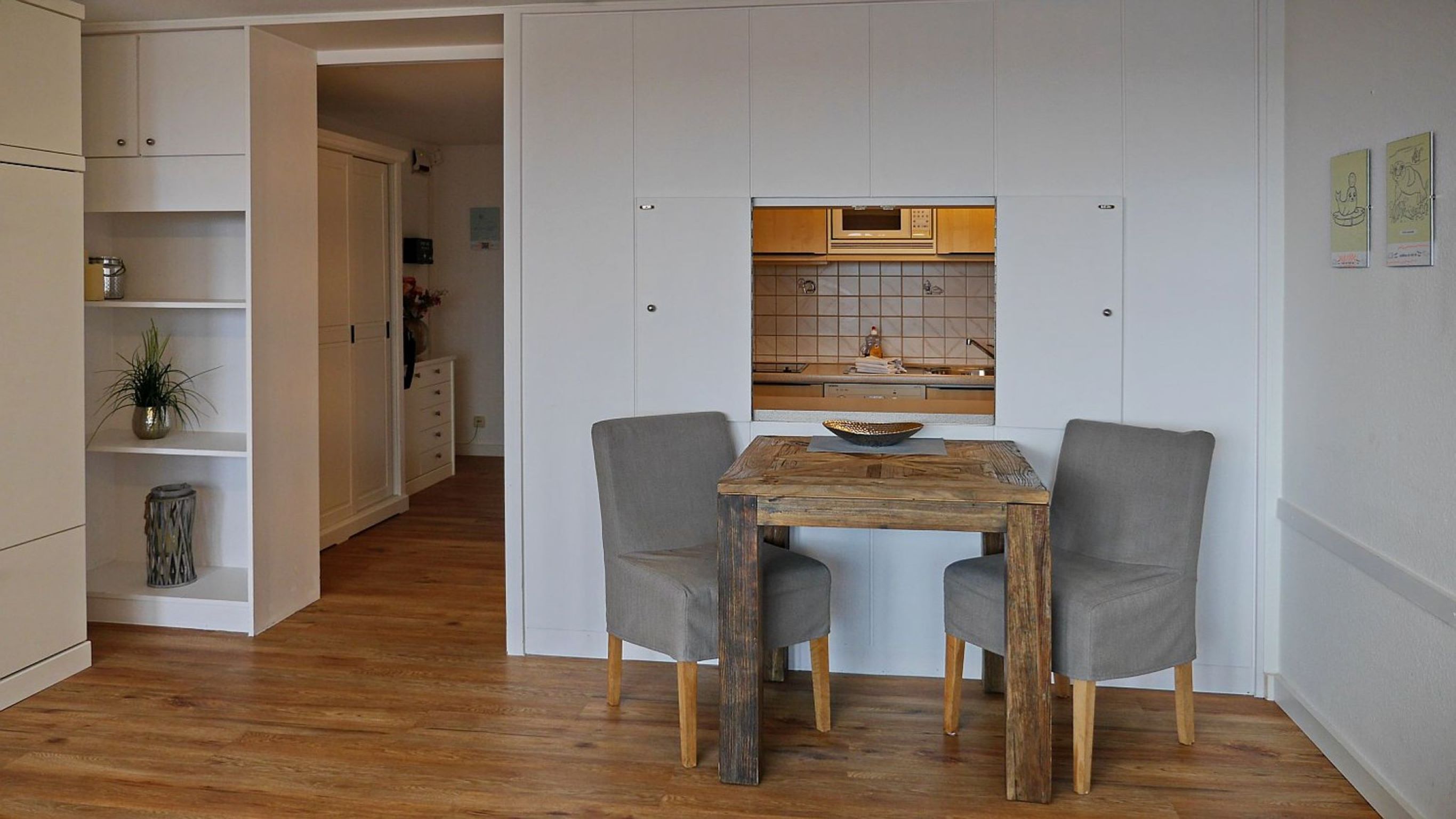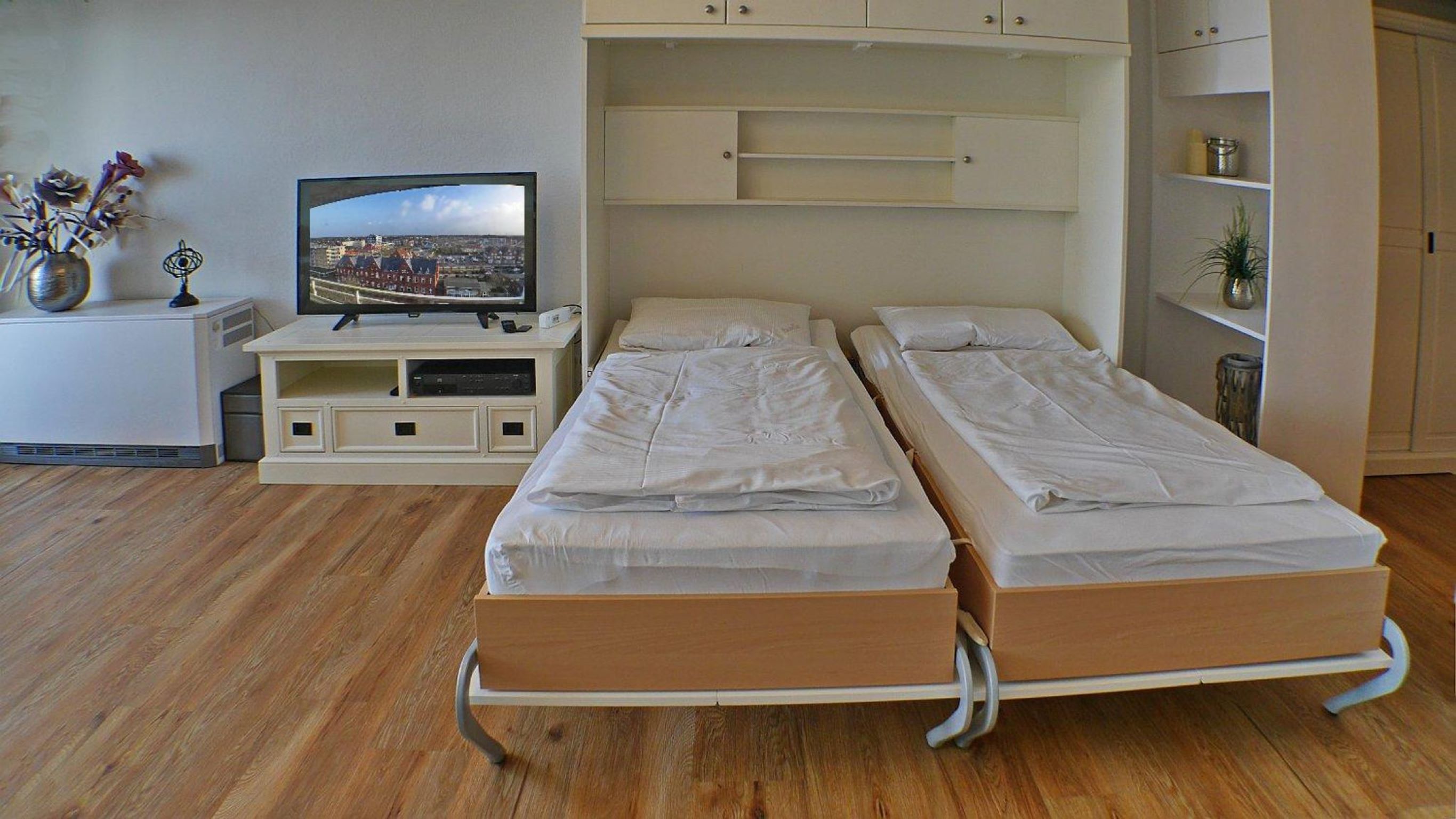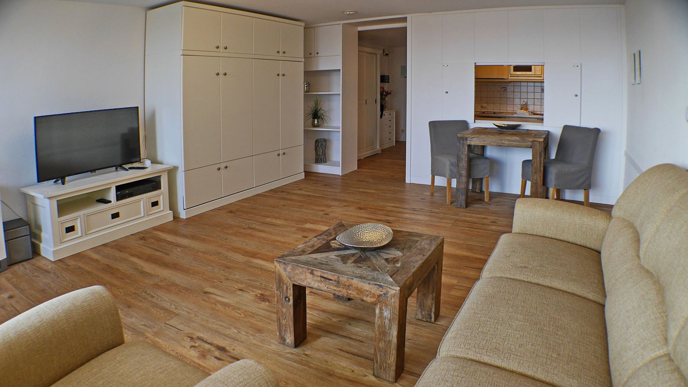 Ein kombinierter Wohn-Schlafraum mit Sofagarnitur, Sideboard, Doppelschrankbett und Essecke ist der Mittelpunkt dieser hell eingerichteten Wohnung mit Designboden.