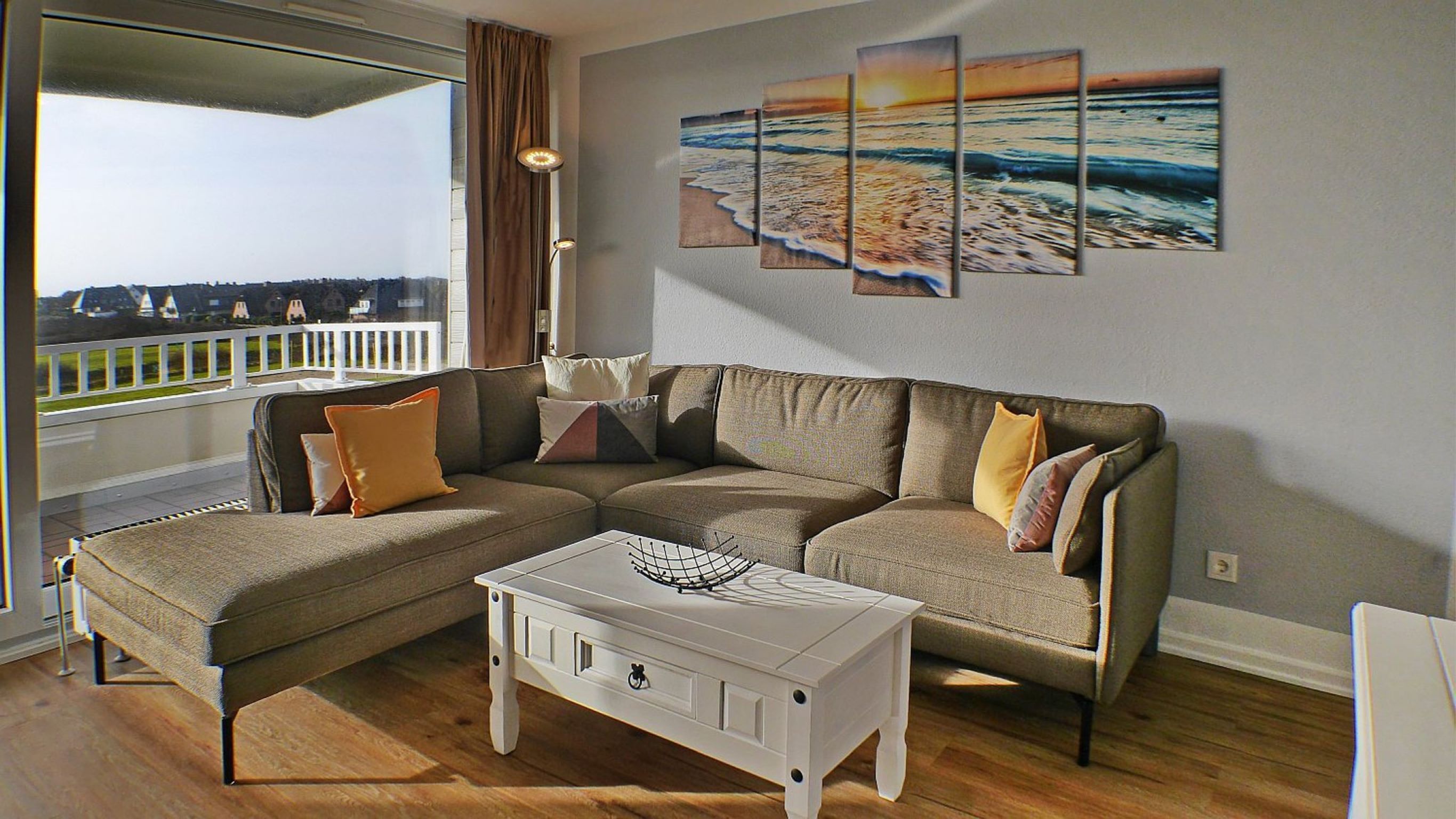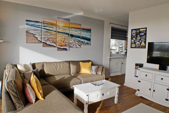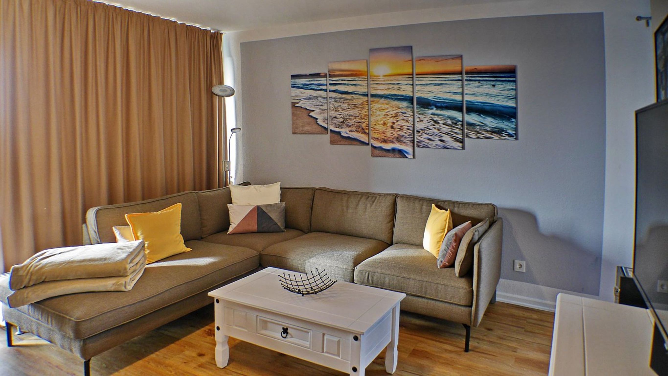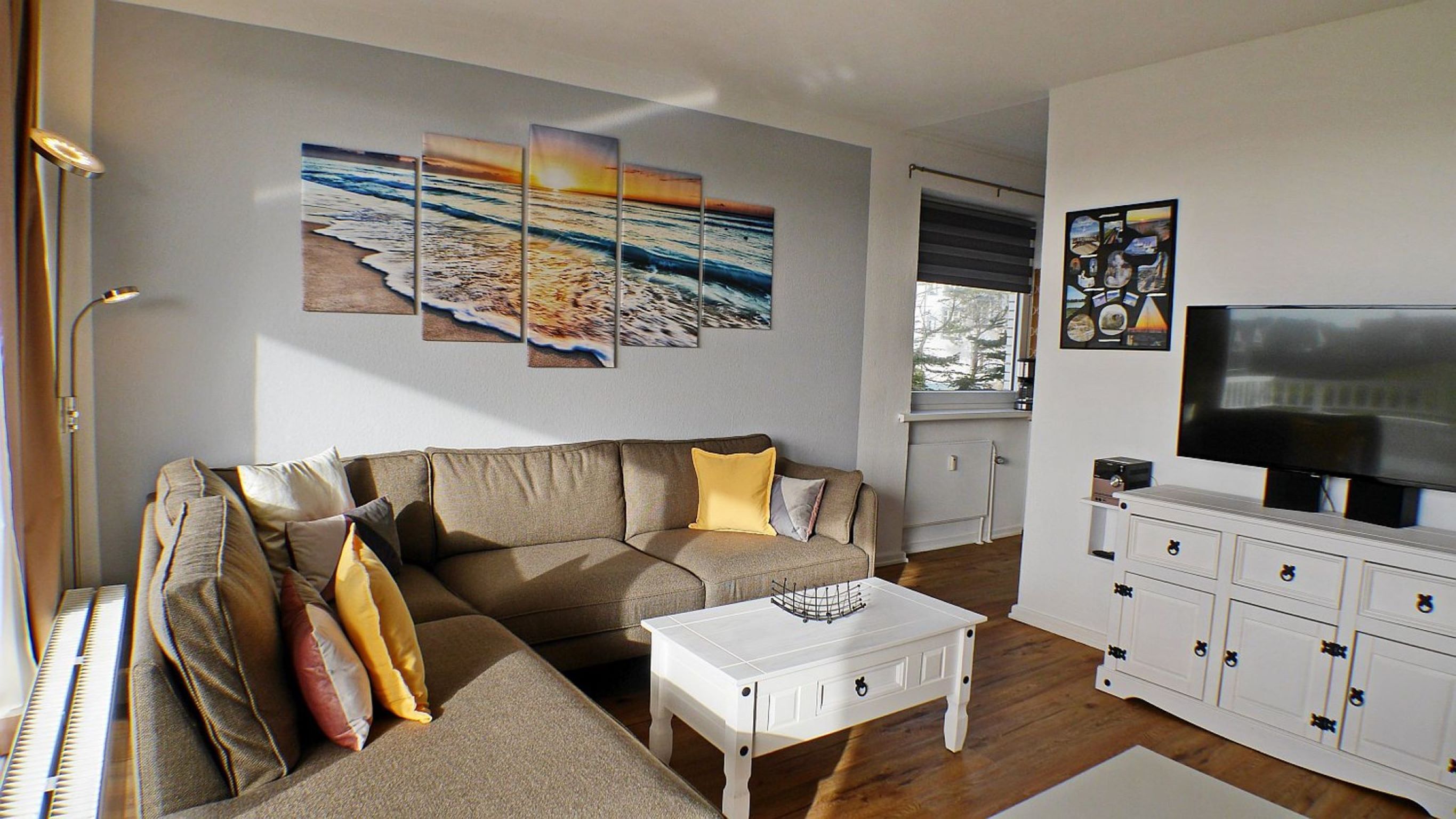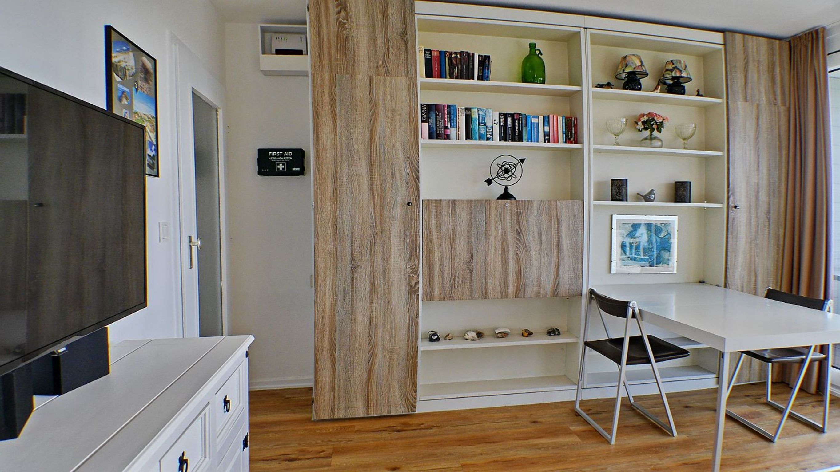 Ein helles Wohnzimmer mit Couch, Flachbild-TV und Essecke (ausziehbar aus dem Einbauschrank) ist der Mittelpunkt der Wohnung.