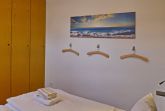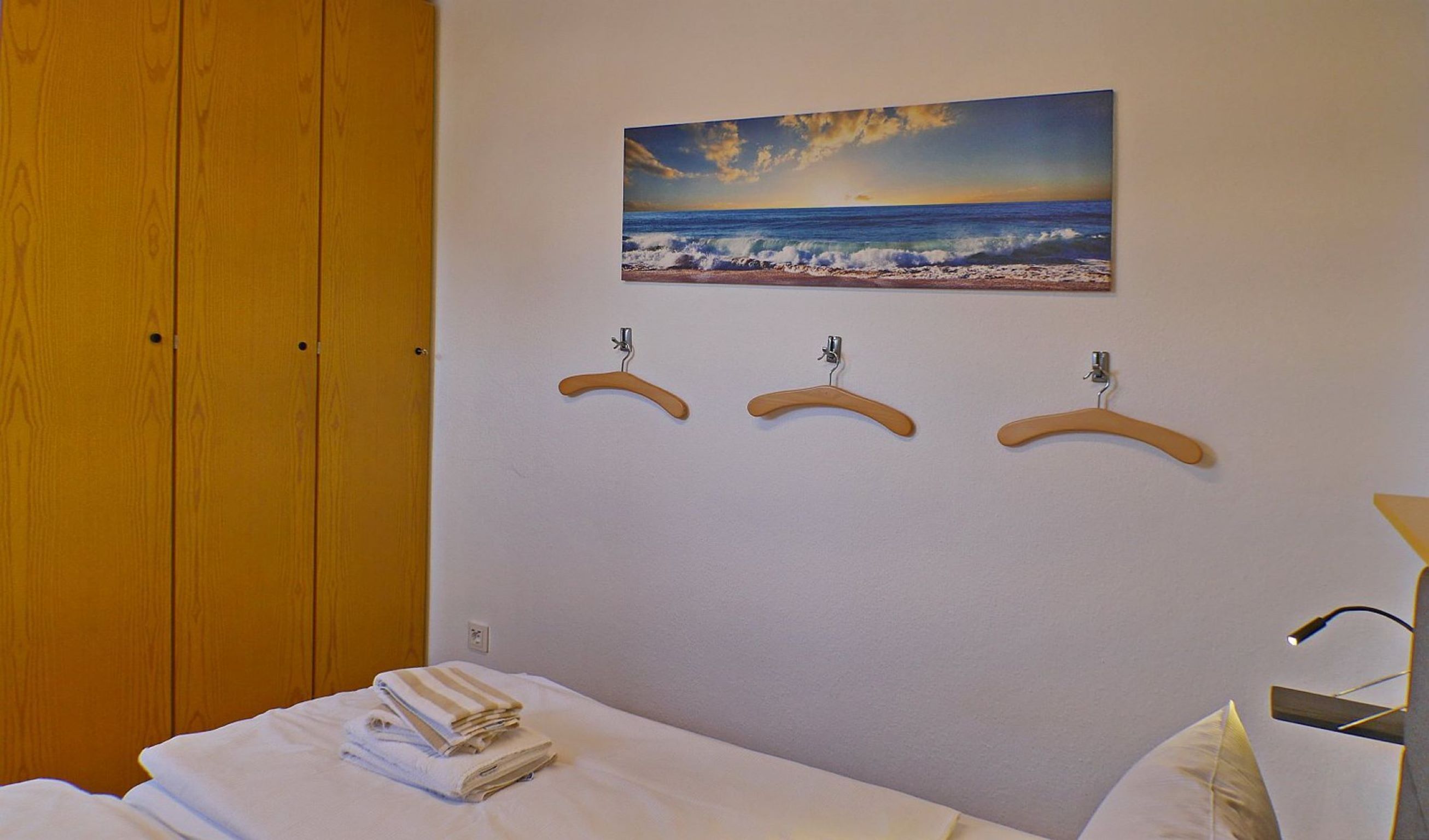 Ein Schlafzimmer bietet ein Doppelbett (180x200) mit offenem Fußende, Leselampen und einem Kleiderschrank alles, was ein entspannter Sylt-Urlaub benötigt.