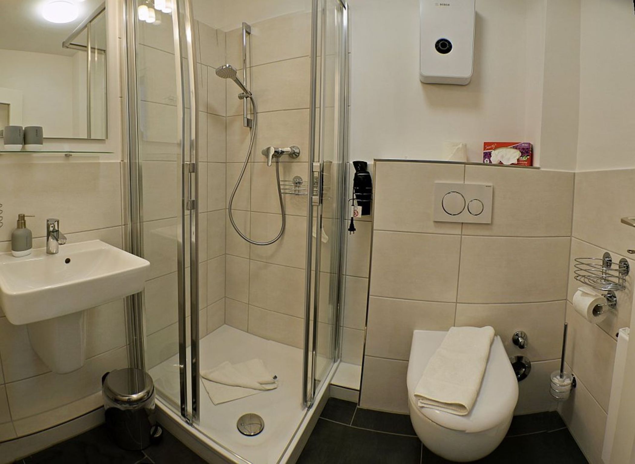 Ein innenliegendes Bad mit Waschbecken, Dusche, WC, Haartrockner