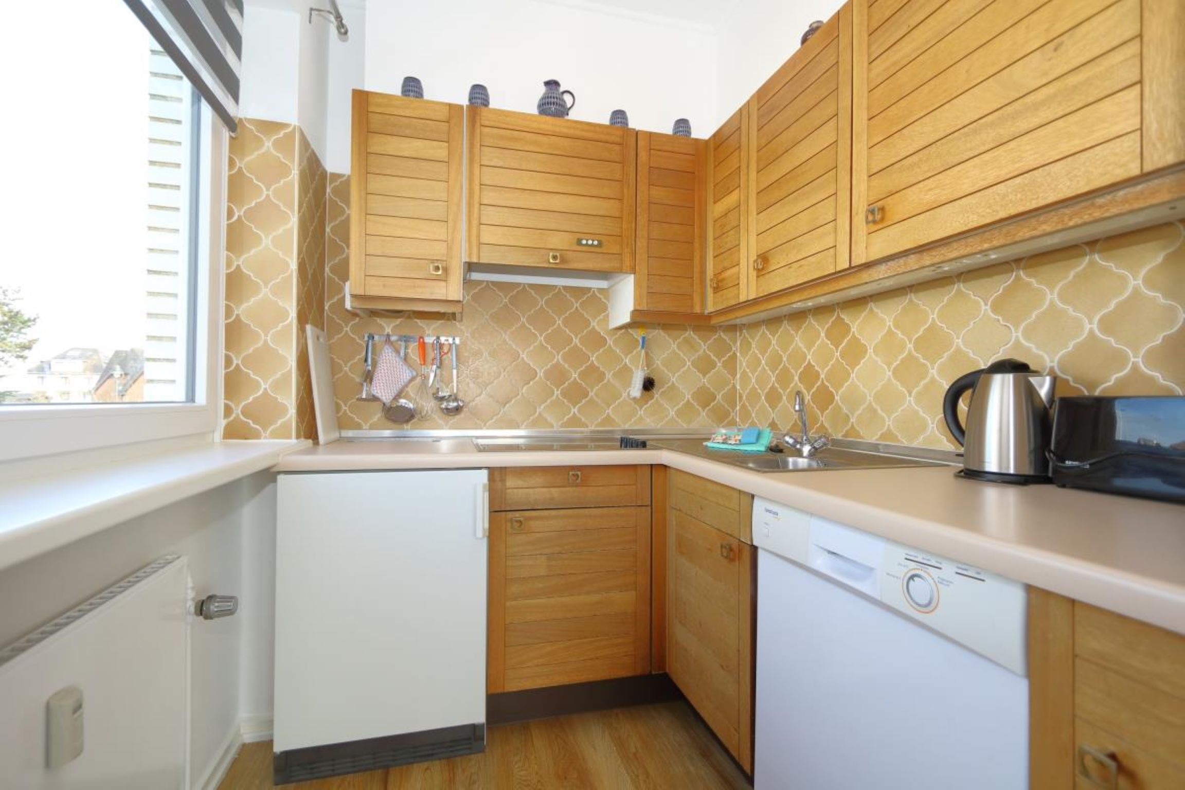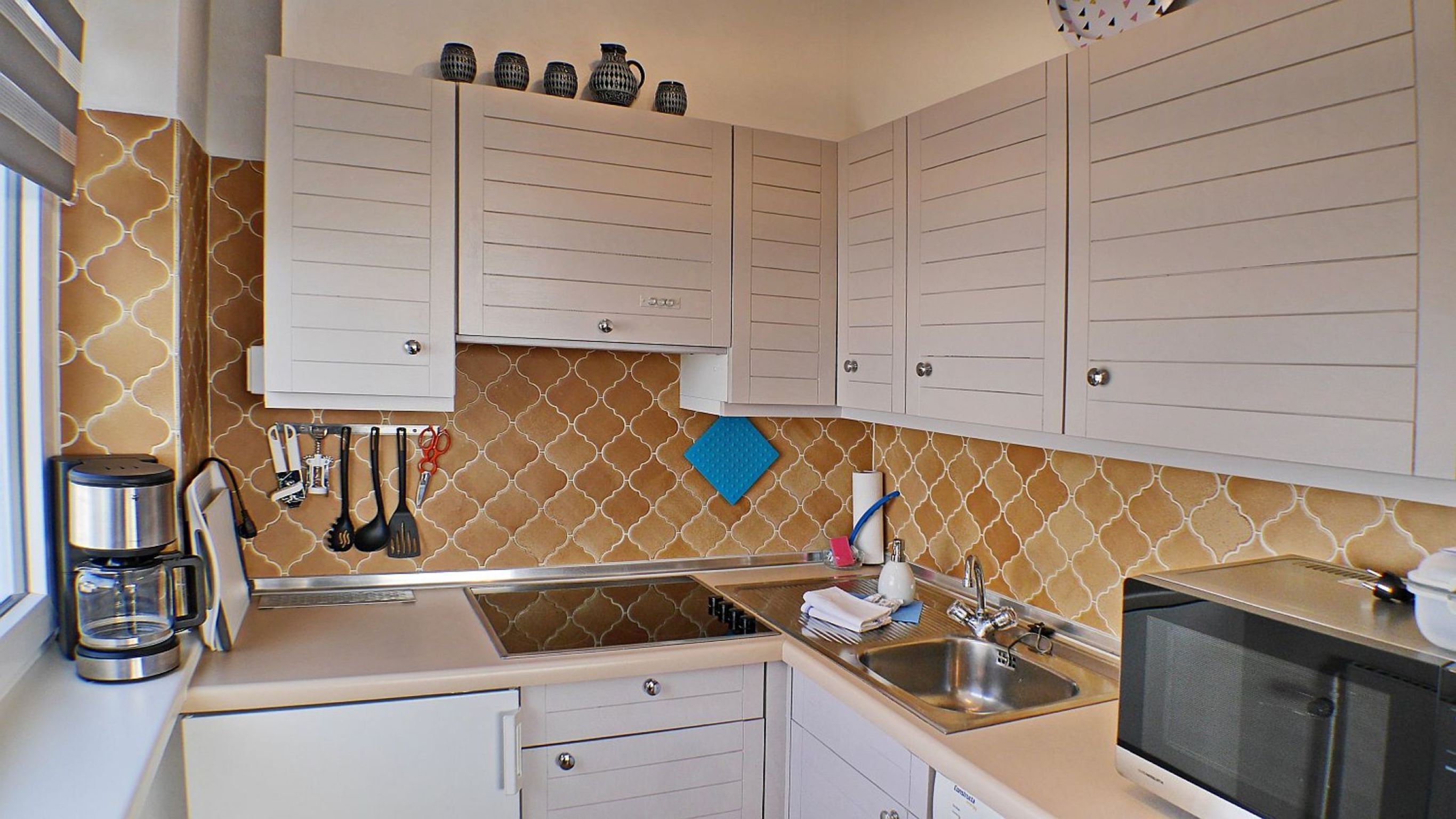 Die separate Küchenzeile ist ausgestattet mit 4-Plattencerankochfeld, 5 in 1-Multifunktionsmikrowelle, Geschirrspüler, Kühlschrank mit Gefriermöglichkeit, Kaffeemaschine, Wasserkocher, Toaster und Geschirr für den täglichen Bedarf ist selbstverständlich.