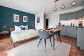 Der offene Wohn - Schlafbereich ist modern gestaltet und bietet dazu noch eine voll ausgestattete Küche mit Esstisch, die sich harmonisch in den Raum integriert.