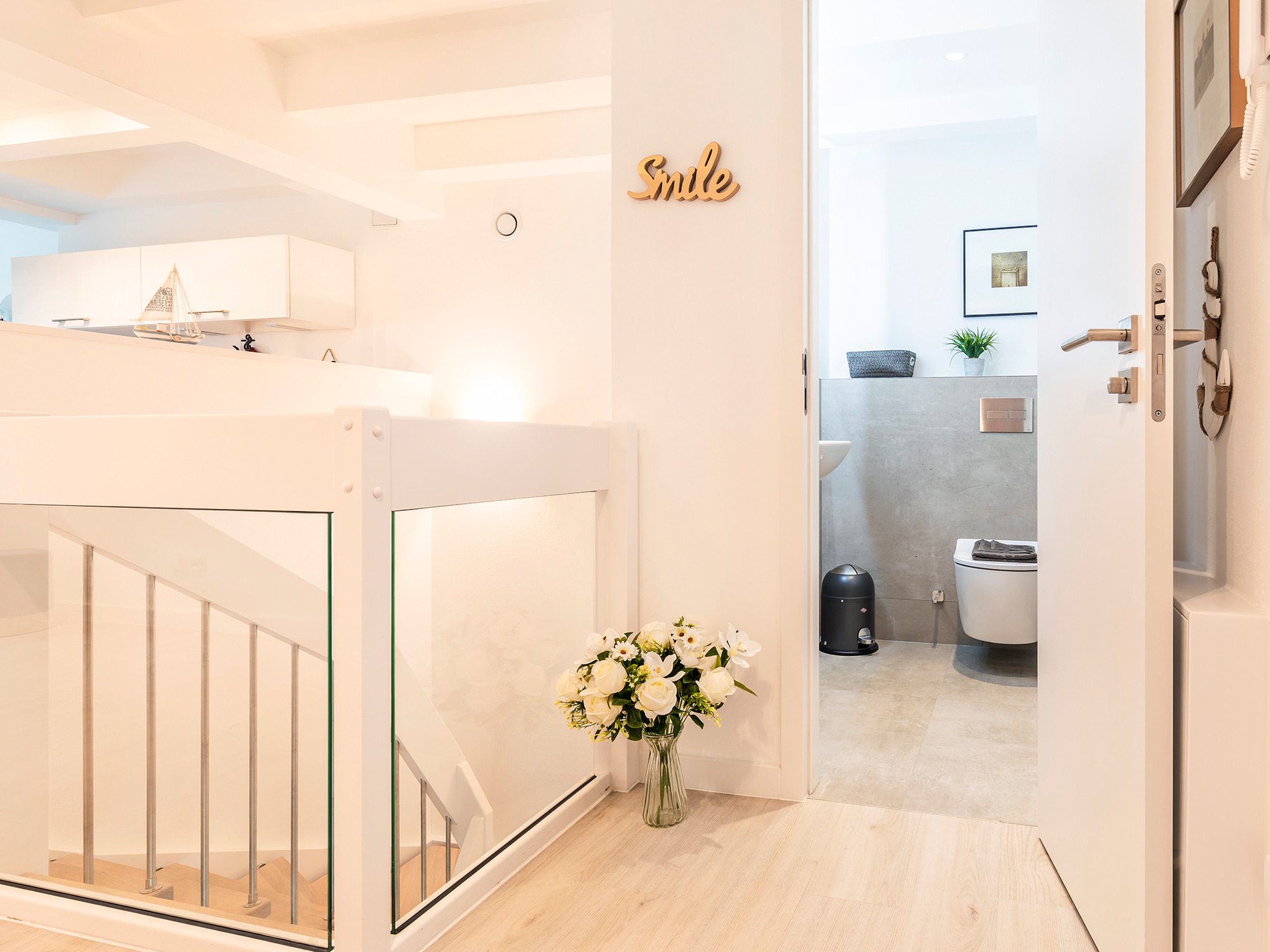Im dritten Stockwerk der Ferienwohnung befindet sich ein offener Wohn- und Kochbereich. Hier können Sie gemütliche Stunden verbringen und gemeinsam kochen und essen. Das TV-Gerät ist netflixfähig und ermöglicht es Ihnen, Ihre eigenen Netflix-Inhalte anzuschauen. Die Küche ist voll ausgestattet und verfügt über eine Kaffeemaschine mit Filter. Vom Balkon aus, der mit einem Tisch und vier Stühlen ausgestattet ist, haben Sie einen wunderschönen Blick auf das Meer. Ein Gäste-WC rundet das Angebot ab.