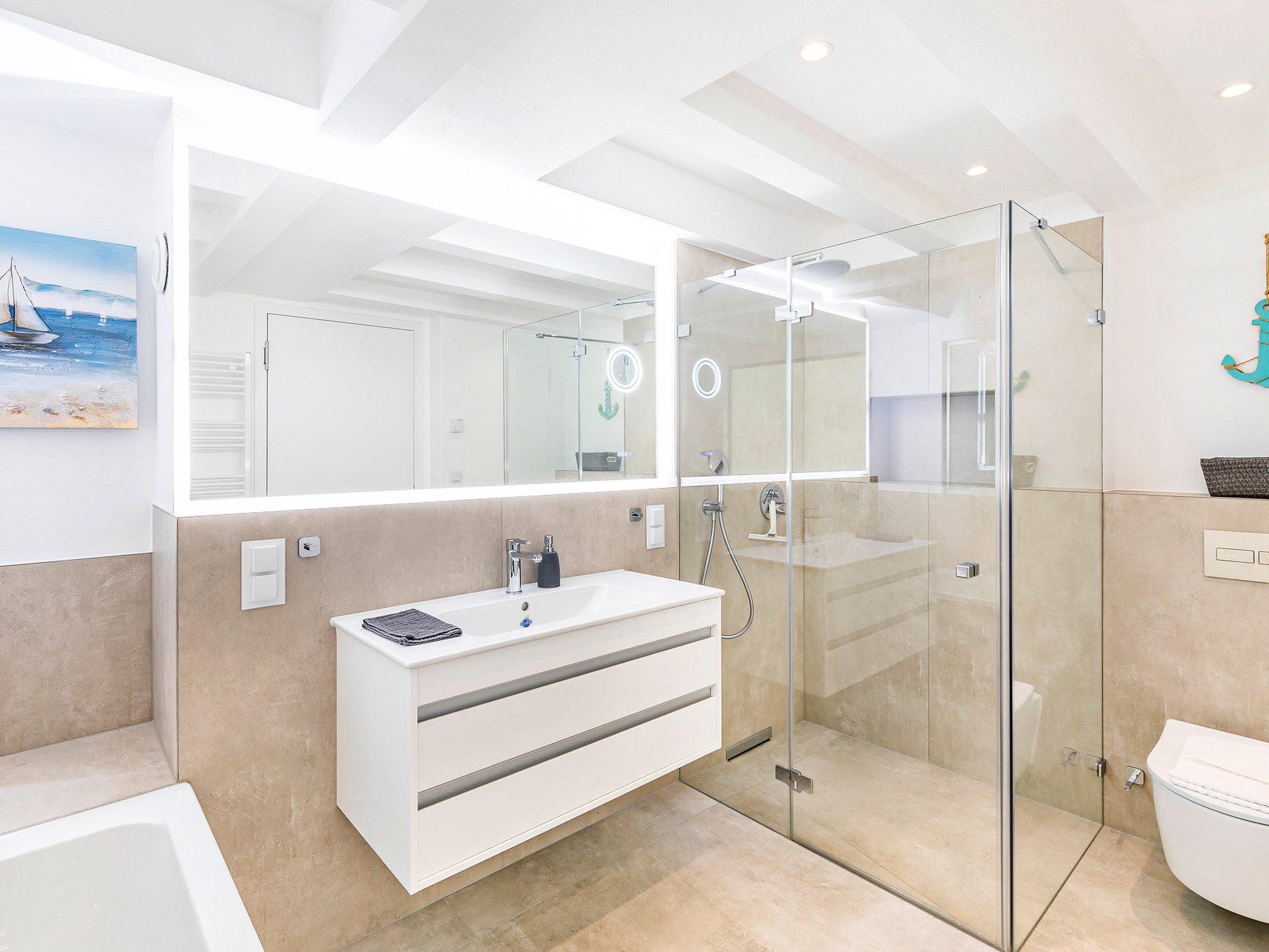 Im zweiten Stockwerk der Ferienwohnung befinden sich zwei Schlafzimmer. Beide Schlafzimmer sind mit einem Doppelbett (180x200) und einem TV ausgestattet. Vom ersten Schlafzimmer aus haben Sie zudem Zugang zum Balkon und einen atemberaubenden Blick auf das Meer. Das Badezimmer verfügt über eine Dusche und eine Badewanne. Ein Internetanschluss (WLAN) ist in der Ferienwohnung inklusive. Die Wohnung ist zudem mit einer Fußbodenheizung ausgestattet, die für eine angenehme Wärme sorgt. Ein direkter Strandzugang ermöglicht es Ihnen, schnell und bequem ans Meer zu gelangen.
