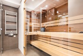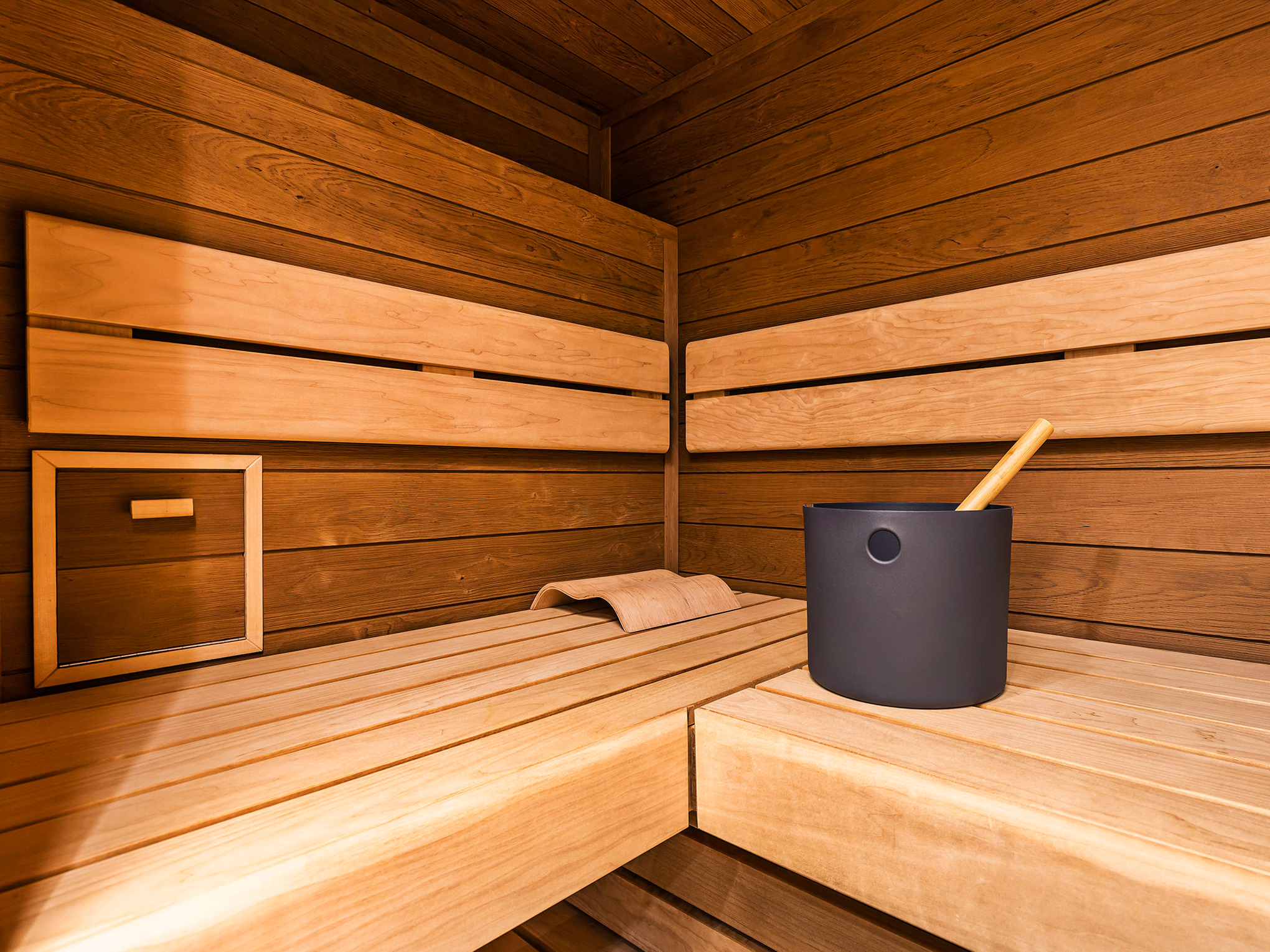 - Großes Badezimmer 1: Sauna, Regendusche, WC, Haartrockner, Sitzhocker