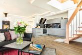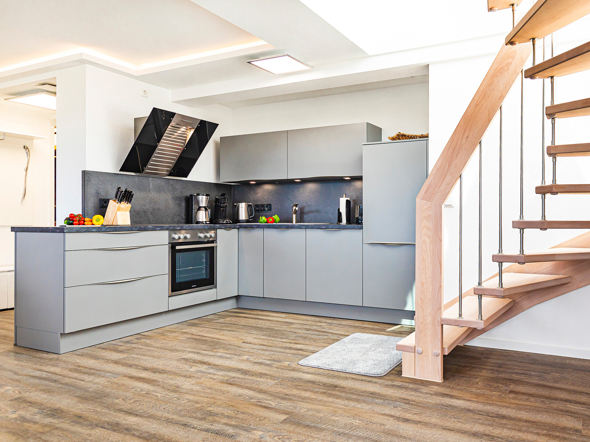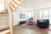 - Wohnbereich/Essbereich: Sofa, TV, Beschattungs-Plissess, Treppenaufgang zur Dachterrasse, Zugang zum Balkon