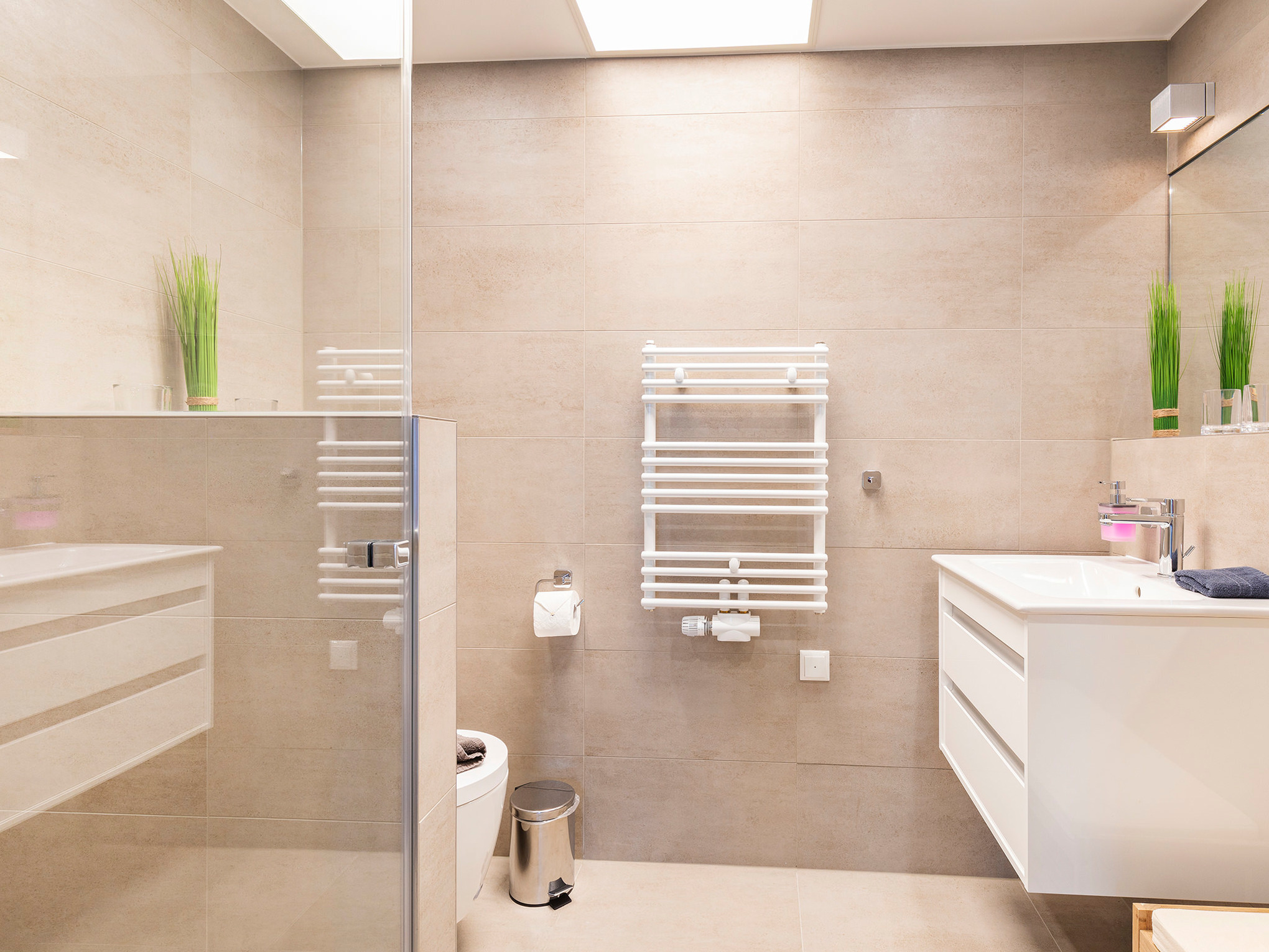 Gleich zwei moderne Badezimmer sorgen dafür, dass Sie stressfrei entspannen, saunieren und danach Ihre Regendusche genießen können. Parken können Sie vor dem Haus auf dem hauseigenen Parkplatz und gelangen mit dem Aufzug bequem in die fünfte Etage.